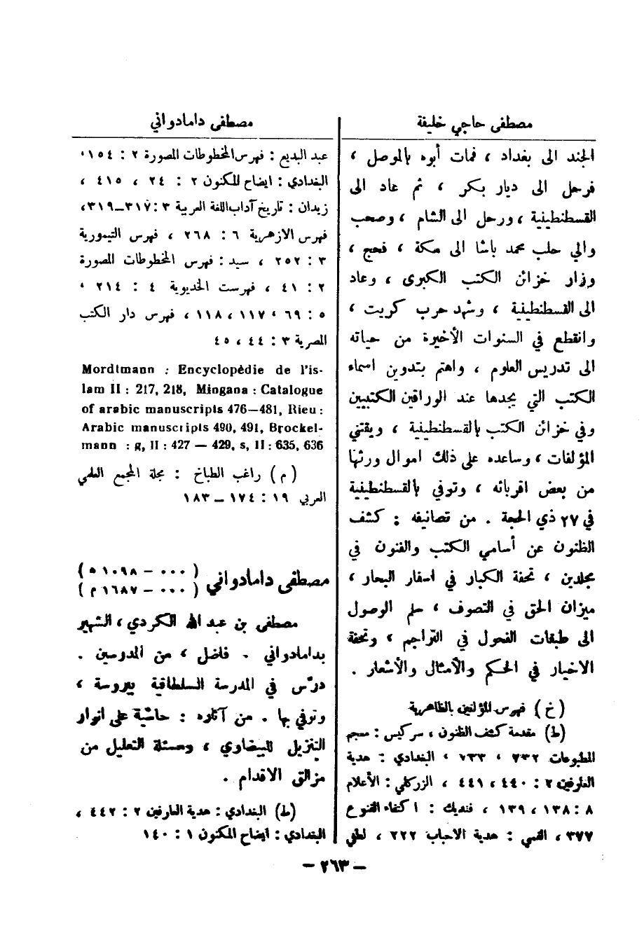 (ط) مقدمة كشف الظنون، سركيس: معجم المطبوعات 232، 733، البغدادي: هدية العارفين 2: 440، 441، الزركلي: الاعلام 8: 138، 139، فنديك: اكتفاء القنوع 377، القمي: هدية الاحباب 222، لطفي عبد البديع: فهرس المخطوطات المصورة 2: 154، البغدادي: ايضاح المكنون 2: 24، 415، زيدان: تاريخ آداب اللغة العربية 3: 317 - 319، فهرس الازهرية 6: 268، فهرس التيمورية 3: 252، سيد: فهرس المخطوطات المصورة 2: 41، فهرست الخديوية 4: 214، 5: 69، 117، 118، فهرس دار الكتب المصرية 3: 44، 45 - Mordtmann: Encyclopedie de l ' is