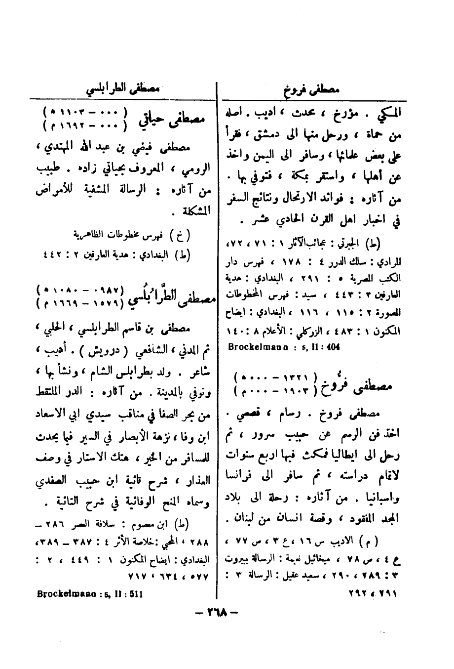 الكتب المصرية 5: 291، البغدادي: هدية العارفين 2: 443، سيد: فهرس المخطوطات المصورة 2: 115، 116، البغدادي: ايضاح المكنون 1: 483، الزركلي، الاعلام 8: 140 404: Brockelmann: s , ll مصطفى فروخ (1321 - 000 هـ) (1093 - 000 م)