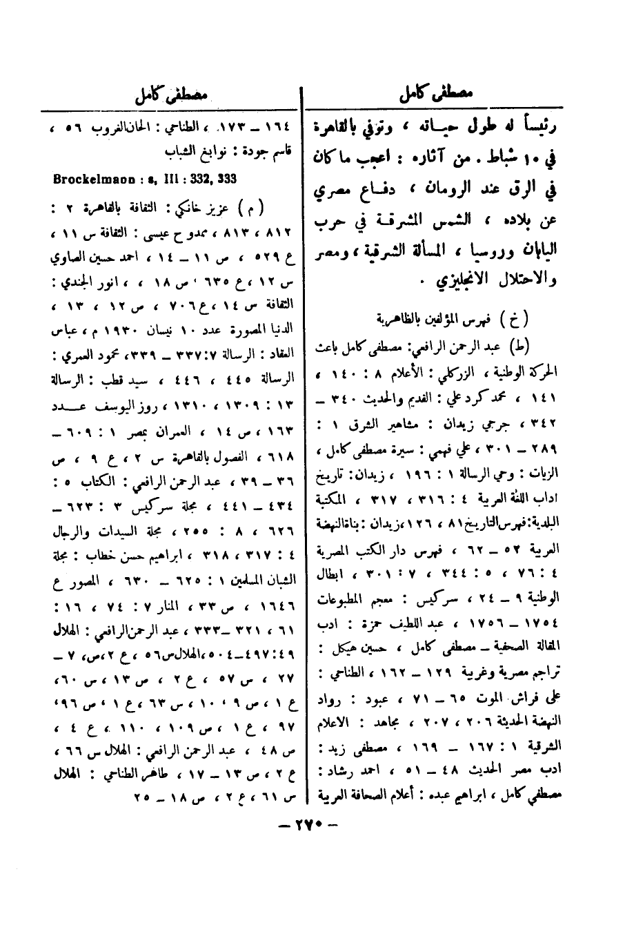 (ط) عبد الرحمن الرافعي: مصطفى كامل باعث الحركة الوطنية، الزركلي: الاعلام 8: 140، 141، محمد كرد علي: القديم والحديث 340 - 342، جرجي زيدان: مشاهير الشرق 1: 289 - 301، علي فهمي: سيرة مصطفى كامل، الزيات: وحي الرسالة 1: 196، زيدان: تاريخ اداب اللغة العربية 4: 316 - 317، المكتبة البلدية: فهرس التاريخ 81، 126، زيدان: بناة النهضة العربية 52 - 62، فهرس دار الكتب المصرية 4: 76، 5: 344، 7: 301، ابطال الوطنية 9 - 24، سركيس: معجم المطبوعات 1754 - 1756، عبد اللطيف حمزة: ادب المقالة الصحفية - مصطفى كامل - حسين هيكل: تراجم مصرية وغربية 129 - 162، الطناحي: على فراش الموت 65 - 71، عبود: رواد