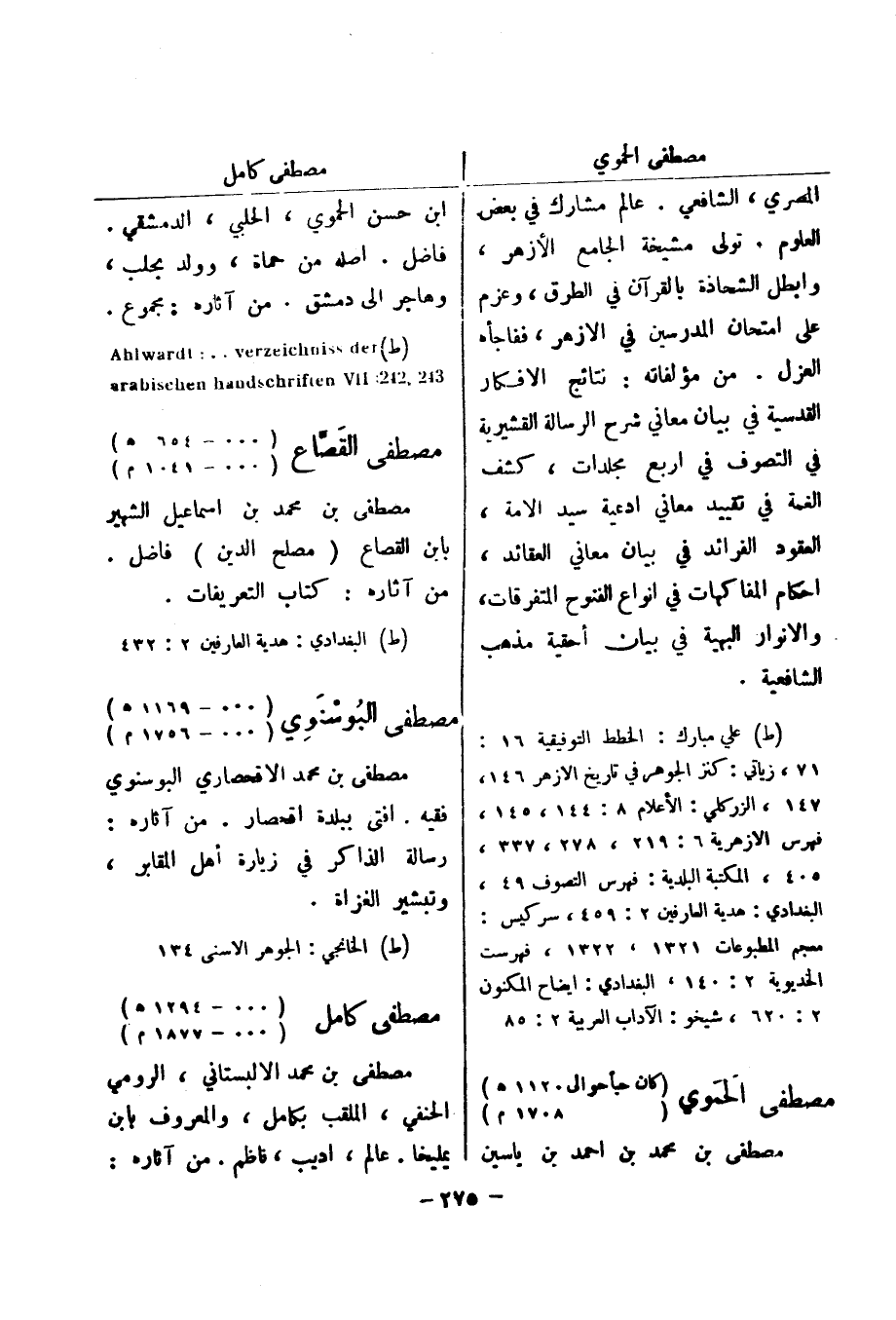 (ط) علي مبارك: الخطط التوفيقية 16: 71، زياتي: كنز الجوهر في تاريخ الازهر 146، 147، الزركلي: الاعلام 8: 144، 145، فهرس الازهرية 6: 219، 278، 337، 405، المكتبة البلدية: فهرس التصوف 49، البغدادي: هدية العارفين 2: 459، سركيس: معجم المطبوعات 1321، 1322، فهرست الخديوية: 2: 140، البغدادي: ايضاح المكنون 2: 620، شيخو: الآداب العربية 2: 85 مصطفى الحموي (كان حيا حوالى 1120 هـ) (1708 م)