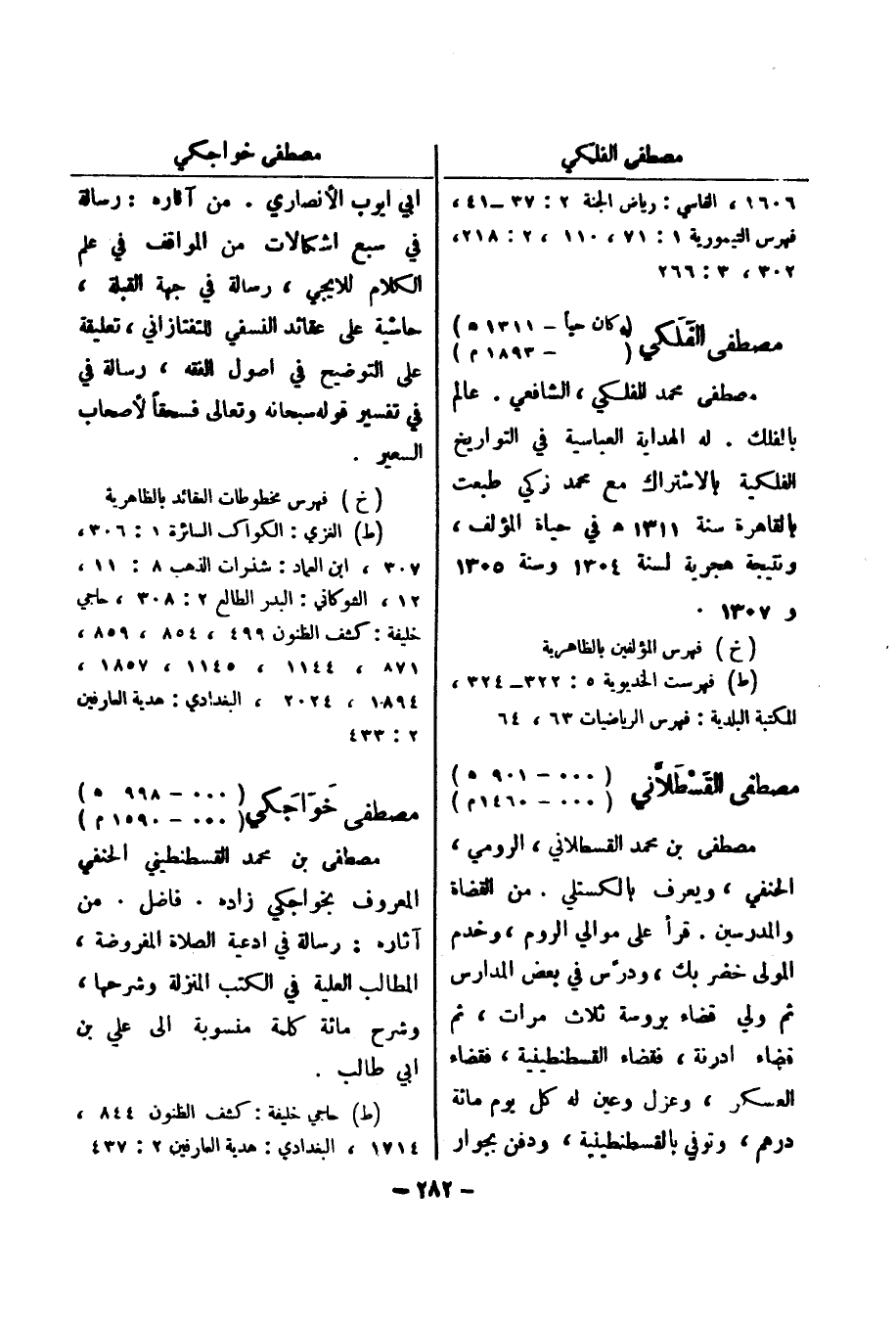 (ط) الغزي: الكواكب السائرة 1: 306، 307، ابن العماد: شذرات الذهب 8: 11، 12، الشوكاني: البدر الطالع 2: 308، حاجي خليفة: كشف الظنون 499، 854، 859، 871، 1144، 1145، 1857، 1894، 2024، البغدادي: هدية العارفين 2: 433 مصطفى خواجكي (000 - 998 هـ) (000 - 1590 م)