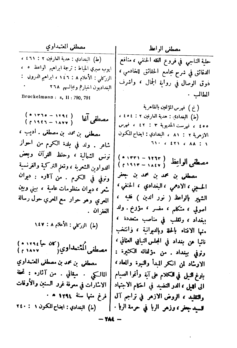 (ط) البغدادي: هدية العارفين 2: 454، 455، فهرست الخديوية 3: 42، فهرس الازهرية 2: 81، البغدادي: ايضاح المكنون 1: 88، 421، 610 مصطفى الواعظ (1263 - 1331 هـ) (1847 - 1913 م)