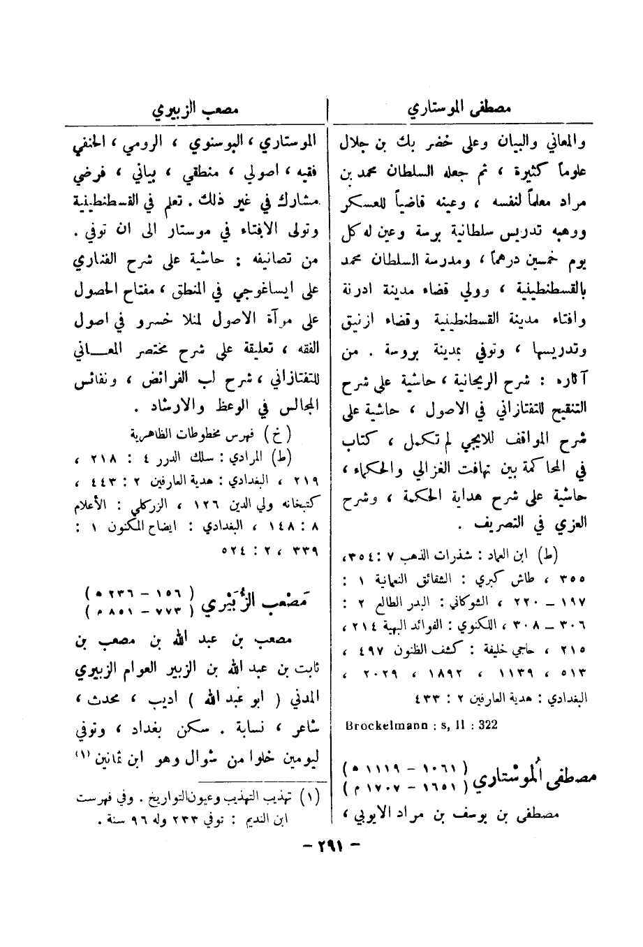 (ط) ابن العماد: شذرات الذهب 7: 354، 355، طاش كبري: الشائق النعمانية 1: 197 - 220، الشوكاني: البدر الطالع 2: 306 - 308، اللكنوي: الفوائد البهية 214، 215، حاجي خليفة: كشف الظنون 497، 513، 1139، 1892، 2029، البغدادي: هدية العارفين 2: 433 322: Brockelmann: s , ll مصطفى الموستاري (1061 - 1119 هـ) (1651 - 1707 م)