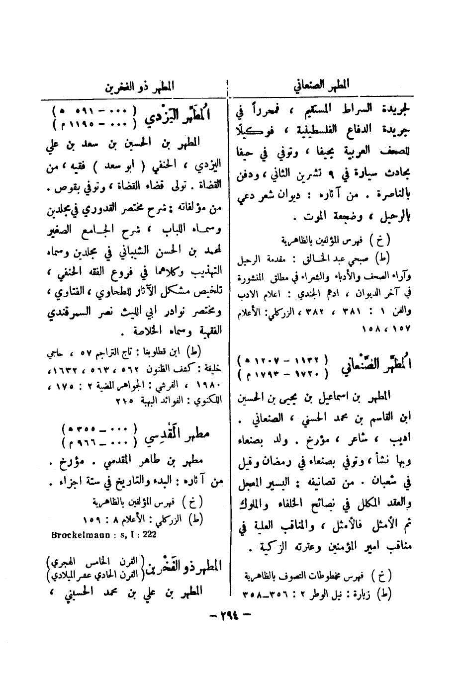 (ط) ابن قطلوبغا: تاج التراجم 57، حاجي خليفة: كشف الظنون 562، 563، 1632، 1980، القرشي: الجواهر المضية 2: 175، اللكنوي: الفوائد البهبة 215 مطهر المقدسي (000 - 355 هـ) (000 - 966 م)