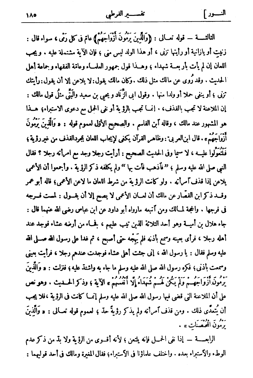 الثَّالِثَةُ- قَوْلُهُ تَعَالَى: (وَالَّذِينَ يَرْمُونَ أَزْواجَهُمْ) " عَامٌّ فِي كُلِّ رَمْيٍ، سَوَاءٌ قَالَ: زَنَيْتِ أَوْ يَا زَانِيَةُ أَوْ رَأَيْتُهَا تَزْنِي، أَوْ هَذَا الْوَلَدُ لَيْسَ مِنِّي، فَإِنَّ الْآيَةَ مُشْتَمِلَةٌ عَلَيْهِ. وَيَجِبُ اللِّعَانُ إِنْ لَمْ يَأْتِ بِأَرْبَعَةِ شُهَدَاءَ، وَهَذَا قَوْلُ جُمْهُورِ الْعُلَمَاءِ وَعَامَّةِ الْفُقَهَاءِ وَجَمَاعَةِ أَهْلِ الْحَدِيثِ. وَقَدْ رُوِيَ عَنْ مَالِكٍ مِثْلُ ذَلِكَ. وَكَانَ مَالِكٌ يَقُولُ: لَا يُلَاعِنُ إِلَّا أَنْ يَقُولَ: رَأَيْتُكِ تَزْنِي، أَوْ يَنْفِي حَمْلًا أَوْ وَلَدًا مِنْهَا. وَقَوْلُ أَبِي الزِّنَادِ وَيَحْيَى بْنِ سَعِيدٍ وَالْبَتِّيِّ مِثْلُ قَوْلِ مَالِكٍ: إِنَّ الْمُلَاعَنَةَ لَا تَجِبُ بِالْقَذْفِ وَإِنَّمَا تَجِبُ بِالرُّؤْيَةِ أَوْ نَفْيِ الْحَمْلِ مَعَ دَعْوَى الِاسْتِبْرَاءِ، هَذَا هُوَ الْمَشْهُورُ عِنْدَ مَالِكٍ، وَقَالَهُ ابْنُ الْقَاسِمِ. وَالصَّحِيحُ الْأَوَّلُ لِعُمُومِ قَوْلِهِ:" وَالَّذِينَ يَرْمُونَ أَزْواجَهُمْ". قَالَ ابْنُ الْعَرَبِيِّ: وَظَاهِرُ الْقُرْآنِ يَكْفِي لِإِيجَابِ اللِّعَانِ بِمُجَرَّدِ الْقَذْفِ مِنْ غَيْرِ رُؤْيَةٍ، فَلْتُعَوِّلُوا عَلَيْهِ، لَا سِيَّمَا وَفِي الْحَدِيثِ الصَّحِيحِ: أَرَأَيْتَ رَجُلًا وَجَدَ مَعَ امْرَأَتِهِ رَجُلًا؟ فَقَالَ النَّبِيُّ صَلَّى اللَّهُ عَلَيْهِ وَسَلَّمَ: (فَاذْهَبْ فَأْتِ بِهَا) وَلَمْ يُكَلِّفْهُ ذِكْرَ الرُّؤْيَةِ. وَأَجْمَعُوا أَنَّ الْأَعْمَى يُلَاعِنُ إِذَا قَذَفَ امْرَأَتَهُ. وَلَوْ كَانَتِ الرُّؤْيَةُ مِنْ شَرْطِ اللِّعَانِ مَا لَاعَنَ الْأَعْمَى، قَالَهُ أبو عمر وَقَدْ ذَكَرَ ابْنُ الْقَصَّارِ عَنْ مَالِكٍ أَنَّ لِعَانَ الْأَعْمَى لَا يَصِحُّ إِلَّا أَنْ يَقُولَ: لَمَسْتُ فَرْجَهُ فِي فَرْجِهَا. وَالْحُجَّةُ لِمَالِكٍ وَمَنِ اتَّبَعَهُ مَا رَوَاهُ أَبُو دَاوُدَ عَنِ ابْنِ عَبَّاسٍ رَضِيَ اللَّهُ عَنْهُمَا قَالَ: جَاءَ هِلَالُ بْنُ أُمَيَّةَ وَهُوَ أَحَدُ الثَّلَاثَةِ الَّذِينَ تِيبَ عَلَيْهِمْ، فَجَاءَ مِنْ أَرْضِهِ عِشَاءً فَوَجَدَ عِنْدَ أَهْلِهِ رَجُلًا، فَرَأَى بِعَيْنِهِ وَسَمِعَ بِأُذُنِهِ فَلَمْ يَهِجْهُ حَتَّى أَصْبَحَ، ثُمَّ غَدَا عَلَى رَسُولِ اللَّهِ صَلَّى اللَّهُ عَلَيْهِ وَسَلَّمَ فَقَالَ: يَا رَسُولَ اللَّهِ، إِنِّي جِئْتُ أَهْلِي عِشَاءً فَوَجَدْتُ عِنْدَهُمْ رَجُلًا، فَرَأَيْتُ بِعَيْنِي وَسَمِعْتُ بِأُذُنِي، فَكَرِهَ رَسُولُ اللَّهِ صَلَّى اللَّهُ عَلَيْهِ وَسَلَّمَ ما جَاءَ بِهِ وَاشْتَدَّ عَلَيْهِ، فَنَزَلَتْ:" وَالَّذِينَ يَرْمُونَ أَزْواجَهُمْ وَلَمْ يَكُنْ لَهُمْ شُهَداءُ إِلَّا أَنْفُسُهُمْ" الْآيَةَ، وَذَكَرَ الْحَدِيثَ. وَهُوَ نَصٌّ عَلَى أَنَّ الْمُلَاعَنَةَ الَّتِي قَضَى فِيهَا رَسُولُ اللَّهِ صَلَّى اللَّهُ عَلَيْهِ وَسَلَّمَ إِنَّمَا كَانَتْ فِي الرُّؤْيَةِ، فَلَا يَجِبُ أَنْ يَتَعَدَّى ذَلِكَ. وَمَنْ قَذَفَ امْرَأَتَهُ وَلَمْ يَذْكُرْ رُؤْيَةً حُدَّ، لِعُمُومِ قَوْلِهِ تَعَالَى:" وَالَّذِينَ يَرْمُونَ الْمُحْصَناتِ". الرَّابِعَةُ- إِذَا نَفَى الْحَمْلَ فَإِنَّهُ يَلْتَعِنُ، لِأَنَّهُ أَقْوَى مِنَ الرُّؤْيَةِ ولا بد من ذكر عدم الوطي وَالِاسْتِبْرَاءِ بَعْدَهُ. وَاخْتَلَفَ عُلَمَاؤُنَا فِي الِاسْتِبْرَاءِ، فَقَالَ الْمُغِيرَةُ وَمَالِكٌ فِي أَحَدِ قَوْلَيْهِمَا: