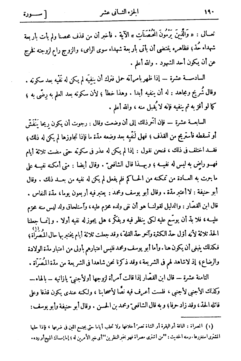تَعَالَى:" وَالَّذِينَ يَرْمُونَ الْمُحْصَناتِ" الْآيَةَ. فَأَخْبَرَ أَنَّ مَنْ قَذَفَ مُحْصَنًا وَلَمْ يَأْتِ بِأَرْبَعَةِ شُهَدَاءَ حُدَّ، فَظَاهِرُهُ يَقْتَضِي أَنْ يَأْتِيَ بِأَرْبَعَةِ شُهَدَاءَ سِوَى الرَّامِي، وَالزَّوْجُ رَامٍ لِزَوْجَتِهِ فَخَرَجَ عَنْ أَنْ يَكُونَ أَحَدَ الشُّهُودِ، وَاللَّهُ أَعْلَمُ. السَّادِسَةَ عَشْرَةَ- إِذَا ظَهَرَ بِامْرَأَتِهِ حَمْلٌ فَتَرَكَ أَنْ يَنْفِيَهُ لَمْ يَكُنْ لَهُ نَفْيُهُ بَعْدَ سُكُوتِهِ. وَقَالَ شُرَيْحٌ وَمُجَاهِدٌ: لَهُ أَنْ يَنْفِيَهُ أَبَدًا. وَهَذَا خَطَأٌ، لِأَنَّ سُكُوتَهُ بَعْدَ الْعِلْمِ بِهِ رضى بِهِ، كَمَا لَوْ أَقَرَّ بِهِ ثُمَّ يَنْفِيهِ فَإِنَّهُ لَا يُقْبَلُ مِنْهُ، وَاللَّهُ أَعْلَمُ. السَّابِعَةَ عَشْرَةَ- فَإِنْ أَخَّرَ ذَلِكَ إِلَى أَنْ وَضَعَتْ وقال: رجوت أن يكون ريحا ينفش أَوْ تُسْقِطُهُ فَأَسْتَرِيحُ مِنَ الْقَذْفِ، فَهَلْ لِنَفْيِهِ بَعْدَ وَضْعِهِ مُدَّةٌ مَا فَإِذَا تَجَاوَزَهَا لَمْ يَكُنْ لَهُ ذَلِكَ، فَقَدِ اخْتُلِفَ فِي ذَلِكَ، فَنَحْنُ نَقُولُ: إِذَا لَمْ يَكُنْ لَهُ عُذْرٌ فِي سُكُوتِهِ حَتَّى مَضَتْ ثَلَاثَةُ أَيَّامٍ فَهُوَ رَاضٍ بِهِ لَيْسَ لَهُ نَفْيُهُ، وَبِهَذَا قَالَ الشَّافِعِيُّ. وَقَالَ أَيْضًا: مَتَى أَمْكَنَهُ نَفْيُهُ عَلَى مَا جَرَتْ بِهِ الْعَادَةُ مِنْ تَمَكُّنِهِ مِنَ الْحَاكِمِ فَلَمْ يَفْعَلْ لَمْ يَكُنْ لَهُ نَفْيُهُ مِنْ بَعْدِ ذَلِكَ. وَقَالَ أَبُو حَنِيفَةَ: لَا أَعْتَبِرُ مُدَّةً. وَقَالَ أَبُو يُوسُفَ وَمُحَمَّدُ: يُعْتَبَرُ فِيهِ أَرْبَعُونَ يَوْمًا، مُدَّةُ النِّفَاسِ. قَالَ ابْنُ الْقَصَّارِ: وَالدَّلِيلُ لِقَوْلِنَا هُوَ أَنَّ نَفْيَ وَلَدِهِ مُحَرَّمٌ عَلَيْهِ، وَاسْتِلْحَاقَ وَلَدٍ لَيْسَ مِنْهُ مُحَرَّمٌ عَلَيْهِ، فَلَا بُدَّ أَنْ يُوَسَّعَ عَلَيْهِ لِكَيْ يَنْظُرَ فِيهِ وَيُفَكِّرَ، هَلْ يَجُوزُ لَهُ نَفْيُهُ أولا. وَإِنَّمَا جَعَلْنَا الْحَدَّ ثَلَاثَةً لِأَنَّهُ أَوَّلُ حَدِّ الْكَثْرَةِ وَآخِرُ حَدِّ الْقِلَّةِ، وَقَدْ جُعِلَتْ ثَلَاثَةُ أَيَّامٍ يُخْتَبَرُ بِهَا حَالُ الْمُصَرَّاةِ «١»، فَكَذَلِكَ يَنْبَغِي أَنْ يَكُونَ هُنَا. وَأَمَّا أَبُو يُوسُفَ وَمُحَمَّدٌ فَلَيْسَ اعْتِبَارُهُمْ بِأَوْلَى مِنَ اعْتِبَارِ مُدَّةِ الْوِلَادَةِ وَالرَّضَاعِ، إِذْ لَا شَاهِدَ لَهُمْ فِي الشَّرِيعَةِ، وَقَدْ ذَكَرْنَا نَحْنُ شَاهِدًا فِي الشَّرِيعَةِ مِنْ مُدَّةِ الْمُصَرَّاةِ. الثَّامِنَةَ عَشْرَةَ- قَالَ ابْنُ الْقَصَّارِ إِذَا قَالَتِ امْرَأَةٌ لِزَوْجِهَا أَوْ لِأَجْنَبِيٍّ يَا زَانِيَهْ- بِالْهَاءِ- وَكَذَلِكَ الْأَجْنَبِيُّ لِأَجْنَبِيٍّ، فَلَسْتُ أَعْرِفُ فِيهِ نَصًّا لِأَصْحَابِنَا، وَلَكِنَّهُ عِنْدِي يَكُونُ قَذْفًا وَعَلَى قَائِلِهِ الْحَدُّ، وَقَدْ زَادَ حَرْفًا، وَبِهِ قَالَ الشَّافِعِيُّ وَمُحَمَّدُ بْنُ الْحَسَنِ. وَقَالَ أَبُو حنيفة وأبو يوسف: