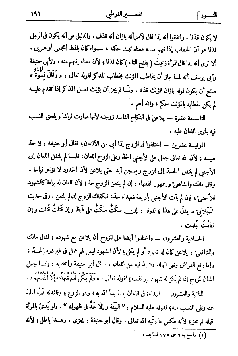 لَا يَكُونُ قَذْفًا. وَاتَّفَقُوا أَنَّهُ إِذَا قَالَ لِامْرَأَتِهِ يَا زَانٍ أَنَّهُ قَذْفٌ. وَالدَّلِيلُ عَلَى أَنَّهُ يَكُونُ فِي الرَّجُلِ قَذْفًا هُوَ أَنَّ الْخِطَابَ إِذَا فُهِمَ مِنْهُ مَعْنَاهُ ثَبَتَ حُكْمُهُ، سَوَاءٌ كَانَ بِلَفْظٍ أَعْجَمِيٍّ أَوْ عَرَبِيٍّ. أَلَا تَرَى أَنَّهُ إِذَا قَالَ لِلْمَرْأَةِ زَنَيْتَ (بِفَتْحِ التَّاءِ) كَانَ قَذْفًا، لِأَنَّ مَعْنَاهُ يُفْهَمُ مِنْهُ، وَلِأَبِي حَنِيفَةَ وَأَبِي يُوسُفَ أَنَّهُ لَمَّا جَازَ أَنْ يُخَاطَبَ الْمُؤَنَّثُ بِخِطَابِ الْمُذَكَّرِ لِقَوْلِهِ تَعَالَى:" وَقالَ نِسْوَةٌ «١» ٣٠" صَلَحَ أَنْ يَكُونَ قَوْلُهُ يَا زَانٍ لِلْمُؤَنَّثِ قَذْفًا. وَلَمَّا لَمْ يَجُزْ أَنْ يُؤَنَّثَ فِعْلُ الْمُذَكَّرِ إِذَا تَقَدَّمَ عَلَيْهِ لَمْ يَكُنْ لِخِطَابِهِ بِالْمُؤَنَّثِ حُكْمٌ، وَاللَّهُ أَعْلَمُ. التَّاسِعَةَ عَشْرَةَ- يُلَاعِنُ فِي النِّكَاحِ الْفَاسِدِ زَوْجَتَهُ لِأَنَّهَا صَارَتْ فِرَاشًا وَيَلْحَقُ النَّسَبُ فِيهِ فَجَرَى اللِّعَانُ عَلَيْهِ. الْمُوَفِّيَةُ عِشْرِينَ- اخْتَلَفُوا فِي الزَّوْجِ إِذَا أَبَى مِنْ الِالْتِعَانِ، فَقَالَ أَبُو حَنِيفَةَ: لَا حَدَّ عَلَيْهِ، لِأَنَّ اللَّهَ تَعَالَى جَعَلَ عَلَى الْأَجْنَبِيِّ الْحَدَّ وَعَلَى الزَّوْجِ اللِّعَانَ، فَلَمَّا لَمْ يَنْتَقِلِ اللِّعَانُ إِلَى الْأَجْنَبِيِّ لَمْ يَنْتَقِلِ الْحَدُّ إِلَى الزَّوْجِ وَيُسْجَنُ أَبَدًا حَتَّى يُلَاعِنَ لِأَنَّ الْحُدُودَ لَا تُؤَخَّرُ قِيَاسًا. وَقَالَ مَالِكٌ وَالشَّافِعِيُّ وَجُمْهُورُ الْفُقَهَاءِ: إِنْ لَمْ يَلْتَعِنِ الزَّوْجُ حُدَّ، لِأَنَّ اللِّعَانَ لَهُ بَرَاءَةٌ كَالشُّهُودِ لِلْأَجْنَبِيِّ، فَإِنْ لَمْ يَأْتِ الْأَجْنَبِيُّ بِأَرْبَعَةِ شُهَدَاءَ حُدَّ، فَكَذَلِكَ الزَّوْجُ إِنْ لَمْ يَلْتَعِنْ. وَفِي حَدِيثِ الْعَجْلَانِيِّ مَا يَدُلُّ عَلَى هَذَا، لِقَوْلِهِ: إِنْ سَكَتُّ سَكَتُّ عَلَى غَيْظٍ وَإِنْ قَتَلْتُ قُتِلَتُ وَإِنْ نَطَقْتُ، جُلِدْتُ. الْحَادِيَةُ وَالْعِشْرُونَ- وَاخْتَلَفُوا أَيْضًا هَلْ لِلزَّوْجِ أَنْ يُلَاعِنَ مَعَ شُهُودِهِ، فَقَالَ مَالِكٌ وَالشَّافِعِيُّ: يُلَاعِنُ كَانَ لَهُ شُهُودٌ أَوْ لَمْ يَكُنْ، لِأَنَّ الشُّهُودَ لَيْسَ لَهُمْ عَمَلٌ فِي غَيْرِ دَرْءِ الْحَدِّ، وَأَمَّا رَفْعُ الْفِرَاشِ وَنَفْيُ الْوَلَدِ فَلَا بُدَّ فِيهِ مِنَ اللِّعَانِ. وَقَالَ أَبُو حَنِيفَةَ وَأَصْحَابُهُ: إِنَّمَا جُعِلَ اللِّعَانُ لِلزَّوْجِ إِذَا لَمْ يَكُنْ لَهُ شُهُودٌ غَيْرَ نَفْسِهِ، لِقَوْلِهِ تَعَالَى:" وَلَمْ يَكُنْ لَهُمْ شُهَداءُ إِلَّا أَنْفُسُهُمْ". الثَّانِيَةُ وَالْعِشْرُونَ- الْبُدَاءَةُ فِي اللِّعَانِ بِمَا بَدَأَ اللَّهُ بِهِ، وَهُوَ الزَّوْجُ، وَفَائِدَتُهُ دَرْءُ الْحَدِّ عَنْهُ وَنَفْيُ النَّسَبِ مِنْهُ، لِقَوْلِهِ عَلَيْهِ السَّلَامُ: (الْبَيِّنَةُ وَإِلَّا حَدٌّ فِي ظَهْرِكَ). وَلَوْ بُدِئَ بِالْمَرْأَةِ قَبْلَهُ لَمْ يَجُزْ لِأَنَّهُ عَكْسُ مَا رَتَّبَهُ اللَّهُ تَعَالَى. وَقَالَ أَبُو حَنِيفَةَ: يجزى. وهذا باطل، لأنه