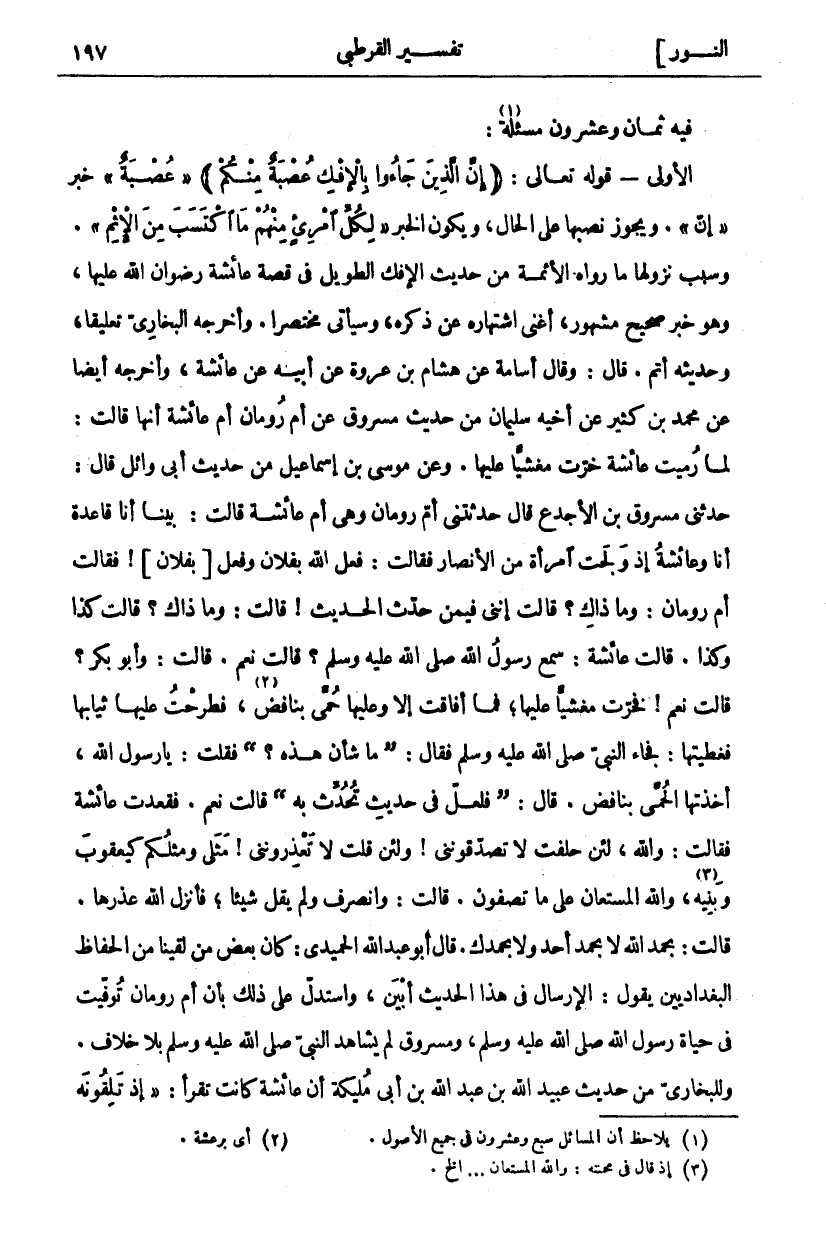 : الْأُولَى- قَوْلُهُ تَعَالَى: (إِنَّ الَّذِينَ جاؤُ بِالْإِفْكِ عُصْبَةٌ مِنْكُمْ) " عُصْبَةٌ" خَبَرُ" إِنَّ". وَيَجُوزُ نَصْبُهَا عَلَى الْحَالِ، وَيَكُونُ الْخَبَرُ" لِكُلِّ امْرِئٍ مِنْهُمْ مَا اكْتَسَبَ مِنَ الْإِثْمِ". وَسَبَبُ نُزُولِهَا مَا رَوَاهُ الْأَئِمَّةُ مِنْ حَدِيثِ الْإِفْكِ الطَّوِيلِ فِي قِصَّةِ عَائِشَةَ رِضْوَانُ اللَّهِ عَلَيْهَا، وَهُوَ خَبَرٌ صَحِيحٌ مَشْهُورٌ، أَغْنَى اشْتِهَارُهُ عَنْ ذِكْرِهِ، وَسَيَأْتِي مُخْتَصَرًا. وَأَخْرَجَهُ الْبُخَارِيُّ تَعْلِيقًا، وَحَدِيثُهُ أَتَمُّ. قَالَ: وَقَالَ أُسَامَةَ عَنْ هِشَامِ بْنِ عُرْوَةَ عَنْ أَبِيهِ عَنْ عَائِشَةَ، وَأَخْرَجَهُ أَيْضًا عَنْ مُحَمَّدِ بْنِ كَثِيرٍ عَنْ أَخِيهِ سُلَيْمَانَ مِنْ حَدِيثِ مَسْرُوقٍ عَنْ أُمِّ رُومَانَ أُمِّ عَائِشَةَ أَنَّهَا قَالَتْ: لَمَّا رُمِيَتْ عَائِشَةُ خَرَّتْ مَغْشِيًّا عَلَيْهَا. وَعَنْ مُوسَى بْنِ إِسْمَاعِيلَ مِنْ حَدِيثِ أَبِي وَائِلٍ قَالَ: حَدَّثَنِي مَسْرُوقُ بْنُ الْأَجْدَعِ قَالَ حَدَّثَتْنِي أُمُّ رُومَانَ وَهِيَ أُمُّ عَائِشَةَ قَالَتْ: بَيْنَا أَنَا قَاعِدَةٌ أَنَا وَعَائِشَةُ إِذْ وَلَجَتِ امْرَأَةٌ مِنَ الْأَنْصَارِ فَقَالَتْ: فَعَلَ اللَّهُ بفلان وفعل [بفلان] فقالت أم رومان: وما ذاك؟ قالت إننى فِيمَنْ حَدَّثَ الْحَدِيثَ! قَالَتْ: وَمَا ذَاكَ؟ قَالَتْ كَذَا وَكَذَا. قَالَتْ عَائِشَةُ: سَمِعَ رَسُولَ اللَّهِ صَلَّى اللَّهُ عَلَيْهِ وَسَلَّمَ؟ قَالَتْ نَعَمْ. قَالَتْ: وَأَبُو بَكْرٍ؟ قَالَتْ نَعَمْ! فَخَرَّتْ مَغْشِيًّا عَلَيْهَا، فَمَا أَفَاقَتْ إِلَّا وَعَلَيْهَا حُمَّى بِنَافِضٍ «٢» فَطَرَحْتُ عَلَيْهَا ثِيَابَهَا فَغَطَّيْتُهَا: فَجَاءَ النَّبِيُّ صَلَّى اللَّهُ عَلَيْهِ وَسَلَّمَ فَقَالَ: (مَا شَأْنُ هَذِهِ؟) فَقُلْتُ: يَا رَسُولَ اللَّهِ، أَخَذَتْهَا الْحُمَّى بِنَافِضٍ. قَالَ: (فَلَعَلَّ فِي حَدِيثٍ تُحُدِّثَ بِهِ) قَالَتْ نَعَمْ. فَقَعَدَتْ عَائِشَةُ فَقَالَتْ: وَاللَّهِ، لَئِنْ حَلَفْتُ لَا تصدقونني! ولين قلت لا تعذروننى! مَثَلِي وَمَثَلُكُمْ كَيَعْقُوبَ وَبَنِيهِ «٣»، وَاللَّهُ الْمُسْتَعَانُ عَلَى مَا تَصِفُونَ. قَالَتْ: وَانْصَرَفَ وَلَمْ يَقُلْ شَيْئًا فَأَنْزَلَ اللَّهُ عُذْرَهَا. قَالَتْ: بِحَمْدِ اللَّهِ لَا بِحَمْدِ أَحَدٍ وَلَا بِحَمْدِكَ. قَالَ أَبُو عَبْدِ اللَّهِ الْحُمَيْدِيُّ: كَانَ بَعْضُ مَنْ لَقِينَا مِنَ الْحُفَّاظِ الْبَغْدَادِيِّينَ يَقُولُ: الْإِرْسَالُ فِي هَذَا الْحَدِيثِ أَبْيَنُ، وَاسْتُدِلَّ عَلَى ذَلِكَ بِأَنَّ أُمَّ رُومَانَ تُوُفِّيَتْ فِي حَيَاةِ رَسُولِ اللَّهِ صَلَّى اللَّهُ عَلَيْهِ وَسَلَّمَ، وَمَسْرُوقٌ لَمْ يُشَاهِدِ النَّبِيَّ صَلَّى اللَّهُ عَلَيْهِ وَسَلَّمَ بِلَا خِلَافٍ. وَلِلْبُخَارِيِّ مِنْ حديت عُبَيْدِ اللَّهِ بْنِ عَبْدِ اللَّهِ بْنِ أَبِي مُلَيْكَةَ أَنَّ عَائِشَةَ كَانَتْ تَقْرَأُ:" إِذْ تَلَقَّوْنَهُ