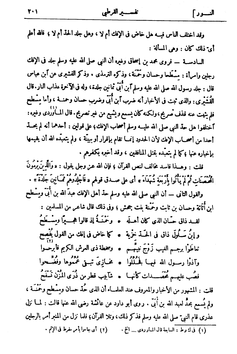 وَقَدِ اخْتَلَفَ النَّاسُ فِيهِ هَلْ خَاضَ فِي الْإِفْكِ أَمْ لَا، وَهَلْ جُلِدَ الْحَدَّ أَمْ لَا، فَاللَّهُ أَعْلَمُ أَيُّ ذَلِكَ كَانَ: وَهِيَ المسألة: السَّادِسَةُ- فَرَوَى مُحَمَّدُ بْنُ إِسْحَاقَ وَغَيْرُهُ أَنَّ النَّبِيَّ صَلَّى اللَّهُ عَلَيْهِ وَسَلَّمَ جَلَدَ فِي الْإِفْكِ رَجُلَيْنِ وَامْرَأَةً: مِسْطَحًا وَحَسَّانَ وَحَمْنَةَ، وَذَكَرَهُ التِّرْمِذِيُّ وَذَكَرَ الْقُشَيْرِيُّ عَنِ ابْنِ عَبَّاسٍ قَالَ: جَلَدَ رَسُولُ اللَّهِ صَلَّى اللَّهُ عَلَيْهِ وَسَلَّمَ ابْنَ أُبَيٍّ ثَمَانِينَ جَلْدَةً، وَلَهُ فِي الْآخِرَةِ عَذَابُ النَّارِ. قَالَ الْقُشَيْرِيُّ: وَالَّذِي ثَبَتَ فِي الْأَخْبَارِ أَنَّهُ ضَرَبَ ابْنَ أُبَيٍّ وَضَرَبَ حَسَّانَ وَحَمْنَةَ، وَأَمَّا مِسْطَحٌ فَلَمْ يَثْبُتْ عَنْهُ قَذْفٌ صَرِيحٌ، وَلَكِنَّهُ كَانَ يَسْمَعُ وَيُشِيعُ مِنْ غَيْرِ تَصْرِيحٍ. قَالَ الْمَاوَرْدِيُّ «١» وَغَيْرُهُ: اخْتَلَفُوا هَلْ حَدَّ النَّبِيُّ صَلَّى اللَّهُ عَلَيْهِ وَسَلَّمَ أَصْحَابَ الْإِفْكِ، عَلَى قَوْلَيْنِ: أَحَدُهُمَا أَنَّهُ لَمْ يَحُدَّ أَحَدًا مِنْ أَصْحَابِ الْإِفْكِ لِأَنَّ الْحُدُودَ إِنَّمَا تُقَامُ بِإِقْرَارٍ أَوْ بِبَيِّنَةٍ، وَلَمْ يَتَعَبَّدْهُ اللَّهُ أَنْ يُقِيمَهَا بِإِخْبَارِهِ عَنْهَا، كَمَا لَمْ يَتَعَبَّدْهُ بِقَتْلِ الْمُنَافِقِينَ، وَقَدْ أَخْبَرَهُ بِكُفْرِهِمْ. قُلْتُ: وَهَذَا فَاسِدٌ مُخَالِفٌ لِنَصِّ الْقُرْآنِ، فَإِنَّ اللَّهَ عَزَّ وَجَلَّ يَقُولُ:" وَالَّذِينَ يَرْمُونَ الْمُحْصَناتِ ثُمَّ لَمْ يَأْتُوا بِأَرْبَعَةِ شُهَداءَ" أَيْ عَلَى صِدْقِ قَوْلِهِمْ:" فَاجْلِدُوهُمْ ثَمانِينَ جَلْدَةً". وَالْقَوْلُ الثَّانِي- أَنَّ النَّبِيَّ صَلَّى اللَّهُ عَلَيْهِ وَسَلَّمَ حَدَّ أَهْلَ الْإِفْكِ عَبْدَ الله بن أبى ومسطح ابن أُثَاثَةَ وَحَسَّانَ بْنَ ثَابِتٍ وَحَمْنَةَ بِنْتَ جَحْشٍ، وَفِي ذَلِكَ قَالَ شَاعِرٌ مِنَ الْمُسْلِمِينَ: