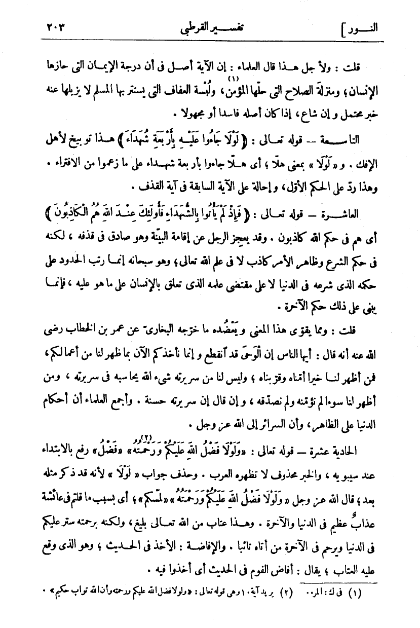 التَّاسِعَةُ- قَوْلُهُ تَعَالَى: (لَوْلا جاؤُ عَلَيْهِ بِأَرْبَعَةِ شُهَداءَ) هَذَا تَوْبِيخٌ لِأَهْلِ الْإِفْكِ. و" لَوْلا" بِمَعْنَى هَلَّا، أَيْ هَلَّا جَاءُوا بِأَرْبَعَةِ شُهَدَاءَ عَلَى مَا زَعَمُوا مِنَ الِافْتِرَاءِ. وَهَذَا رَدٌّ عَلَى الْحُكْمِ الْأَوَّلِ، وَإِحَالَةٌ عَلَى الْآيَةِ السَّابِقَةِ فِي آيَةِ الْقَذْفِ. الْعَاشِرَةُ- قَوْلُهُ تَعَالَى: (فَإِذْ لَمْ يَأْتُوا بِالشُّهَداءِ فَأُولئِكَ عِنْدَ اللَّهِ هُمُ الْكاذِبُونَ) أَيْ هُمْ فِي حُكْمِ اللَّهِ كَاذِبُونَ. وَقَدْ يَعْجَزُ الرَّجُلُ عَنْ إِقَامَةِ الْبَيِّنَةِ وَهُوَ صَادِقٌ فِي قَذْفِهِ، وَلَكِنَّهُ فِي حُكْمِ الشَّرْعِ وَظَاهِرِ الْأَمْرِ كَاذِبٌ لَا فِي عِلْمِ اللَّهِ تَعَالَى، وَهُوَ سُبْحَانُهُ إِنَّمَا رَتَّبَ الْحُدُودَ عَلَى حُكْمِهِ الَّذِي شَرَعَهُ فِي الدُّنْيَا لَا عَلَى مُقْتَضَى عِلْمِهِ الَّذِي تَعَلَّقَ بِالْإِنْسَانِ عَلَى مَا هُوَ عَلَيْهِ، فَإِنَّمَا يُبْنَى عَلَى ذَلِكَ حُكْمُ الْآخِرَةِ. قُلْتُ: وَمِمَّا يُقَوِّي هَذَا الْمَعْنَى وَيُعَضِّدُهُ مَا خَرَّجَهُ الْبُخَارِيُّ عَنْ عُمَرَ بْنِ الْخَطَّابِ رَضِيَ اللَّهُ عَنْهُ أَنَّهُ قَالَ: أَيُّهَا النَّاسُ إِنَّ الْوَحْيَ قَدِ انْقَطَعَ وَإِنَّمَا نَأْخُذُكُمُ الْآنَ بِمَا ظَهَرَ لَنَا مِنْ أَعْمَالِكُمْ، فَمَنْ أَظْهَرَ لَنَا خَيْرًا أَمَّنَّاهُ وَقَرَّبْنَاهُ، وَلَيْسَ لَنَا مِنْ سريرته شي اللَّهُ يُحَاسِبُهُ فِي سَرِيرَتِهِ، وَمَنْ أَظْهَرَ لَنَا سُوءًا لَمْ نُؤَمِّنْهُ وَلَمْ نُصَدِّقْهُ، وَإِنْ قَالَ إِنَّ سَرِيرَتَهُ حَسَنَةٌ. وَأَجْمَعَ الْعُلَمَاءُ أَنَّ أَحْكَامَ الدُّنْيَا عَلَى الظَّاهِرِ، وَأَنَّ السَّرَائِرَ إِلَى اللَّهِ عز وجل. الحادية عشرة- قوله تعالى: (وَلَوْلا فَضْلُ اللَّهِ عَلَيْكُمْ وَرَحْمَتُهُ) «٢» " فَضْلُ" رُفِعَ بِالِابْتِدَاءِ عِنْدَ سِيبَوَيْهِ، وَالْخَبَرُ مَحْذُوفٌ لَا تُظْهِرُهُ الْعَرَبُ. وحذف جواب" لَوْلا" لِأَنَّهُ قَدْ ذُكِرَ مِثْلُهُ بَعْدُ، قَالَ اللَّهُ عز وجل" وَلَوْلا فَضْلُ اللَّهِ عَلَيْكُمْ وَرَحْمَتُهُ"" لَمَسَّكُمْ" أَيْ بِسَبَبِ مَا قُلْتُمْ فِي عَائِشَةَ عَذَابٌ عَظِيمٌ فِي الدُّنْيَا وَالْآخِرَةِ. وَهَذَا عِتَابٌ مِنَ اللَّهِ تَعَالَى بَلِيغٌ، وَلَكِنَّهُ بِرَحْمَتِهِ سَتَرَ عَلَيْكُمْ فِي الدُّنْيَا وَيَرْحَمُ فِي الْآخِرَةِ مَنْ أَتَاهُ تَائِبًا وَالْإِفَاضَةُ: الْأَخْذُ فِي الْحَدِيثِ، وَهُوَ الَّذِي وَقَعَ عَلَيْهِ الْعِتَابُ، يُقَالُ: أَفَاضَ الْقَوْمُ فِي الْحَدِيثِ أَيْ أخذوا فيه.