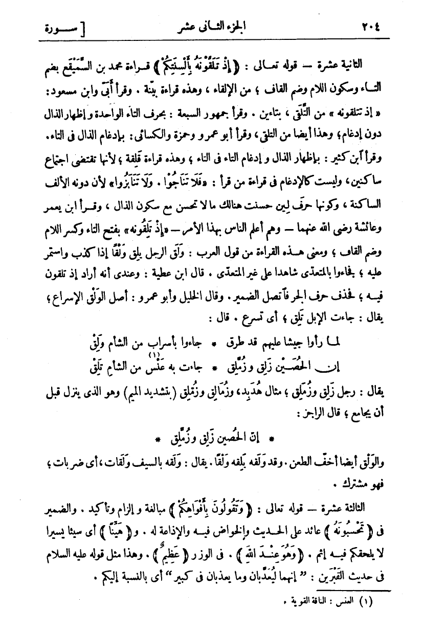 الثَّانِيَةَ عَشْرَةَ- قَوْلُهُ تَعَالَى: (إِذْ تَلَقَّوْنَهُ بِأَلْسِنَتِكُمْ) قِرَاءَةُ مُحَمَّدِ بْنِ السَّمَيْقَعِ بِضَمِّ التَّاءِ وَسُكُونِ اللَّامِ وَضَمِّ الْقَافِ، مِنَ الْإِلْقَاءِ، وَهَذِهِ قِرَاءَةٌ بَيِّنَةٌ. وَقَرَأَ أُبَيٌّ وَابْنُ مَسْعُودٍ:" إِذْ تَتَلَقَّوْنَهُ" مِنَ التَّلَقِّي، بِتَاءَيْنِ. وَقَرَأَ جُمْهُورُ السَّبْعَةِ: بِحَرْفِ التَّاءِ الْوَاحِدَةِ وَإِظْهَارِ الذَّالِ دُونَ إِدْغَامٍ، وَهَذَا أَيْضًا مِنَ التَّلَقِّي. وَقَرَأَ أَبُو عَمْرٍو وَحَمْزَةُ وَالْكِسَائِيُّ: بِإِدْغَامِ الذَّالِ فِي التَّاءِ. وَقَرَأَ ابْنُ كَثِيرٍ: بِإِظْهَارِ الذَّالِ وَإِدْغَامِ التَّاءِ فِي التَّاءِ، وَهَذِهِ قِرَاءَةٌ قَلِقَةٌ، لِأَنَّهَا تَقْتَضِي اجْتِمَاعَ سَاكِنَيْنِ، وَلَيْسَتْ كَالْإِدْغَامِ فِي قِرَاءَةِ مَنْ قَرَأَ:" فَلَا تَنَاجَوْا. وَلَا تَنَابَزُوا" لِأَنَّ دُونَهُ الْأَلِفَ السَّاكِنَةَ، وَكَوْنُهَا حَرْفَ لِينٍ حَسُنَتْ هُنَالِكَ مَا لَا تَحْسُنُ مَعَ سُكُونِ الذَّالِ. وَقَرَأَ ابْنُ يَعْمُرَ وَعَائِشَةُ رَضِيَ اللَّهُ عَنْهُمَا- وَهُمْ أَعْلَمُ النَّاسِ بِهَذَا الْأَمْرِ-" إِذْ تَلَقَّوْنَهُ" بِفَتْحِ التَّاءِ وَكَسْرِ اللَّامِ وَضَمِّ الْقَافِ، وَمَعْنَى هَذِهِ الْقِرَاءَةِ مِنْ قَوْلِ الْعَرَبِ: وَلَقَ الرَّجُلُ يَلِقُ وَلْقًا إِذَا كَذَبَ وَاسْتَمَرَّ عَلَيْهِ، فَجَاءُوا بِالْمُتَعَدِّي شَاهِدًا عَلَى غَيْرِ الْمُتَعَدِّي. قَالَ ابْنُ عَطِيَّةَ: وَعِنْدِي أَنَّهُ أَرَادَ إِذْ تَلِقُونَ فِيهِ، فَحُذِفَ حَرْفُ الْجَرِّ فَاتَّصَلَ الضَّمِيرُ. وَقَالَ الْخَلِيلُ وَأَبُو عَمْرٍو: أَصْلُ الْوَلْقِ الْإِسْرَاعُ، يُقَالُ: جَاءَتِ الْإِبِلُ تَلِقُ، أَيْ تُسْرِعُ. قَالَ: