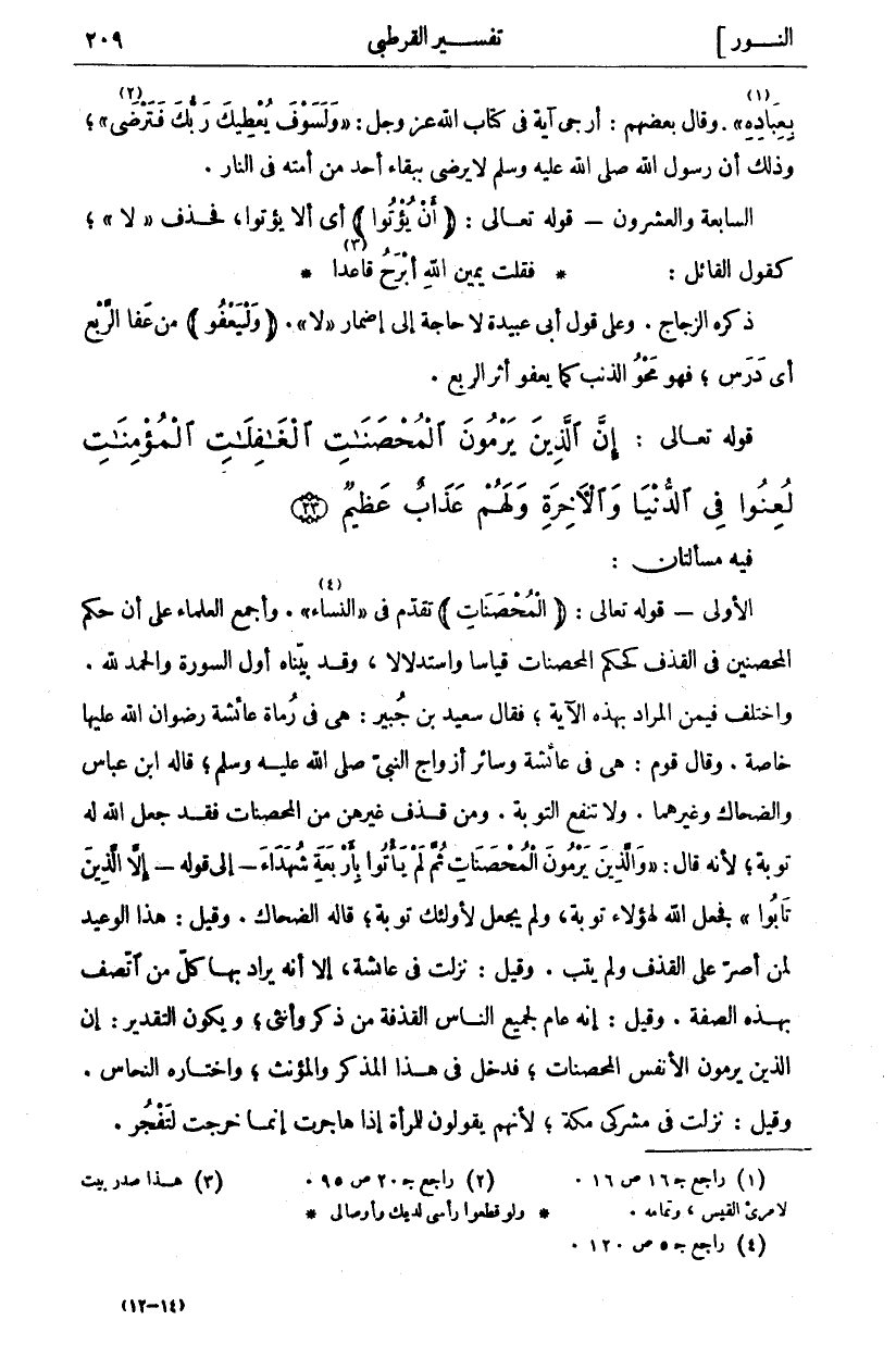 فِيهِ مَسْأَلَتَانِ: الْأُولَى- قَوْلُهُ تَعَالَى: (الْمُحْصَناتِ) تَقَدَّمَ فِي" النِّسَاءِ" «٤». وَأَجْمَعَ الْعُلَمَاءُ عَلَى أَنَّ حُكْمَ الْمُحْصَنِينَ فِي الْقَذْفِ كَحُكْمِ الْمُحْصَنَاتِ قِيَاسًا وَاسْتِدْلَالًا، وَقَدْ بَيَّنَّاهُ أَوَّلَ السُّورَةِ وَالْحَمْدُ لِلَّهِ. وَاخْتُلِفَ فِيمَنِ الْمُرَادُ بِهَذِهِ الْآيَةِ، فَقَالَ سَعِيدُ بْنُ جُبَيْرٍ: هِيَ فِي رُمَاةِ عَائِشَةَ رِضْوَانُ اللَّهِ عَلَيْهَا خَاصَّةً. وَقَالَ قَوْمٌ: هِيَ فِي عَائِشَةَ وَسَائِرِ أَزْوَاجِ النَّبِيِّ صَلَّى اللَّهُ عَلَيْهِ وَسَلَّمَ، قَالَهُ ابْنُ عَبَّاسٍ وَالضَّحَّاكُ وَغَيْرُهُمَا. وَلَا تَنْفَعُ التَّوْبَةُ. وَمَنْ قَذَفَ غَيْرَهُنَّ مِنَ الْمُحْصَنَاتِ فَقَدْ جَعَلَ اللَّهُ لَهُ تَوْبَةً، لِأَنَّهُ قَالَ:" وَالَّذِينَ يَرْمُونَ الْمُحْصَناتِ ثُمَّ لَمْ يَأْتُوا بِأَرْبَعَةِ شُهَداءَ"- إِلَى قَوْلِهِ-" إِلَّا الَّذِينَ تابُوا ١٦٠" فَجَعَلَ اللَّهُ لِهَؤُلَاءِ تَوْبَةً، وَلَمْ يَجْعَلْ لِأُولَئِكَ تَوْبَةً، قَالَهُ الضَّحَّاكُ. وَقِيلَ: هَذَا الْوَعِيدُ لِمَنْ أَصَرَّ عَلَى الْقَذْفِ وَلَمْ يَتُبْ. وَقِيلَ: نَزَلَتْ فِي عَائِشَةَ، إِلَّا أَنَّهُ يُرَادُ بِهَا كُلُّ مَنِ اتَّصَفَ بِهَذِهِ الصِّفَةِ. وَقِيلَ: إِنَّهُ عَامٌّ لِجَمِيعِ النَّاسِ الْقَذَفَةِ مِنْ ذَكَرٍ وَأُنْثَى، وَيَكُونُ التَّقْدِيرُ: إِنَّ الَّذِينَ يَرْمُونَ الْأَنْفُسَ الْمُحْصَنَاتِ، فَدَخَلَ فِي هَذَا الْمُذَكَّرُ وَالْمُؤَنَّثُ، وَاخْتَارَهُ النَّحَّاسُ. وَقِيلَ: نَزَلَتْ فِي مُشْرِكِي مَكَّةَ، لِأَنَّهُمْ يَقُولُونَ لِلْمَرْأَةِ إِذَا هَاجَرَتْ إِنَّمَا خرجت لتفجر.