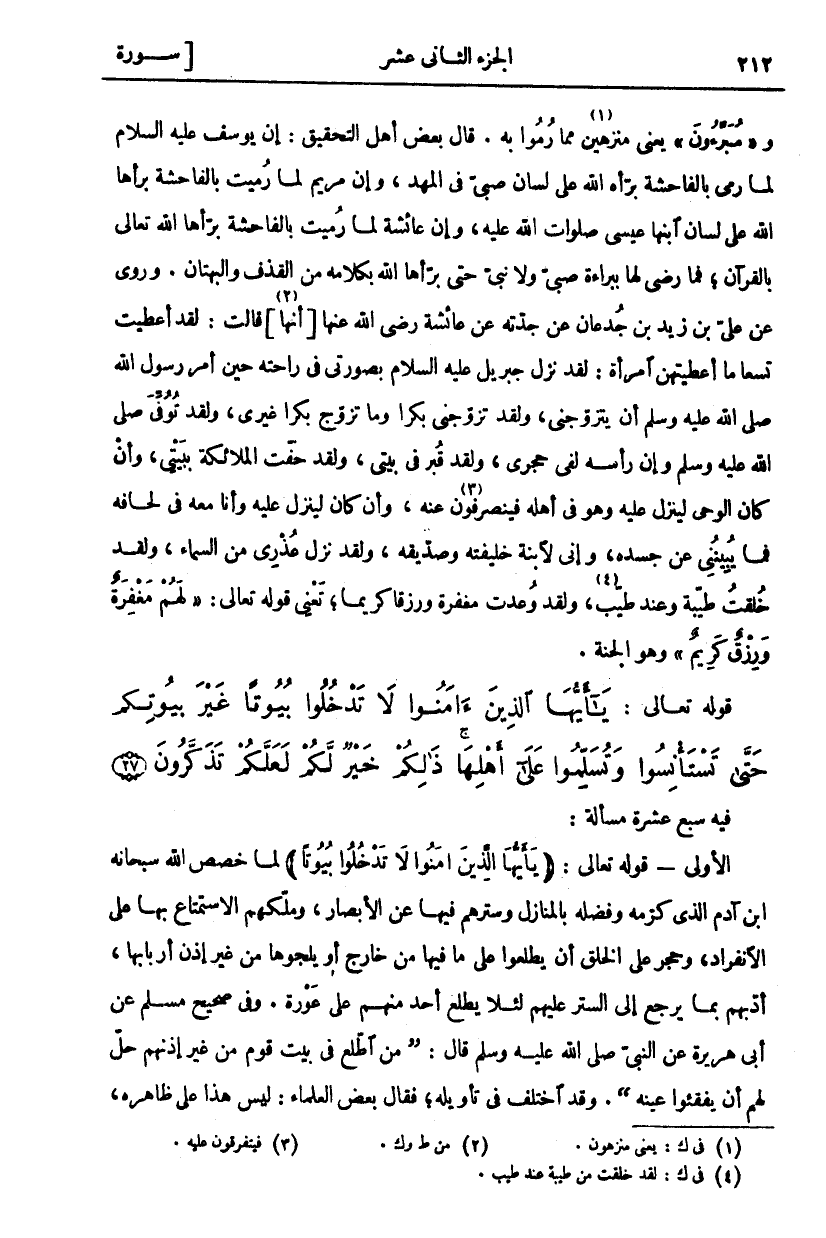 فِيهِ سَبْعَ عَشْرَةَ مَسْأَلَةً: الْأُولَى- قَوْلُهُ تَعَالَى: (يَا أَيُّهَا الَّذِينَ آمَنُوا لَا تَدْخُلُوا بُيُوتاً) لَمَّا خَصَّصَ اللَّهُ سُبْحَانَهُ ابْنَ آدَمَ الَّذِي كَرَّمَهُ وَفَضَّلَهُ بِالْمَنَازِلِ وَسَتَرَهُمْ فِيهَا عَنِ الْأَبْصَارِ، وَمَلَّكَهُمْ الِاسْتِمْتَاعَ بِهَا عَلَى الِانْفِرَادِ، وَحَجَرَ عَلَى الْخَلْقِ أَنْ يَطَّلِعُوا عَلَى مَا فِيهَا مِنْ خَارِجٍ أَوْ يَلِجُوهَا مِنْ غَيْرِ إِذْنِ أَرْبَابِهَا، أَدَّبَهُمْ بِمَا يَرْجِعُ إِلَى السِّتْرِ عَلَيْهِمْ لِئَلَّا يَطَّلِعَ أَحَدٌ مِنْهُمْ عَلَى عَوْرَةٍ. وَفِي صَحِيحِ مُسْلِمٍ عَنْ أَبِي هُرَيْرَةَ عَنِ النَّبِيِّ صَلَّى اللَّهُ عَلَيْهِ وَسَلَّمَ قَالَ: (مَنِ اطَّلَعَ فِي بَيْتِ قَوْمٍ مِنْ غَيْرِ إِذْنِهِمْ حَلَّ لَهُمْ أَنْ يَفْقَئُوا عَيْنَهُ). وَقَدِ اخْتُلِفَ فِي تَأْوِيلِهِ، فَقَالَ بَعْضُ العلماء: ليس هذا على ظاهره،