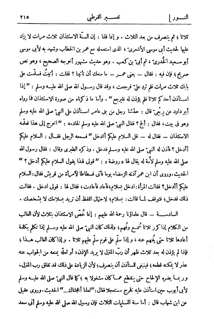 ثَلَاثًا، ثُمَّ يَنْصَرِفُ مِنْ بَعْدِ الثَّلَاثِ. وَإِنَّمَا قُلْنَا: إِنَّ السُّنَّةَ الِاسْتِئْذَانُ ثَلَاثَ مَرَّاتٍ لَا يُزَادُ عَلَيْهَا لِحَدِيثِ أَبِي مُوسَى الْأَشْعَرِيِّ، الَّذِي اسْتَعْمَلَهُ مَعَ عُمَرَ بْنِ الْخَطَّابِ وَشَهِدَ بِهِ لِأَبِي مُوسَى أَبُو سَعِيدٍ الْخُدْرِيُّ، ثُمَّ أُبَيُّ بْنُ كَعْبٍ. وَهُوَ حَدِيثٌ مَشْهُورٌ أَخْرَجَهُ الصَّحِيحُ، وَهُوَ نَصٌّ صَرِيحٌ، فَإِنَّ فِيهِ: فَقَالَ- يَعْنِي عُمَرَ- مَا مَنَعَكَ أَنْ تَأْتِيَنَا؟ فَقُلْتُ: أَتَيْتُ فَسَلَّمْتُ عَلَى بَابِكَ ثَلَاثَ مَرَّاتٍ فَلَمْ تَرُدَّ عَلَيَّ فَرَجَعْتُ، وَقَدْ قَالَ رَسُولُ اللَّهِ صَلَّى اللَّهُ عَلَيْهِ وَسَلَّمَ: (إِذَا اسْتَأْذَنَ أَحَدُكُمْ ثَلَاثًا فَلَمْ يُؤْذَنْ لَهُ فَلْيَرْجِعْ). وَأَمَّا مَا ذَكَرْنَاهُ مِنْ صُورَةِ الِاسْتِئْذَانِ فَمَا رَوَاهُ أَبُو دَاوُدَ عَنْ رِبْعِيٍّ قَالَ: حَدَّثَنَا رَجُلٌ مِنْ بَنِي عَامِرٍ اسْتَأْذَنَ عَلَى النَّبِيَّ صَلَّى اللَّهُ عَلَيْهِ وَسَلَّمَ وَهُوَ فِي بَيْتٍ، فَقَالَ: أَلِجُ؟ فَقَالَ النَّبِيُّ صَلَّى اللَّهُ عَلَيْهِ وَسَلَّمَ لِخَادِمِهِ: (اخْرُجْ إِلَى هَذَا فَعَلِّمْهُ الِاسْتِئْذَانَ- فَقَالَ لَهُ- قُلِ السَّلَامُ عَلَيْكُمْ أَأَدْخُلُ) فَسَمِعَهُ الرَّجُلُ فَقَالَ: السَّلَامُ عَلَيْكُمْ أَأَدْخُلُ؟ فَأَذِنَ لَهُ النَّبِيُّ صَلَّى اللَّهُ عَلَيْهِ وَسَلَّمَ فَدَخَلَ. وَذَكَرَهُ الطَّبَرِيُّ وَقَالَ: فَقَالَ رَسُولُ اللَّهِ صَلَّى اللَّهُ عَلَيْهِ وَسَلَّمَ لِأَمَةٍ لَهُ يُقَالُ لَهَا:" رَوْضَةُ": (قُولِي لِهَذَا يَقُولُ السَّلَامُ عَلَيْكُمْ أَدْخُلُ؟) الْحَدِيثَ. وَرُوِيَ أَنَّ ابْنَ عُمَرَ آذَتْهُ الرَّمْضَاءُ يَوْمًا فَأَتَى فُسْطَاطًا لِامْرَأَةٍ مِنْ قُرَيْشٍ فَقَالَ: السَّلَامُ عَلَيْكُمْ أَأَدْخُلُ؟ فَقَالَتِ الْمَرْأَةُ: ادْخُلْ بِسَلَامٍ، فَأَعَادَ فَأَعَادَتْ، فَقَالَ لَهَا: قُولِي ادْخُلْ. فَقَالَتْ ذَلِكَ فَدَخَلَ، فَتَوَقَّفَ لَمَّا قَالَتْ: بِسَلَامٍ، لِاحْتِمَالِ اللَّفْظِ أَنْ تُرِيدَ بِسَلَامِكَ لَا بِشَخْصِكَ. السَّادِسَةُ- قَالَ عُلَمَاؤُنَا رَحْمَةُ اللَّهِ عَلَيْهِمْ: إِنَّمَا خُصَّ الِاسْتِئْذَانُ بِثَلَاثٍ لِأَنَّ الْغَالِبَ مِنَ الْكَلَامِ إِذَا كُرِّرَ ثَلَاثًا سُمِعَ وَفُهِمَ؟، وَلِذَلِكَ كَانَ النَّبِيُّ صَلَّى اللَّهُ عَلَيْهِ وَسَلَّمَ إِذَا تَكَلَّمَ بِكَلِمَةٍ أَعَادَهَا ثَلَاثًا حَتَّى يُفْهَمَ عَنْهُ، وَإِذَا سَلَّمَ عَلَى قَوْمٍ سَلَّمَ عَلَيْهِمْ ثَلَاثًا. وَإِذَا كَانَ الْغَالِبُ هَذَا، فَإِذَا لَمْ يُؤْذَنْ لَهُ بَعْدَ ثَلَاثٍ ظَهَرَ أَنَّ رَبَّ الْمَنْزِلِ لَا يُرِيدُ الْإِذْنَ، أَوْ لَعَلَّهُ يَمْنَعُهُ مِنَ الْجَوَابِ عَنْهُ عُذْرٌ لَا يُمْكِنُهُ قَطْعُهُ، فَيَنْبَغِي لِلْمُسْتَأْذِنِ أَنْ يَنْصَرِفَ، لِأَنَّ الزِّيَادَةَ عَلَى ذَلِكَ قَدْ تُقْلِقُ رَبَّ الْمَنْزِلِ، وَرُبَّمَا يَضُرُّهُ الْإِلْحَاحُ حَتَّى يَنْقَطِعَ عَمَّا كَانَ مَشْغُولًا بِهِ، كَمَا قَالَ النَّبِيُّ صَلَّى اللَّهُ عَلَيْهِ وَسَلَّمَ لِأَبِي أَيُّوبَ حِينَ اسْتَأْذَنَ عَلَيْهِ فَخَرَجَ مُسْتَعْجِلًا فَقَالَ: (لَعَلَّنَا أَعْجَلْنَاكَ ... ) الْحَدِيثَ. وَرَوَى عُقَيْلٌ عَنِ ابْنِ شِهَابٍ قَالَ: أَمَّا سُنَّةُ التَّسْلِيمَاتِ الثَّلَاثِ فَإِنَّ رَسُولَ اللَّهِ صَلَّى اللَّهُ عَلَيْهِ وَسَلَّمَ أُتِيَ سعد