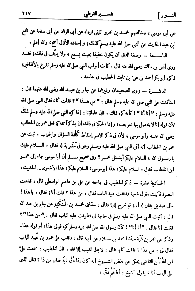 عَنْ أَبِي مُوسَى". وَخَالَفَهُمْ مُحَمَّدُ بْنُ عَمْرٍو اللَّيْثِيُّ فَرَوَاهُ عَنْ أَبِي الزِّنَادِ عَنْ أَبِي سلمة عن نافع ابن عَبْدِ الْحَارِثِ عَنِ النَّبِيِّ صَلَّى اللَّهُ عَلَيْهِ وَسَلَّمَ كَذَلِكَ، وَإِسْنَادُهُ الْأَوَّلُ أَصَحُّ، وَاللَّهُ أَعْلَمُ. التَّاسِعَةُ: وَصِفَةُ الدَّقِّ أَنْ يَكُونَ خَفِيفًا بِحَيْثُ يُسْمَعُ، وَلَا يُعَنَّفُ فِي ذَلِكَ، فَقَدْ رَوَى أَنَسِ بْنِ مَالِكٍ رَضِيَ اللَّهُ عَنْهُ قَالَ: كَانَتْ أَبْوَابُ النَّبِيِّ صَلَّى اللَّهُ عَلَيْهِ وَسَلَّمَ تُقْرَعُ بِالْأَظَافِيرِ، ذَكَرَهُ أَبُو بَكْرٍ أَحْمَدُ بْنُ عَلِيِّ بْنِ ثَابِتٍ الْخَطِيبُ فِي جَامِعِهِ. الْعَاشِرَةُ- رَوَى الصَّحِيحَانِ وَغَيْرُهُمَا عَنْ جَابِرِ بْنِ عَبْدِ اللَّهِ رَضِيَ اللَّهُ عَنْهُمَا قَالَ: اسْتَأْذَنْتُ عَلَى النَّبِيِّ صَلَّى اللَّهُ عَلَيْهِ وَسَلَّمَ فَقَالَ: (مَنْ هَذَا)؟ فَقُلْتُ أَنَا، فَقَالَ النَّبِيُّ صَلَّى اللَّهُ عَلَيْهِ وَسَلَّمَ: (أَنَا أَنَا)! كَأَنَّهُ كَرِهَ ذَلِكَ. قَالَ عُلَمَاؤُنَا: إِنَّمَا كَرِهَ النَّبِيُّ صَلَّى اللَّهُ عَلَيْهِ وَسَلَّمَ ذَلِكَ لِأَنَّ قَوْلَهُ أَنَا لَا يَحْصُلُ بِهَا تَعْرِيفٌ، وَإِنَّمَا الْحُكْمُ فِي ذَلِكَ أَنْ يَذْكُرَ اسْمَهُ كَمَا فَعَلَ عُمَرُ بْنُ الْخَطَّابِ رَضِيَ اللَّهُ عَنْهُ وَأَبُو مُوسَى، لِأَنَّ فِي ذِكْرِ الِاسْمِ إِسْقَاطُ كُلْفَةِ السُّؤَالِ وَالْجَوَابِ. ثَبَتَ عَنْ عُمَرَ بْنِ الْخَطَّابِ أَنَّهُ أَتَى النَّبِيَّ صَلَّى اللَّهُ عَلَيْهِ وَسَلَّمَ وَهُوَ فِي مَشْرُبَةٍ لَهُ فَقَالَ: السَّلَامُ عَلَيْكَ يَا رَسُولَ اللَّهِ، السَّلَامُ عَلَيْكُمْ أَيَدْخُلُ عُمَرُ؟ وَفِي صَحِيحِ مُسْلِمٍ أَنَّ أَبَا مُوسَى جَاءَ إِلَى عُمَرَ ابن الْخَطَّابِ فَقَالَ: السَّلَامُ عَلَيْكُمْ، هَذَا أَبُو مُوسَى، السَّلَامُ عَلَيْكُمْ، هَذَا الْأَشْعَرِيُّ ... الْحَدِيثَ. الْحَادِيَةَ عَشْرَةَ- ذَكَرَ الْخَطِيبُ فِي جَامِعِهِ عَنْ عَلِيِّ بْنِ عَاصِمٍ الْوَاسِطِيِّ قَالَ: قَدِمْتُ الْبَصْرَةَ فَأَتَيْتُ مَنْزِلَ شُعْبَةَ فَدَقَقْتُ عَلَيْهِ الْبَابَ فَقَالَ: مَنْ هَذَا؟ قُلْتُ أَنَا، فَقَالَ: يَا هَذَا! مَا لِي صَدِيقٌ يُقَالُ لَهُ أَنَا، ثُمَّ خَرَجَ إِلَيَّ فَقَالَ: حَدَّثَنِي مُحَمَّدِ بْنِ الْمُنْكَدِرِ عَنْ جَابِرِ بْنِ عَبْدِ اللَّهِ قَالَ: أَتَيْتُ النَّبِيَّ صَلَّى اللَّهُ عَلَيْهِ وَسَلَّمَ فِي حَاجَةٍ لِي فَطَرَقْتُ عَلَيْهِ الْبَابَ فَقَالَ: (مَنْ هَذَا)؟ فَقُلْتُ أَنَا، فَقَالَ: (أَنَا أَنَا) كَانَ رَسُولُ اللَّهِ صَلَّى اللَّهُ عَلَيْهِ وَسَلَّمَ كَرِهَ قَوْلِي هَذَا، أَوْ قَوْلَهُ هَذَا. وَذُكِرَ عَنْ عُمَرَ بْنِ شَبَّةَ حَدَّثَنَا مُحَمَّدُ بْنُ سَلَّامٍ عَنْ أَبِيهِ قَالَ: دَقَقْتُ عَلَى عَمْرِو بْنِ عُبَيْدٍ الْبَابَ فَقَالَ لِي: مَنْ هَذَا؟ فَقُلْتُ أَنَا، فَقَالَ: لَا يَعْلَمُ الْغَيْبَ إِلَّا اللَّهُ. قَالَ الْخَطِيبُ: سَمِعْتُ على ابن الْمُحْسِنِ الْقَاضِيَ يَحْكِي عَنْ بَعْضِ الشُّيُوخِ أَنَّهُ كَانَ إِذَا دَقَّ بَابَهُ فَقَالَ مَنْ ذَا؟ فَقَالَ الَّذِي عَلَى الْبَابِ أَنَا، يَقُولُ الشَّيْخُ: أَنَا هَمٌّ دَقَّ.