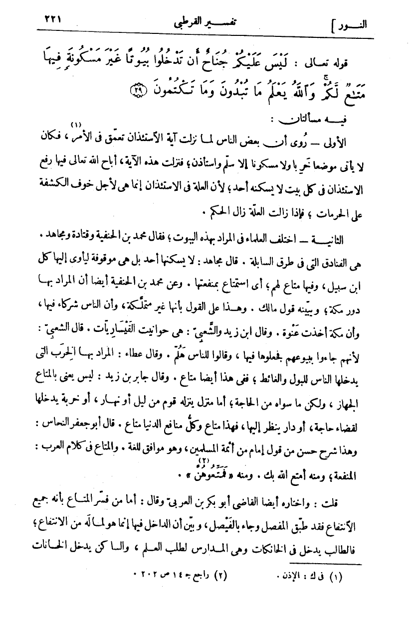 فِيهِ مَسْأَلَتَانِ: الْأُولَى- رُوِيَ أَنَّ بَعْضَ النَّاسِ لَمَّا نَزَلَتْ آيَةُ الِاسْتِئْذَانِ تَعَمَّقَ فِي الْأَمْرِ «١»، فَكَانَ لَا يَأْتِي مَوْضِعًا خَرِبًا وَلَا مَسْكُونًا إِلَّا سَلَّمَ وَاسْتَأْذَنَ، فَنَزَلَتْ هَذِهِ الْآيَةُ، أَبَاحَ اللَّهُ تَعَالَى فِيهَا رَفْعَ الِاسْتِئْذَانِ فِي كُلِّ بَيْتٍ لَا يَسْكُنُهُ أَحَدٌ، لِأَنَّ الْعِلَّةَ فِي الِاسْتِئْذَانِ إِنَّمَا هِيَ لِأَجْلِ خَوْفِ الْكَشْفَةِ عَلَى الْحُرُمَاتِ، فَإِذَا زَالَتِ الْعِلَّةُ زَالَ الْحُكْمُ. الثَّانِيَةُ- اخْتَلَفَ الْعُلَمَاءُ فِي الْمُرَادِ بِهَذِهِ الْبُيُوتِ، فَقَالَ مُحَمَّدُ بْنُ الْحَنَفِيَّةِ وَقَتَادَةُ وَمُجَاهِدٌ: هِيَ الْفَنَادِقُ الَّتِي فِي طُرُقِ السَّابِلَةِ. قَالَ مُجَاهِدٌ: لَا يَسْكُنُهَا أَحَدٌ بَلْ هِيَ مَوْقُوفَةٌ لِيَأْوِيَ إِلَيْهَا كُلُّ ابْنِ سَبِيلٍ، وَفِيهَا مَتَاعٌ لَهُمْ، أَيِ اسْتِمْتَاعٌ بِمَنْفَعَتِهَا. وَعَنْ مُحَمَّدِ بْنِ الْحَنَفِيَّةِ أَيْضًا أَنَّ الْمُرَادَ بِهَا دُورُ مَكَّةَ، وَيُبَيِّنُهُ قَوْلُ مَالِكٍ. وَهَذَا عَلَى الْقَوْلِ بِأَنَّهَا غَيْرُ مُتَمَلَّكَةٍ، وَأَنَّ النَّاسَ شُرَكَاءُ فِيهَا وَأَنَّ مَكَّةَ أُخِذَتْ عَنْوَةً. وَقَالَ ابْنُ زَيْدٍ وَالشَّعْبِيُّ: هِيَ حَوَانِيتُ الْقَيْسَارِيَّاتِ. قَالَ الشَّعْبِيُّ: لِأَنَّهُمْ جاءوا ببيوعهم فَجَعَلُوهَا فِيهَا، وَقَالُوا لِلنَّاسِ هَلُمَّ. وَقَالَ عَطَاءٌ: الْمُرَادُ بِهَا الْخِرَبُ الَّتِي يَدْخُلُهَا النَّاسُ لِلْبَوْلِ وَالْغَائِطِ، فَفِي هَذَا أَيْضًا مَتَاعٌ. وَقَالَ جَابِرُ بْنُ زَيْدٍ: لَيْسَ يَعْنِي بِالْمَتَاعِ الْجَهَازَ، وَلَكِنْ مَا سِوَاهُ مِنَ الْحَاجَةِ، إِمَّا مَنْزِلٌ يَنْزِلُهُ قَوْمٌ مِنْ لَيْلٍ أَوْ نَهَارٍ، أَوْ خَرِبَةٌ يَدْخُلُهَا لِقَضَاءِ حَاجَةٍ، أَوْ دَارٌ يَنْظُرُ إِلَيْهَا فَهَذَا مَتَاعٌ وَكُلُّ مَنَافِعِ الدُّنْيَا مَتَاعٌ. قَالَ أَبُو جَعْفَرٍ النَّحَّاسُ: وَهَذَا شَرْحٌ حَسَنٌ مِنْ قَوْلِ إِمَامٍ مِنْ أَئِمَّةِ الْمُسْلِمِينَ، وَهُوَ مُوَافِقٌ لِلُّغَةِ. وَالْمَتَاعُ فِي كَلَامِ الْعَرَبِ: الْمَنْفَعَةُ، وَمِنْهُ أمتع الله بك. ومنه" فَمَتِّعُوهُنَّ «٢» " [الأحزاب: ٤٩]. قُلْتُ: وَاخْتَارَهُ أَيْضًا الْقَاضِي أَبُو بَكْرِ بْنُ الْعَرَبِيِّ وَقَالَ: أَمَّا مَنْ فَسَّرَ الْمَتَاعَ بِأَنَّهُ جَمِيعُ الِانْتِفَاعِ فَقَدْ طَبَّقَ الْمُفَصَّلَ وَجَاءَ بِالْفَيْصَلِ، وَبَيَّنَ أَنَّ الدَّاخِلَ فِيهَا إِنَّمَا هُوَ لِمَا لَهُ مِنَ الِانْتِفَاعِ فَالطَّالِبُ يَدْخُلُ فِي الْخَانْكَاتِ وَهِيَ الْمَدَارِسُ لِطَلَبِ الْعِلْمِ، وَالسَّاكِنُ يَدْخُلُ الْخَانَاتِ