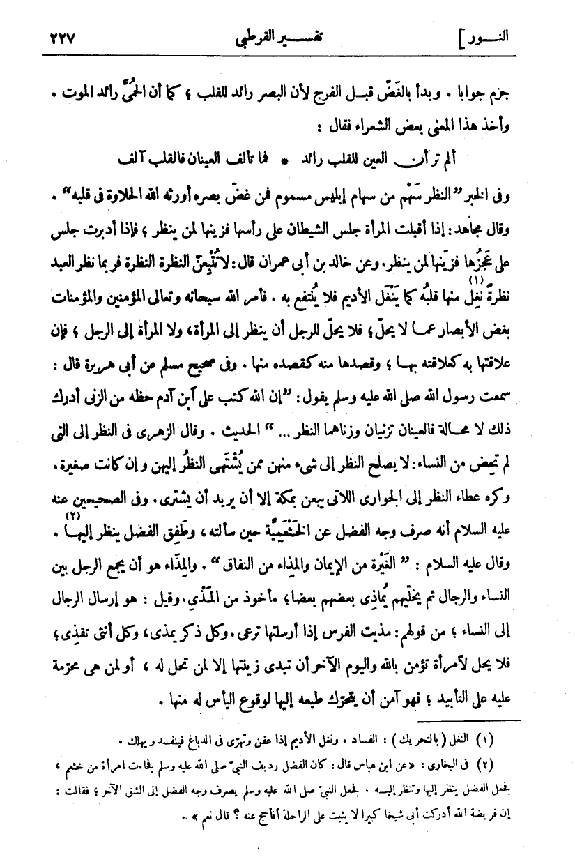 جَزْمٍ جَوَابًا. وَبَدَأَ بِالْغَضِّ قَبْلَ الْفَرْجِ لِأَنَّ الْبَصَرَ رَائِدٌ لِلْقَلْبِ، كَمَا أَنَّ الْحُمَّى رَائِدُ الْمَوْتِ. وَأَخَذَ هَذَا الْمَعْنَى بَعْضُ الشُّعَرَاءِ فَقَالَ: