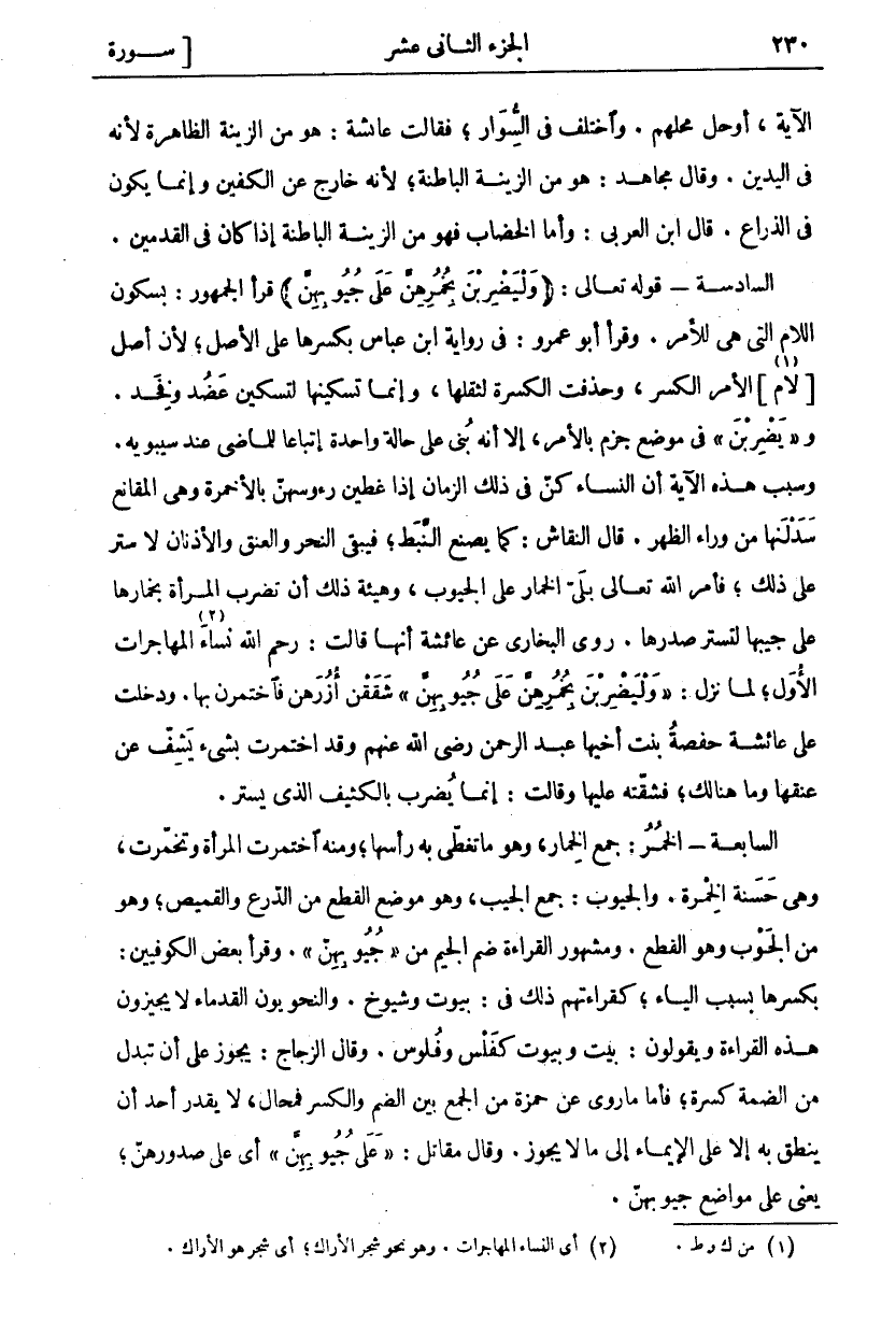 الْآيَةِ، أَوْ حَلَّ مَحَلَّهُمْ. وَاخْتُلِفَ فِي السِّوَارِ، فقالت عائشة: هي من الزينة الظاهرة لأنه في اليدين. وقال مجاهد: هو مِنَ الزِّينَةِ الْبَاطِنَةِ، لِأَنَّهَا خَارِجٌ عَنِ الْكَفَّيْنِ وإنما يكون فِي الذِّرَاعِ. قَالَ ابْنُ الْعَرَبِيِّ: وَأَمَّا الْخِضَابُ فَهُوَ مِنَ الزِّينَةِ الْبَاطِنَةِ إِذَا كَانَ فِي الْقَدَمَيْنِ. السَّادِسَةُ- قَوْلُهُ تَعَالَى: (وَلْيَضْرِبْنَ بِخُمُرِهِنَّ عَلى جُيُوبِهِنَّ) قَرَأَ الْجُمْهُورُ: بِسُكُونِ اللَّامِ الَّتِي هِيَ لِلْأَمْرِ. وَقَرَأَ أَبُو عَمْرٍو: فِي رِوَايَةِ ابْنِ عَبَّاسٍ بكسرها على الأصل، لان الأصل [لَامِ «١»] الْأَمْرِ الْكَسْرُ، وَحُذِفَتِ الْكَسْرَةُ لِثِقَلِهَا، وَإِنَّمَا تَسْكِينُهَا لِتَسْكِينِ عَضُدٍ وَفَخِذٍ. وَ" يَضْرِبْنَ" فِي مَوْضِعِ جَزْمٍ بِالْأَمْرِ، إِلَّا أَنَّهُ بُنِيَ عَلَى حَالَةٍ وَاحِدَةٍ إِتْبَاعًا لِلْمَاضِي عِنْدَ سِيبَوَيْهِ. وَسَبَبُ هَذِهِ الْآيَةِ أَنَّ النِّسَاءَ كُنَّ فِي ذَلِكَ الزَّمَانِ إِذَا غَطَّيْنَ رُءُوسَهُنَّ بِالْأَخْمِرَةِ وَهِيَ الْمَقَانِعُ سَدَلْنَهَا مِنْ وَرَاءِ الظَّهْرِ. قَالَ النَّقَّاشُ: كَمَا يَصْنَعُ النَّبَطُ، فَيَبْقَى النَّحْرُ وَالْعُنُقُ وَالْأُذُنَانِ لَا سَتْرَ عَلَى ذَلِكَ، فَأَمَرَ اللَّهُ تَعَالَى بِلَيِّ الْخِمَارِ عَلَى الْجُيُوبِ، وَهَيْئَةُ ذَلِكَ أَنْ تَضْرِبَ الْمَرْأَةُ بِخِمَارِهَا عَلَى جَيْبِهَا لِتَسْتُرَ صَدْرَهَا. رَوَى الْبُخَارِيُّ عَنْ عَائِشَةَ أَنَّهَا قَالَتْ: رَحِمَ اللَّهُ نِسَاءَ «٢» الْمُهَاجِرَاتِ الْأُوَلِ، لَمَّا نَزَلَ:" وَلْيَضْرِبْنَ بِخُمُرِهِنَّ عَلى جُيُوبِهِنَّ" شَقَقْنَ أُزُرَهُنَّ فَاخْتَمَرْنَ بِهَا. وَدَخَلَتْ عَلَى عَائِشَةَ حَفْصَةُ بِنْتُ أَخِيهَا عَبْدِ الرَّحْمَنِ رَضِيَ اللَّهُ عَنْهُمْ وَقَدِ اخْتَمَرَتْ بِشَيْءٍ يَشِفُّ عَنْ عُنُقِهَا وَمَا هُنَالِكَ، فَشَقَّتْهُ عَلَيْهَا وَقَالَتْ: إِنَّمَا يُضْرَبُ بِالْكَثِيفِ الَّذِي يَسْتُرُ. السَّابِعَةُ- الْخُمُرُ: جَمْعُ الْخِمَارِ، وَهُوَ مَا تُغَطِّي بِهِ رَأْسَهَا، وَمِنْهُ اخْتَمَرَتِ الْمَرْأَةُ وَتَخَمَّرَتْ، وَهِيَ حَسَنَةُ الْخُمْرَةِ. وَالْجُيُوبُ: جَمْعُ الْجَيْبِ، وَهُوَ مَوْضِعُ الْقَطْعِ مِنَ الدرع والفميص، وَهُوَ مِنَ الْجَوْبِ وَهُوَ الْقَطْعُ. وَمَشْهُورُ الْقِرَاءَةِ ضَمُّ الْجِيمِ مِنْ" جُيُوبِهِنَّ". وَقَرَأَ بَعْضُ الْكُوفِيِّينَ: بِكَسْرِهَا بِسَبَبِ الْيَاءِ، كَقِرَاءَتِهِمْ ذَلِكَ فِي: بُيُوتٍ وَشُيُوخٍ. وَالنَّحْوِيُّونَ الْقُدَمَاءُ لَا يُجِيزُونَ هَذِهِ الْقِرَاءَةَ وَيَقُولُونَ: بَيْتٌ وَبُيُوتٌ كَفَلْسٍ وَفُلُوسٍ. وَقَالَ الزَّجَّاجُ: يَجُوزُ عَلَى أَنْ تُبْدَلَ مِنَ الضَّمَّةِ كَسْرَةٌ، فَأَمَّا مَا رُوِيَ عَنْ حَمْزَةَ مِنَ الْجَمْعِ بَيْنَ الضَّمِّ وَالْكَسْرِ فَمُحَالٌ، لَا يَقْدِرُ أَحَدٌ أَنْ يَنْطِقَ بِهِ إِلَّا عَلَى الْإِيمَاءِ إِلَى مَا لَا يَجُوزُ. وَقَالَ مُقَاتِلٌ:" عَلى جُيُوبِهِنَّ" أَيْ عَلَى صُدُورِهِنَّ، يَعْنِي عَلَى مَوَاضِعِ جُيُوبِهِنَّ.