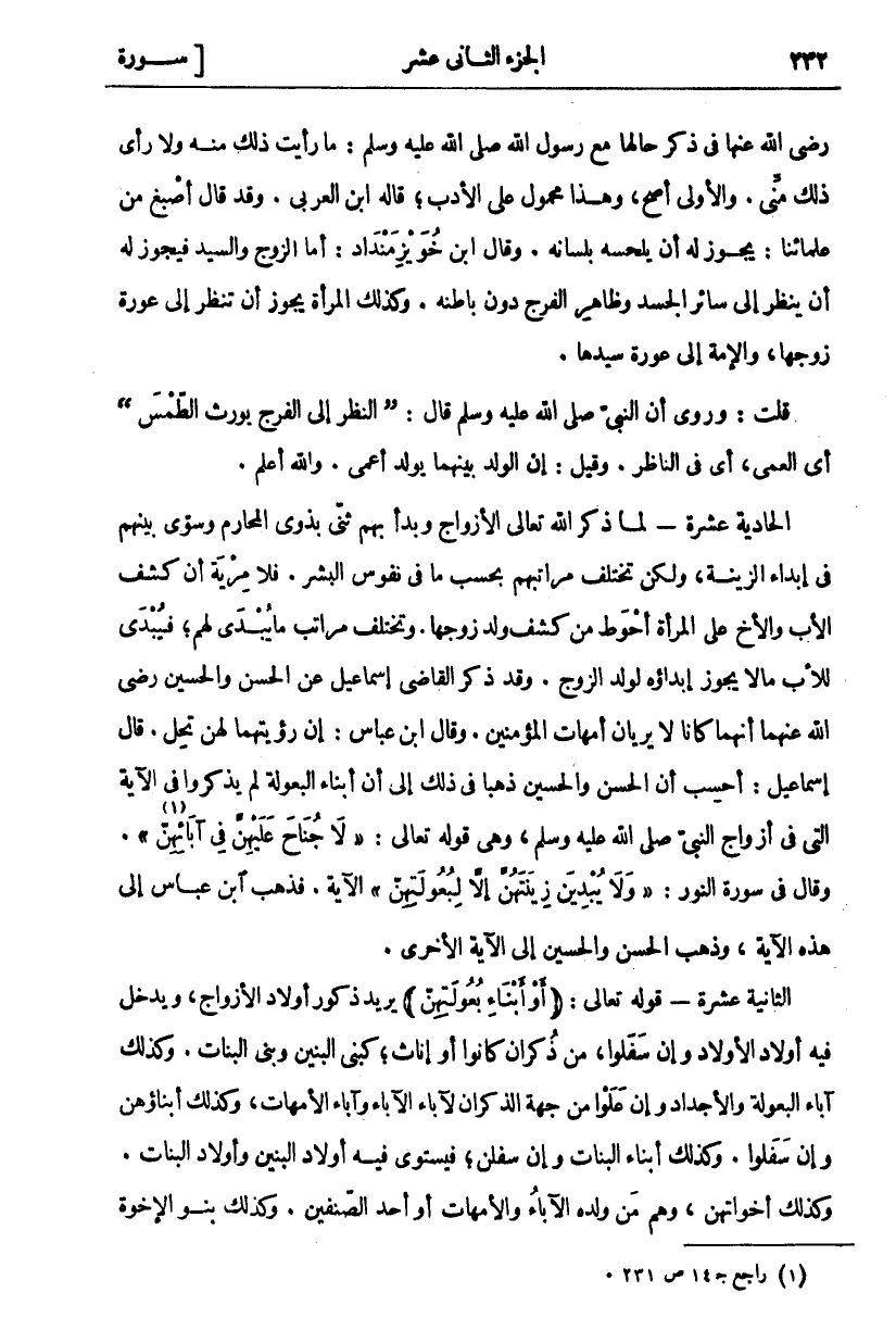 رَضِيَ اللَّهُ عَنْهَا فِي ذِكْرِ حَالِهَا مَعَ رَسُولِ اللَّهِ صَلَّى اللَّهُ عَلَيْهِ وَسَلَّمَ: (ما رَأَيْتُ ذَلِكَ مِنْهُ وَلَا رَأَى ذَلِكَ مِنِّي) وَالْأَوَّلُ أَصَحُّ، وَهَذَا مَحْمُولٌ عَلَى الْأَدَبِ، قَالَهُ ابْنُ الْعَرَبِيِّ. وَقَدْ قَالَ أَصْبَغُ مِنْ عُلَمَائِنَا: يَجُوزُ لَهُ أَنْ يَلْحَسَهُ بِلِسَانِهِ. وَقَالَ ابْنُ خُوَيْزِ مَنْدَادٍ: أَمَّا الزَّوْجُ وَالسَّيِّدُ فَيَجُوزُ لَهُ أَنْ يَنْظُرَ إِلَى سَائِرِ الْجَسَدِ وَظَاهِرِ الْفَرْجِ دُونَ بَاطِنِهِ. وَكَذَلِكَ الْمَرْأَةُ يَجُوزُ أَنْ تَنْظُرَ إِلَى عَوْرَةِ زَوْجِهَا، وَالْأَمَةُ إِلَى عَوْرَةِ سَيِّدِهَا. قُلْتُ: وَرُوِيَ أَنَّ النَّبِيَّ صَلَّى اللَّهُ عَلَيْهِ وَسَلَّمَ قَالَ: (النَّظَرُ إِلَى الْفَرْجِ يُورِثُ الطَّمْسَ) أَيِ الْعَمَى، أَيْ فِي النَّاظِرِ. وَقِيلَ: إِنَّ الْوَلَدَ بَيْنَهُمَا يُولَدُ أَعْمَى. وَاللَّهُ أَعْلَمُ. الْحَادِيَةَ عشرة- لما ذَكَرَ اللَّهُ تَعَالَى الْأَزْوَاجَ وَبَدَأَ بِهِمْ ثَنَّى بِذَوِي الْمَحَارِمِ وَسَوَّى بَيْنَهُمْ فِي إِبْدَاءِ الزِّينَةِ، وَلَكِنْ تَخْتَلِفُ مَرَاتِبُهُمْ بِحَسَبِ مَا فِي نُفُوسِ الْبَشَرِ. فَلَا مِرْيَةَ أَنَّ كَشْفَ الْأَبِ وَالْأَخِ عَلَى الْمَرْأَةِ أَحْوَطُ مِنْ كَشْفِ وَلَدِ زَوْجِهَا. وَتَخْتَلِفُ مَرَاتِبُ مَا يُبْدَى لَهُمْ، فَيُبْدَى لِلْأَبِ مَا لَا يَجُوزُ إِبْدَاؤُهُ لِوَلَدِ الزَّوْجِ. وَقَدْ ذَكَرَ الْقَاضِي إِسْمَاعِيلُ عَنِ الْحَسَنِ وَالْحُسَيْنِ رَضِيَ اللَّهُ عَنْهُمَا أَنَّهُمَا كَانَا لَا يَرَيَانِ أُمَّهَاتِ الْمُؤْمِنِينَ. وَقَالَ ابْنُ عَبَّاسٍ: إِنَّ رُؤْيَتَهُمَا لَهُنَّ تَحِلُّ. قَالَ إِسْمَاعِيلُ: أَحْسَبُ أَنَّ الْحَسَنَ وَالْحُسَيْنَ ذَهَبَا فِي ذَلِكَ إِلَى أَنَّ أَبْنَاءَ الْبُعُولَةِ لَمْ يُذْكَرُوا فِي الْآيَةِ الَّتِي فِي أَزْوَاجِ النَّبِيِّ صَلَّى اللَّهُ عَلَيْهِ وَسَلَّمَ، وَهِيَ قَوْلُهُ تعالى:" لا جُناحَ عَلَيْهِنَّ فِي آبائِهِنَّ" «١» [الأحزاب: ٥٥]. وَقَالَ فِي سُورَةِ النُّورِ:" وَلا يُبْدِينَ زِينَتَهُنَّ إِلَّا لِبُعُولَتِهِنَّ" الْآيَةَ. فَذَهَبَ ابْنُ عَبَّاسٍ إِلَى هَذِهِ الْآيَةِ، وَذَهَبَ الْحَسَنُ وَالْحُسَيْنُ إِلَى الْآيَةِ أخرى. الثَّانِيَةَ عَشْرَةَ- قَوْلُهُ تَعَالَى: (أَوْ أَبْناءِ بُعُولَتِهِنَّ) يُرِيدُ ذُكُورَ أَوْلَادِ الْأَزْوَاجِ، وَيَدْخُلُ فِيهِ أَوْلَادُ الْأَوْلَادِ وَإِنْ سَفَلُوا، مِنْ ذُكْرَانٍ كَانُوا أَوْ إِنَاثٍ، كَبَنِي الْبَنِينَ وَبَنِي الْبَنَاتِ. وَكَذَلِكَ آبَاءُ الْبُعُولَةِ وَالْأَجْدَادُ وَإِنْ عَلَوْا مِنْ جِهَةِ الذُّكْرَانِ لِآبَاءِ الْآبَاءِ وَآبَاءِ الْأُمَّهَاتِ، وَكَذَلِكَ أَبْنَاؤُهُنَّ وَإِنْ سَفَلُوا. وَكَذَلِكَ أَبْنَاءُ الْبَنَاتِ وَإِنْ سَفَلْنَ، فَيَسْتَوِي فِيهِ أَوْلَادُ الْبَنِينَ وَأَوْلَادُ الْبَنَاتِ. وَكَذَلِكَ أَخَوَاتُهُنَّ، وهم من ولده الْآبَاءِ وَالْأُمَّهَاتِ أَوْ أَحَدِ الصِّنْفَيْنِ. وَكَذَلِكَ بَنُو الاخوة
