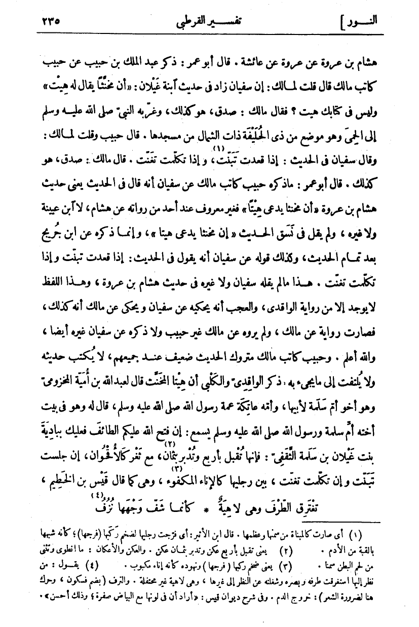 هِشَامِ بْنِ عُرْوَةَ عَنْ عُرْوَةَ عَنْ عَائِشَةَ. قَالَ أَبُو عُمَرَ: ذَكَرَ عَبْدُ الْمَلِكِ بْنُ حَبِيبٍ عَنْ حَبِيبٍ كَاتِبِ مَالِكٍ قَالَ قُلْتُ لِمَالِكٍ: إِنَّ سُفْيَانَ زَادَ فِي حَدِيثِ ابْنَةِ غَيْلَانَ: (أَنَّ مُخَنَّثًا يُقَالُ لَهُ هِيتُ) وَلَيْسَ فِي كِتَابِكَ هِيتُ؟ فَقَالَ مَالِكٌ: صَدَقَ، هُوَ كَذَلِكَ وَغَرَّبَهُ النَّبِيُّ صَلَّى اللَّهُ عَلَيْهِ وَسَلَّمَ إِلَى الْحِمَى وَهُوَ مَوْضِعٌ مِنْ ذِي الْحُلَيْفَةِ ذَاتِ الشِّمَالِ مِنْ مَسْجِدِهَا. قَالَ حَبِيبٌ وَقُلْتُ لِمَالِكٍ: وَقَالَ سُفْيَانُ فِي الْحَدِيثِ: إِذَا قَعَدَتْ تَبَنَّتْ «١»، وَإِذَا تَكَلَّمَتْ تَغَنَّتْ. قَالَ مَالِكٌ: صَدَقَ، هُوَ كَذَلِكَ. قَالَ أَبُو عُمَرَ: مَا ذَكَرَهُ حَبِيبٌ كَاتِبُ مَالِكٍ عَنْ سُفْيَانَ أَنَّهُ قَالَ فِي الْحَدِيثِ يَعْنِي حَدِيثَ هِشَامِ بْنِ عُرْوَةَ (أَنَّ مُخَنَّثًا يُدْعَى هِيتًا) فَغَيْرُ مَعْرُوفٍ عِنْدَ أَحَدٍ مِنْ رُوَاتِهِ عَنْ هِشَامٍ، لَا ابْنُ عُيَيْنَةَ وَلَا غَيْرُهُ، وَلَمْ يَقُلْ فِي نَسَقِ الْحَدِيثِ (إِنَّ مُخَنَّثًا يُدْعَى هِيتًا) وَإِنَّمَا ذَكَرَهُ عَنِ ابْنِ جُرَيْجٍ بَعْدَ تَمَامِ الْحَدِيثِ، وَكَذَلِكَ قَوْلُهُ عَنْ سُفْيَانَ أَنَّهُ يَقُولُ فِي الْحَدِيثِ: إِذَا قَعَدَتْ تَبَنَّتْ وَإِذَا تَكَلَّمَتْ تَغَنَّتْ. هَذَا مَا لَمْ يَقُلْهُ سُفْيَانُ وَلَا غَيْرُهُ فِي حَدِيثِ هِشَامِ بْنِ عُرْوَةَ، وَهَذَا اللَّفْظُ لَا يُوجَدُ إِلَّا مِنْ رِوَايَةِ الْوَاقِدِيِّ، وَالْعَجَبُ أَنَّهُ يَحْكِيهِ عَنْ سُفْيَانَ وَيَحْكِي عَنْ مَالِكٍ أَنَّهُ كَذَلِكَ، فَصَارَتْ رِوَايَةً عَنْ مَالِكٍ، وَلَمْ يَرْوِهِ عَنْ مَالِكٍ غَيْرُ حَبِيبٍ وَلَا ذَكَرَهُ عَنْ سُفْيَانَ غَيْرُهُ أَيْضًا، وَاللَّهُ أَعْلَمُ. وَحَبِيبٌ كَاتِبُ مَالِكٍ مَتْرُوكُ الْحَدِيثِ ضَعِيفٌ عِنْدَ جَمِيعِهِمْ، لَا يكتب حديثه ولا يلتفت إلى ما يجئ بِهِ. ذَكَرَ الْوَاقِدِيُّ وَالْكَلْبِيُّ أَنَّ هِيتًا الْمُخَنَّثَ قَالَ لِعَبْدِ اللَّهِ بْنِ أُمَيَّةَ الْمَخْزُومِيِّ وَهُوَ أَخُو أُمِّ سَلَمَةَ لِأَبِيهَا، وَأُمُّهُ عَاتِكَةَ عَمَّةِ رَسُولِ اللَّهِ صَلَّى اللَّهُ عَلَيْهِ وَسَلَّمَ، قال لَهُ وَهُوَ فِي بَيْتِ أُخْتِهِ أُمِّ سَلَمَةَ وَرَسُولُ اللَّهِ صَلَّى اللَّهُ عَلَيْهِ وَسَلَّمَ يَسْمَعُ: إِنْ فَتَحَ اللَّهُ عَلَيْكُمُ الطَّائِفَ فَعَلَيْكَ بِبَادِيَةَ بِنْتِ غَيْلَانَ بْنِ سَلَمَةَ الثَّقَفِيِّ، فَإِنَّهَا تُقْبِلُ بِأَرْبَعٍ وَتُدْبِرُ بِثَمَانٍ «٢»، مَعَ ثَغْرٍ كَالْأُقْحُوَانِ، إِنْ جَلَسَتْ تَبَنَّتْ وَإِنْ تَكَلَّمَتْ تَغَنَّتْ، بَيْنَ رِجْلَيْهَا كَالْإِنَاءِ الْمَكْفُوءِ «٣»، وَهِيَ كَمَا قَالَ قَيْسُ بْنُ الْخَطِيمِ،