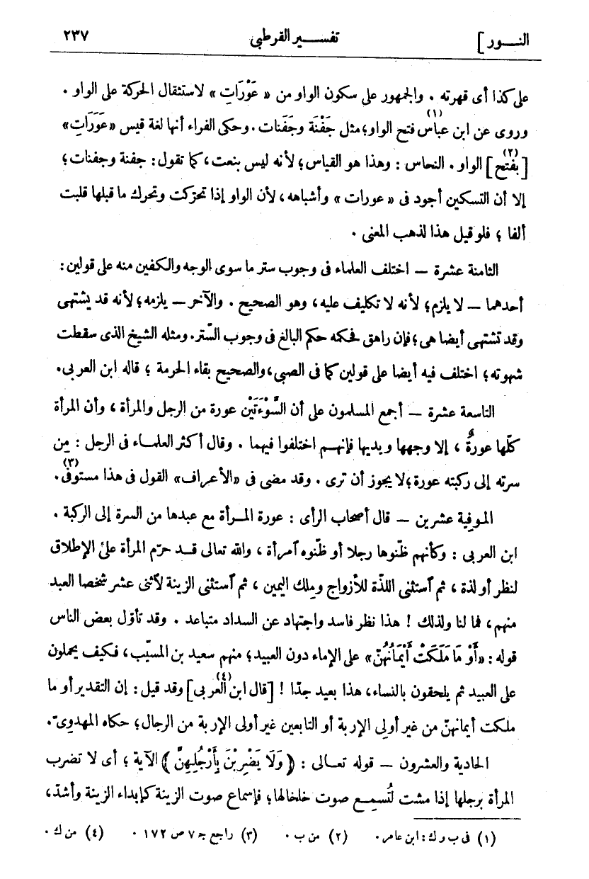 عَلَى كَذَا أَيْ قَهَرْتُهُ. وَالْجُمْهُورُ عَلَى سُكُونِ الْوَاوِ مِنْ" عَوْراتِ" لِاسْتِثْقَالِ الْحَرَكَةِ عَلَى الْوَاوِ. وَرُوِيَ عَنِ ابْنِ عَبَّاسٍ «١» فَتْحُ الْوَاوِ، مِثْلُ جَفْنَةٍ وَجَفَنَاتٍ. وَحَكَى الْفَرَّاءُ أَنَّهَا لُغَةُ قَيْسٍ" عَوْراتِ" [بِفَتْحِ «٢» [الْوَاوِ. النَّحَّاسُ: وَهَذَا هُوَ الْقِيَاسُ، لِأَنَّهُ لَيْسَ بِنَعْتٍ، كَمَا تَقُولُ: جَفْنَةٌ وَجَفَنَاتٌ، إِلَّا أَنَّ التَّسْكِينَ أَجْوَدُ فِي" عَوْراتِ" وَأَشْبَاهِهِ، لِأَنَّ الْوَاوَ إِذَا تَحَرَّكَتْ وَتَحَرَّكَ مَا قَبْلَهَا قُلِبَتْ أَلِفًا، فَلَوْ قِيلَ هَذَا لَذَهَبَ الْمَعْنَى. الثَّامِنَةَ عَشْرَةَ- اخْتَلَفَ الْعُلَمَاءُ فِي وُجُوبِ سَتْرِ مَا سِوَى الْوَجْهِ وَالْكَفَّيْنِ مِنْهُ عَلَى قَوْلَيْنِ: أَحَدُهُمَا- لَا يَلْزَمُ، لِأَنَّهُ لَا تَكْلِيفَ عَلَيْهِ، وَهُوَ الصَّحِيحُ. وَالْآخَرُ- يَلْزَمُهُ، لِأَنَّهُ قَدْ يَشْتَهِي وَقَدْ تَشْتَهِي أَيْضًا هِيَ، فَإِنْ رَاهَقَ فَحُكْمُهُ حُكْمُ الْبَالِغِ وُجُوبَ السَّتْرِ. وَمِثْلُهُ الشَّيْخُ الَّذِي سَقَطَتْ شَهْوَتُهُ اخْتُلِفَ فِيهِ أَيْضًا عَلَى قَوْلَيْنِ كَمَا فِي الصَّبِيِّ، وَالصَّحِيحُ بَقَاءُ الْحُرْمَةِ، قَالَهُ ابْنُ الْعَرَبِيِّ. التَّاسِعَةَ عَشْرَةَ- أَجْمَعَ الْمُسْلِمُونَ عَلَى أن السوأتين عَوْرَةٌ مِنَ الرَّجُلِ وَالْمَرْأَةِ، وَأَنَّ الْمَرْأَةَ كُلَّهَا عَوْرَةٌ، إِلَّا وَجْهَهَا وَيَدَيْهَا فَإِنَّهُمُ اخْتَلَفُوا فِيهِمَا. وَقَالَ أَكْثَرُ الْعُلَمَاءِ فِي الرَّجُلِ: مِنْ سُرَّتِهِ إِلَى رُكْبَتِهِ عَوْرَةٌ، لَا يَجُوزُ أَنْ تُرَى. وَقَدْ مَضَى فِي] الْأَعْرَافِ [الْقَوْلُ فِي هَذَا مُسْتَوْفًى «٣». الْمُوَفِّيَةُ عِشْرِينَ- قَالَ أَصْحَابُ الرَّأْيِ: عَوْرَةُ الْمَرْأَةِ مَعَ عَبْدِهَا مِنَ السُّرَّةِ إِلَى الرُّكْبَةِ. ابْنُ الْعَرَبِيِّ: وَكَأَنَّهُمْ ظَنُّوهَا رَجُلًا أَوْ ظَنُّوهُ امْرَأَةً، وَاللَّهُ تَعَالَى قَدْ حَرَّمَ الْمَرْأَةَ عَلَى الْإِطْلَاقِ لِنَظَرٍ أَوْ لَذَّةٍ، ثُمَّ اسْتَثْنَى اللَّذَّةَ لِلْأَزْوَاجِ وَمِلْكِ الْيَمِينِ، ثُمَّ اسْتَثْنَى الزِّينَةَ لِاثْنَيْ عَشَرَ شَخْصًا الْعَبْدُ مِنْهُمْ، فَمَا لَنَا وَلِذَلِكَ! هَذَا نَظَرٌ فَاسِدٌ وَاجْتِهَادٌ عَنِ السَّدَادِ مُتَبَاعِدٌ. وَقَدْ تَأَوَّلَ بَعْضُ النَّاسِ قَوْلَهُ:" أَوْ مَا مَلَكَتْ أَيْمانُهُنَّ" عَلَى الْإِمَاءِ دُونَ الْعَبِيدِ، مِنْهُمْ سَعِيدُ بْنُ الْمُسَيَّبِ، فَكَيْفَ يُحْمَلُونَ عَلَى الْعَبِيدِ ثم يلحقون بالنساء هذا بعيد جدا! [قال ابن العربي «٤»] وَقَدْ قِيلَ: إِنَّ التَّقْدِيرَ أَوْ مَا مَلَكَتْ أَيْمَانُهُنَّ مِنْ غَيْرِ أُولِي الْإِرْبَةِ أَوِ التَّابِعِينَ غَيْرِ أُولِي الْإِرْبَةِ مِنَ الرِّجَالِ، حَكَاهُ الْمَهْدَوِيُّ. الْحَادِيَةُ وَالْعِشْرُونَ- قَوْلُهُ تَعَالَى: (وَلا يَضْرِبْنَ بِأَرْجُلِهِنَّ) الآية، أَيْ لَا تَضْرِبُ الْمَرْأَةُ بِرِجْلِهَا إِذَا مَشَتْ لِتُسْمِعَ صَوْتَ خَلْخَالِهَا، فَإِسْمَاعُ صَوْتِ الزِّينَةِ كَإِبْدَاءِ الزينة وأشد،