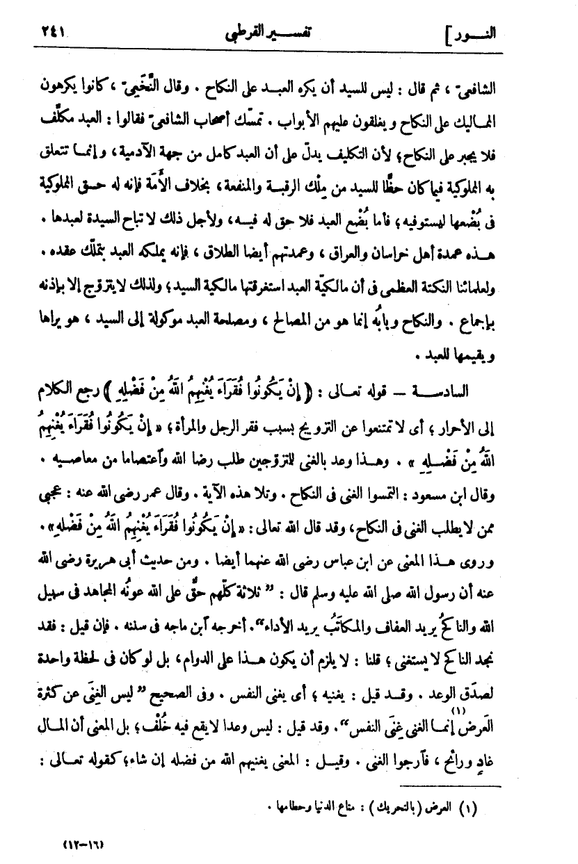 الشَّافِعِيِّ، ثُمَّ قَالَ: لَيْسَ لِلسَّيِّدِ أَنْ يُكْرِهَ الْعَبْدَ عَلَى النِّكَاحِ. وَقَالَ النَّخَعِيُّ: كَانُوا يُكْرِهُونَ الْمَمَالِيكَ عَلَى النِّكَاحِ وَيُغْلِقُونَ عَلَيْهِمُ الْأَبْوَابَ. تَمَسَّكَ أَصْحَابُ الشَّافِعِيِّ فَقَالُوا: الْعَبْدُ مُكَلَّفٌ فَلَا يُجْبَرُ عَلَى النِّكَاحِ، لِأَنَّ التَّكْلِيفَ يَدُلُّ عَلَى أَنَّ الْعَبْدَ كَامِلٌ مِنْ جِهَةِ الْآدَمِيَّةِ، وَإِنَّمَا تَتَعَلَّقُ بِهِ الْمَمْلُوكِيَّةُ فِيمَا كَانَ حَظًّا لِلسَّيِّدِ مِنْ مِلْكِ الرَّقَبَةِ وَالْمَنْفَعَةِ، بِخِلَافِ الْأَمَةِ فَإِنَّهُ لَهُ حَقُّ الْمَمْلُوكِيَّةِ فِي بُضْعِهَا لِيَسْتَوْفِيَهُ، فَأَمَّا بُضْعُ الْعَبْدِ فَلَا حَقَّ لَهُ فِيهِ، وَلِأَجْلِ ذَلِكَ لَا تُبَاحُ السَّيِّدَةُ لِعَبْدِهَا. هَذِهِ عُمْدَةُ أَهْلِ خُرَاسَانَ وَالْعِرَاقِ، وَعُمْدَتُهُمْ أَيْضًا الطَّلَاقُ، فَإِنَّهُ يَمْلِكُهُ الْعَبْدُ بِتَمَلُّكِ عَقْدِهِ. وَلِعُلَمَائِنَا النُّكْتَةُ الْعُظْمَى فِي أَنَّ مَالِكِيَّةَ الْعَبْدِ اسْتَغْرَقَتْهَا مَالِكِيَّةُ السَّيِّدِ، وَلِذَلِكَ لَا يَتَزَوَّجُ إِلَّا بِإِذْنِهِ بِإِجْمَاعٍ. وَالنِّكَاحُ وَبَابُهُ إِنَّمَا هُوَ مِنَ الْمَصَالِحِ، وَمَصْلَحَةُ الْعَبْدِ مَوْكُولَةٌ إِلَى السَّيِّدِ، هُوَ يَرَاهَا وَيُقِيمُهَا لِلْعَبْدِ. السَّادِسَةُ- قَوْلُهُ تَعَالَى: (إِنْ يَكُونُوا فُقَراءَ يُغْنِهِمُ اللَّهُ مِنْ فَضْلِهِ) رَجَعَ الْكَلَامُ إِلَى الْأَحْرَارِ، أَيْ لَا تَمْتَنِعُوا عَنِ التَّزْوِيجِ بِسَبَبِ فَقْرِ الرَّجُلِ وَالْمَرْأَةِ،" إِنْ يَكُونُوا فُقَراءَ يُغْنِهِمُ اللَّهُ مِنْ فَضْلِهِ". وَهَذَا وَعْدٌ بِالْغِنَى لِلْمُتَزَوِّجِينَ طَلَبَ رِضَا اللَّهِ وَاعْتِصَامًا مِنْ مَعَاصِيهِ. وَقَالَ ابْنُ مَسْعُودٍ: الْتَمِسُوا الْغِنَى فِي النِّكَاحِ، وَتَلَا هَذِهِ الْآيَةَ. وَقَالَ عُمَرُ رَضِيَ اللَّهُ عَنْهُ: عَجَبِي مِمَّنْ لَا يَطْلُبُ الْغِنَى فِي النِّكَاحِ، وَقَدْ قَالَ اللَّهُ تَعَالَى:" إِنْ يَكُونُوا فُقَراءَ يُغْنِهِمُ اللَّهُ مِنْ فَضْلِهِ". وَرُوِيَ هَذَا الْمَعْنَى عَنِ ابْنِ عَبَّاسٍ رَضِيَ اللَّهُ عَنْهُمَا أَيْضًا. وَمِنْ حَدِيثِ أَبِي هُرَيْرَةَ رَضِيَ اللَّهُ عَنْهُ أَنَّ رَسُولَ اللَّهِ صَلَّى اللَّهُ عَلَيْهِ وَسَلَّمَ قَالَ: (ثَلَاثَةٌ كُلُّهُمْ حَقٌّ عَلَى اللَّهِ عَوْنُهُ الْمُجَاهِدُ فِي سَبِيلِ اللَّهِ وَالنَّاكِحُ يُرِيدُ الْعَفَافَ وَالْمُكَاتَبُ يُرِيدُ الْأَدَاءَ). أَخْرَجَهُ ابْنُ مَاجَهْ فِي سُنَنِهِ. فَإِنْ قِيلَ: فَقَدْ نَجِدُ النَّاكِحَ لَا يَسْتَغْنِي، قُلْنَا: لَا يَلْزَمُ أَنْ يَكُونَ هَذَا عَلَى الدَّوَامِ، بَلْ لَوْ كَانَ فِي لَحْظَةٍ وَاحِدَةٍ لَصَدَقَ الْوَعْدُ. وَقَدْ قِيلَ: يُغْنِيَهُ، أَيْ يُغْنِي النَّفْسَ. وَفِي الصَّحِيحِ (لَيْسَ الْغِنَى عَنْ كَثْرَةِ الْعَرَضِ «١» إِنَّمَا الْغِنَى غِنَى النَّفْسِ). وَقَدْ قِيلَ: لَيْسَ وعدا لَا يَقَعُ فِيهِ خُلْفٌ، بَلِ الْمَعْنَى أَنَّ الْمَالَ غَادٍ وَرَائِحٌ، فَارْجُوا الْغِنَى. وَقِيلَ: الْمَعْنَى يغنيهم اللَّهُ مِنْ فَضْلِهِ إِنْ شَاءَ، كَقَوْلِهِ تَعَالَى: