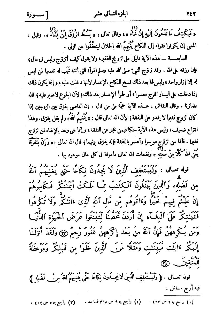 وَلْيَسْتَعْفِفِ الَّذِينَ لَا يَجِدُونَ نِكاحاً حَتَّى يُغْنِيَهُمُ اللَّهُ مِنْ فَضْلِهِ وَالَّذِينَ يَبْتَغُونَ الْكِتابَ مِمَّا مَلَكَتْ أَيْمانُكُمْ فَكاتِبُوهُمْ إِنْ عَلِمْتُمْ فِيهِمْ خَيْراً وَآتُوهُمْ مِنْ مالِ اللَّهِ الَّذِي آتاكُمْ وَلا تُكْرِهُوا فَتَياتِكُمْ عَلَى الْبِغاءِ إِنْ أَرَدْنَ تَحَصُّناً لِتَبْتَغُوا عَرَضَ الْحَياةِ الدُّنْيا وَمَنْ يُكْرِهْهُنَّ فَإِنَّ اللَّهَ مِنْ بَعْدِ إِكْراهِهِنَّ غَفُورٌ رَحِيمٌ (٣٣) وَلَقَدْ أَنْزَلْنا إِلَيْكُمْ آياتٍ مُبَيِّناتٍ وَمَثَلاً مِنَ الَّذِينَ خَلَوْا مِنْ قَبْلِكُمْ وَمَوْعِظَةً لِلْمُتَّقِينَ (٣٤)