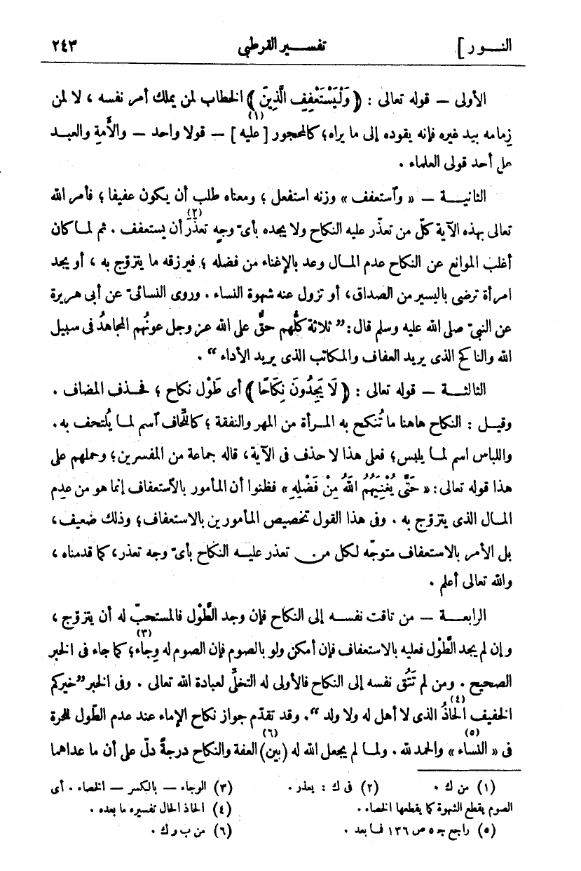 الْأُولَى- قَوْلُهُ تَعَالَى: (وَلْيَسْتَعْفِفِ الَّذِينَ) الْخِطَابُ لِمَنْ يَمْلِكُ أَمْرَ نَفْسِهِ، لَا لِمَنْ زِمَامُهُ بِيَدِ غَيْرِهِ فَإِنَّهُ يَقُودُهُ إِلَى مَا يَرَاهُ، كَالْمَحْجُورِ [عليه «١»]- قَوْلًا وَاحِدًا- وَالْأَمَةُ وَالْعَبْدُ عَلَى أَحَدِ قَوْلَيِ العلماء. الثانية- و" استعفف" وَزْنُهُ اسْتَفْعَلَ، وَمَعْنَاهُ طَلَبَ أَنْ يَكُونَ عَفِيفًا، فَأَمَرَ اللَّهُ تَعَالَى بِهَذِهِ الْآيَةِ كُلَّ مَنْ تَعَذَّرَ عَلَيْهِ النِّكَاحُ وَلَا يَجِدُهُ بِأَيِّ وَجْهٍ تَعَذَّرَ «٢» أَنْ يَسْتَعْفِفَ. ثُمَّ لَمَّا كَانَ أَغْلَبُ الْمَوَانِعِ عَلَى النِّكَاحِ عَدَمَ الْمَالِ وَعَدَ بِالْإِغْنَاءِ مِنْ فَضْلِهِ، فَيَرْزُقُهُ مَا يَتَزَوَّجُ بِهِ، أَوْ يَجِدُ امْرَأَةً تَرْضَى بِالْيَسِيرِ مِنَ الصَّدَاقِ، أَوْ تَزُولُ عَنْهُ شَهْوَةُ النِّسَاءِ. وَرَوَى النَّسَائِيُّ عَنْ أَبِي هُرَيْرَةَ عَنِ النَّبِيِّ صَلَّى اللَّهُ عَلَيْهِ وَسَلَّمَ قَالَ: (ثَلَاثَةٌ كُلُّهُمْ حَقٌّ عَلَى اللَّهِ عَزَّ وَجَلَّ عَوْنُهُمُ الْمُجَاهِدُ فِي سَبِيلِ اللَّهِ وَالنَّاكِحُ الَّذِي يُرِيدُ الْعَفَافَ وَالْمُكَاتَبُ الَّذِي يُرِيدُ الْأَدَاءَ (. الثَّالِثَةُ- قَوْلُهُ تَعَالَى: (لَا يَجِدُونَ نِكاحاً) أَيْ طَوْلَ نِكَاحٍ، فَحُذِفَ الْمُضَافُ. وَقِيلَ: النِّكَاحُ ها هنا مَا تُنْكَحُ بِهِ الْمَرْأَةُ مِنَ الْمَهْرِ وَالنَّفَقَةِ، كَاللِّحَافِ اسْمٌ لِمَا يُلْتَحَفُ بِهِ. وَاللِّبَاسُ اسْمٌ لِمَا يُلْبَسُ، فَعَلَى هَذَا لَا حَذْفَ فِي الْآيَةِ، قَالَهُ جَمَاعَةٌ مِنَ الْمُفَسِّرِينَ، وَحَمَلَهُمْ عَلَى هَذَا قَوْلُهُ تَعَالَى:" حَتَّى يُغْنِيَهُمُ اللَّهُ مِنْ فَضْلِهِ" فَظَنُّوا أَنَّ الْمَأْمُورَ بِالِاسْتِعْفَافِ إِنَّمَا هُوَ مَنْ عَدِمَ الْمَالَ الَّذِي يَتَزَوَّجُ بِهِ. وَفِي هَذَا الْقَوْلِ تَخْصِيصُ الْمَأْمُورِينَ بِالِاسْتِعْفَافِ، وَذَلِكَ ضَعِيفٌ، بَلِ الْأَمْرُ بِالِاسْتِعْفَافِ مُتَوَجِّهٌ لِكُلِّ مَنْ تَعَذَّرَ عَلَيْهِ النِّكَاحُ بِأَيِ وَجْهٍ تَعَذَّرَ، كَمَا قَدَّمْنَاهُ، وَاللَّهُ تَعَالَى أَعْلَمُ. الرَّابِعَةُ- مَنْ تَاقَتْ نَفْسُهُ إِلَى النِّكَاحِ فَإِنْ وَجَدَ الطَّوْلَ فَالْمُسْتَحَبُّ لَهُ أَنْ يَتَزَوَّجَ، وَإِنْ لَمْ يَجِدِ الطَّوْلَ فَعَلَيْهِ بالاستعفاف فإن أَمْكَنَ وَلَوْ بِالصَّوْمِ فَإِنَّ الصَّوْمَ لَهُ وِجَاءٌ «٣»، كَمَا جَاءَ فِي الْخَبَرِ الصَّحِيحِ. وَمَنْ لَمْ تَتُقْ نَفْسُهُ إِلَى النِّكَاحِ فَالْأَوْلَى لَهُ التَّخَلِّي لِعِبَادَةِ اللَّهِ تَعَالَى. وَفِي الْخَبَرِ (خَيْرُكُمُ الْخَفِيفُ الْحَاذِ «٤» الَّذِي لَا أَهْلَ لَهُ وَلَا وَلَدَ). وَقَدْ تَقَدَّمَ جَوَازُ نِكَاحِ الْإِمَاءِ عِنْدَ عَدَمِ الطَّوْلِ لِلْحُرَّةِ فِي" النِّسَاءِ" «٥» وَالْحَمْدُ لِلَّهِ. وَلَمَّا لم يجعل الله له بين «٦» الْعِفَّةِ وَالنِّكَاحِ دَرَجَةً دَلَّ عَلَى أَنَّ مَا عداهما