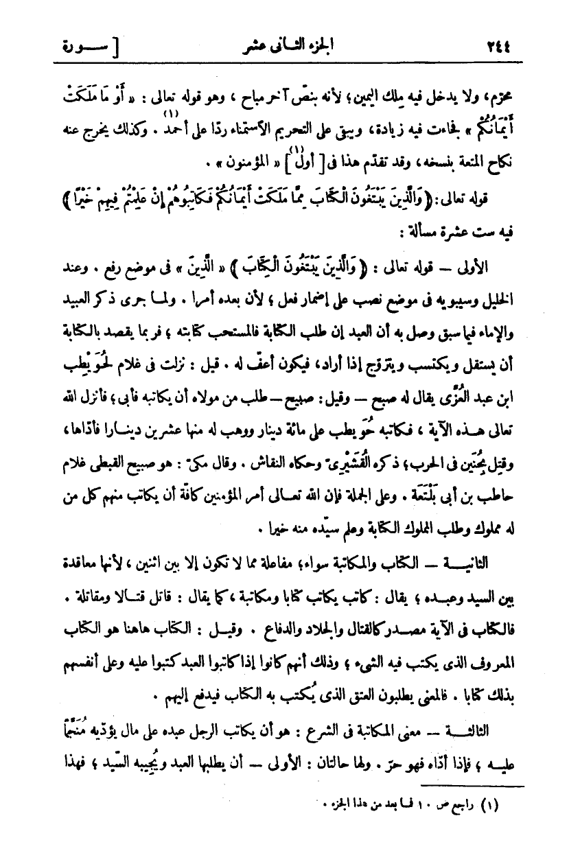 . وَكَذَلِكَ يَخْرُجُ عَنْهُ نِكَاحُ الْمُتْعَةِ بِنَسْخِهِ، وَقَدْ تَقَدَّمَ هذا في [أول «٢»] " الْمُؤْمِنُونَ". قَوْلُهُ تَعَالَى: (وَالَّذِينَ يَبْتَغُونَ الْكِتابَ مِمَّا مَلَكَتْ أَيْمانُكُمْ فَكاتِبُوهُمْ إِنْ عَلِمْتُمْ فِيهِمْ خَيْراً) فِيهِ سِتَّ عَشْرَةَ مَسْأَلَةً: الْأُولَى- قَوْلُهُ تَعَالَى: (وَالَّذِينَ يَبْتَغُونَ الْكِتابَ) " الَّذِينَ" فِي مَوْضِعِ رَفْعٍ. وَعِنْدَ الْخَلِيلِ وَسِيبَوَيْهِ فِي مَوْضِعِ نَصْبٍ عَلَى إِضْمَارِ فِعْلٍ، لِأَنَّ بَعْدَهُ أَمْرًا. وَلَمَّا جَرَى ذِكْرُ الْعَبِيدِ وَالْإِمَاءِ فِيمَا سَبَقَ وُصِلَ بِهِ أَنَّ الْعَبْدَ إِنْ طَلَبَ الْكِتَابَ فَالْمُسْتَحَبُّ كِتَابَتُهُ، فَرُبَّمَا يَقْصِدُ بِالْكِتَابَةِ أَنْ يَسْتَقِلَّ وَيَكْتَسِبَ وَيَتَزَوَّجَ إِذَا أَرَادَ، فَيَكُونَ أَعَفَّ لَهُ. قِيلَ: نَزَلَتْ في غلام لحويطب ابن عَبْدِ الْعُزَّى يُقَالُ لَهُ صُبْحٌ- وَقِيلَ: صُبَيْحٌ- طَلَبَ مِنْ مَوْلَاهُ أَنْ يُكَاتِبَهُ فَأَبَى، فَأَنْزَلَ اللَّهُ تَعَالَى هَذِهِ الْآيَةَ، فَكَاتَبَهُ حُوَيْطِبٌ عَلَى مِائَةِ دِينَارٍ وَوَهَبَ لَهُ مِنْهَا عِشْرِينَ دِينَارًا فَأَدَّاهَا، وَقُتِلَ بِحُنَيْنٍ فِي الْحَرْبِ، ذَكَرَهُ الْقُشَيْرِيُّ وَحَكَاهُ النَّقَّاشُ. وَقَالَ مَكِّيٌّ: هُوَ صُبَيْحٌ الْقِبْطِيُّ غُلَامُ حَاطِبِ بْنِ أَبِي بَلْتَعَةَ. وَعَلَى الْجُمْلَةِ فَإِنَّ اللَّهَ تَعَالَى أَمَرَ الْمُؤْمِنِينَ كَافَّةً أَنْ يُكَاتِبَ مِنْهُمْ كُلُّ مَنْ لَهُ مَمْلُوكٌ وَطَلَبَ الْمَمْلُوكُ الْكِتَابَةَ وَعَلِمَ سَيِّدُهُ مِنْهُ خَيْرًا. الثَّانِيَةُ- الْكِتَابُ وَالْمُكَاتَبَةُ سَوَاءٌ، مُفَاعَلَةٌ مِمَّا لَا تَكُونُ إِلَّا بَيْنَ اثْنَيْنِ، لِأَنَّهَا مُعَاقَدَةٌ بَيْنَ السَّيِّدِ وَعَبْدِهِ، يُقَالُ: كَاتَبَ يُكَاتِبُ كِتَابًا وَمُكَاتَبَةً، كَمَا يُقَالُ: قَاتَلَ قِتَالًا وَمُقَاتَلَةً. فَالْكِتَابُ فِي الْآيَةِ مصدر كالقتال والجلاد والدفاع. وقيل: الكتاب ها هنا هُوَ الْكِتَابُ الْمَعْرُوفُ الَّذِي يُكْتَبُ فِيهِ الشَّيْءُ، وَذَلِكَ أَنَّهُمْ كَانُوا إِذَا كَاتَبُوا الْعَبْدَ كَتَبُوا عَلَيْهِ وَعَلَى أَنْفُسِهِمْ بِذَلِكَ كِتَابًا. فَالْمَعْنَى يَطْلُبُونَ الْعِتْقَ الَّذِي يُكْتَبُ بِهِ الْكِتَابُ فَيُدْفَعُ إِلَيْهِمْ. الثَّالِثَةُ- مَعْنَى الْمُكَاتَبَةِ فِي الشَّرْعِ: هُوَ أَنْ يُكَاتِبَ الرَّجُلُ عَبْدَهُ عَلَى مَالٍ يُؤَدِّيهِ مُنَجَّمًا عَلَيْهِ، فَإِذَا أَدَّاهُ فَهُوَ حُرٌّ. وَلَهَا حَالَتَانِ: الْأُولَى- أَنْ يَطْلُبَهَا الْعَبْدُ وَيُجِيبَهُ السَّيِّدُ، فَهَذَا