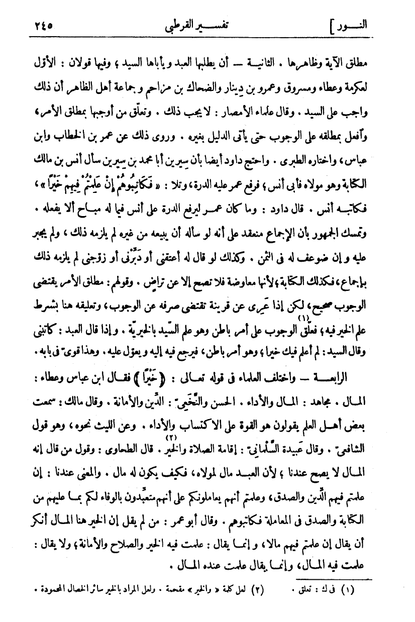 مُطْلَقُ الْآيَةِ وَظَاهِرُهَا. الثَّانِيَةُ- أَنْ يَطْلُبَهَا الْعَبْدُ وَيَأْبَاهَا السَّيِّدُ، وَفِيهَا قَوْلَانِ: الْأَوَّلُ: لِعِكْرِمَةَ وَعَطَاءٍ وَمَسْرُوقٍ وَعَمْرِو بْنِ دِينَارٍ وَالضَّحَّاكِ بْنِ مُزَاحِمٍ وَجَمَاعَةِ أَهْلِ الظَّاهِرِ أَنَّ ذَلِكَ وَاجِبٌ عَلَى السَّيِّدِ. وَقَالَ عُلَمَاءُ الْأَمْصَارِ: لَا يَجِبُ ذَلِكَ. وَتَعَلَّقَ مَنْ أَوْجَبَهَا بِمُطْلَقِ الْأَمْرِ، وَأَفْعَلَ بِمُطْلَقِهِ عَلَى الْوُجُوبِ حَتَّى يَأْتِيَ الدَّلِيلُ بِغَيْرِهِ. وَرُوِيَ ذَلِكَ عَنْ عُمَرَ بْنِ الْخَطَّابِ وَابْنِ عَبَّاسٍ، وَاخْتَارَهُ الطَّبَرِيُّ. وَاحْتَجَّ دَاوُدُ أَيْضًا بِأَنَّ سِيرِينَ أَبَا مُحَمَّدِ بْنِ سِيرِينَ سَأَلَ أَنَسَ بْنَ مَالِكٍ الْكِتَابَةَ وَهُوَ مَوْلَاهُ فَأَبَى أَنَسٌ، فَرَفَعَ عُمَرُ عَلَيْهِ الدِّرَّةَ، وَتَلَا:" فَكاتِبُوهُمْ إِنْ عَلِمْتُمْ فِيهِمْ خَيْراً"، فَكَاتَبَهُ أَنَسٌ. قَالَ دَاوُدُ: وَمَا كَانَ عُمَرُ لِيَرْفَعَ الدِّرَّةَ عَلَى أَنَسٍ فِيمَا لَهُ مُبَاحٌ أَلَّا يَفْعَلَهُ. وَتَمَسَّكَ الْجُمْهُورُ بِأَنَّ الْإِجْمَاعَ مُنْعَقِدٌ عَلَى أَنَّهُ لَوْ سَأَلَهُ أَنْ يَبِيعَهُ مِنْ غَيْرِهِ لَمْ يَلْزَمْهُ ذَلِكَ، وَلَمْ يُجْبَرْ عَلَيْهِ وَإِنْ ضُوعِفَ لَهُ فِي الثَّمَنِ. وَكَذَلِكَ لَوْ قَالَ لَهُ أَعْتِقْنِي أَوْ دَبِّرْنِي أَوْ زَوِّجْنِي لَمْ يَلْزَمْهُ ذَلِكَ بِإِجْمَاعٍ، فَكَذَلِكَ الْكِتَابَةُ، لِأَنَّهَا مُعَاوَضَةٌ فَلَا تَصِحُّ إِلَّا عَنْ تَرَاضٍ. وَقَوْلُهُمْ: مُطْلَقُ الْأَمْرِ يَقْتَضِي الْوُجُوبَ صَحِيحٌ، لَكِنْ إِذَا عَرِيَ عَنْ قَرِينَةٍ تَقْتَضِي صَرْفَهُ عَنِ الْوُجُوبِ، وَتَعْلِيقُهُ هُنَا بِشَرْطِ عِلْمِ الْخَيْرِ فِيهِ، فَعُلِّقَ «١» الْوُجُوبُ عَلَى أَمْرٍ بَاطِنٍ وَهُوَ عِلْمُ السَّيِّدِ بِالْخَيْرِيَّةِ. وَإِذَا قَالَ الْعَبْدُ: كَاتِبْنِي، وَقَالَ السَّيِّدُ: لَمْ أَعْلَمْ فِيكَ خَيْرًا، وَهُوَ أَمْرٌ بَاطِنٌ، فَيُرْجَعُ فِيهِ إِلَيْهِ وَيُعَوَّلُ عَلَيْهِ. وَهَذَا قَوِيٌّ فِي بَابِهِ. الرَّابِعَةُ- وَاخْتَلَفَ الْعُلَمَاءُ فِي قَوْلِهِ تَعَالَى: (خَيْراً) فَقَالَ ابْنُ عَبَّاسٍ وَعَطَاءٌ: الْمَالُ. مُجَاهِدٌ: الْمَالُ وَالْأَدَاءُ. وَالْحَسَنُ وَالنَّخَعِيُّ: الدِّينُ وَالْأَمَانَةُ. وَقَالَ مَالِكٌ: سَمِعْتُ بَعْضَ أَهْلِ الْعِلْمِ يَقُولُونَ هُوَ الْقُوَّةُ عَلَى الِاكْتِسَابِ وَالْأَدَاءُ. وَعَنِ اللَّيْثِ نَحْوُهُ، وَهُوَ قَوْلُ الشَّافِعِيِّ. وَقَالَ عَبِيدَةُ السَّلْمَانِيُّ: إِقَامَةُ الصَّلَاةِ وَالْخَيْرُ «٢». قَالَ الطَّحَاوِيُّ: وَقَوْلُ مَنْ قَالَ إِنَّهُ الْمَالُ لَا يَصِحُّ عِنْدَنَا، لِأَنَّ الْعَبْدَ مَالٌ لِمَوْلَاهُ، فَكَيْفَ يَكُونُ لَهُ مَالٌ. وَالْمَعْنَى عِنْدَنَا: إِنْ عَلِمْتُمْ فِيهِمُ الدِّينَ وَالصِّدْقَ، وَعَلِمْتُمْ أَنَّهُمْ يُعَامِلُونَكُمْ عَلَى أَنَّهُمْ مُتَعَبِّدُونَ بِالْوَفَاءِ لَكُمْ بِمَا عَلَيْهِمْ مِنَ الْكِتَابَةِ وَالصِّدْقِ فِي الْمُعَامَلَةِ فَكَاتِبُوهُمْ. وَقَالَ أَبُو عُمَرَ: مَنْ لَمْ يَقُلْ إِنَّ الْخَيْرَ هُنَا الْمَالُ أَنْكَرَ أَنْ يُقَالَ إِنْ عَلِمْتُمْ فِيهِمْ مَالًا، وَإِنَّمَا يُقَالُ: عَلِمْتُ فِيهِ الْخَيْرَ وَالصَّلَاحَ وَالْأَمَانَةَ، وَلَا يُقَالُ: عَلِمْتُ فِيهِ الْمَالَ، وَإِنَّمَا يُقَالُ علمت عنده المال.