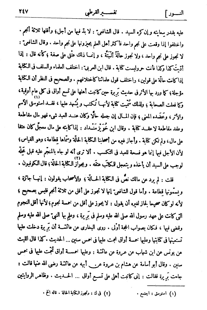 عَلَيْهِ بِقَدْرِ سِعَايَتِهِ وَإِنْ كَرِهَ السَّيِّدُ. قَالَ الشَّافِعِيُّ: لَا بُدَّ فِيهَا مِنْ أَجَلٍ، وَأَقَلُّهَا ثَلَاثَةُ أَنْجُمٍ. وَاخْتَلَفُوا إِذَا وَقَعَتْ عَلَى نَجْمٍ وَاحِدٍ فَأَكْثَرُ أَهْلِ الْعِلْمِ يُجِيزُونَهَا عَلَى نَجْمٍ وَاحِدٍ. وَقَالَ الشَّافِعِيُّ: لَا تَجُوزُ عَلَى نَجْمٍ وَاحِدٍ، وَلَا تَجُوزُ حَالَّةً الْبَتَّةَ، وَإِنَّمَا ذَلِكَ عِتْقٌ عَلَى صِفَةٍ، كَأَنَّهُ قَالَ: إِذَا أَدَّيْتَ كَذَا وَكَذَا فَأَنْتَ حُرٌّ وَلَيْسَتْ كِتَابَةً. قَالَ ابْنُ الْعَرَبِيِّ: اخْتَلَفَ الْعُلَمَاءُ وَالسَّلَفُ فِي الْكِتَابَةِ إِذَا كَانَتْ حَالَّةً عَلَى قَوْلَيْنِ، وَاخْتَلَفَ قَوْلُ عُلَمَائِنَا كَاخْتِلَافِهِمْ. وَالصَّحِيحُ فِي النَّظَرِ أَنَّ الْكِتَابَةَ مُؤَجَّلَةٌ، كَمَا وَرَدَ بِهَا الْأَثَرُ فِي حَدِيثِ بَرِيرَةَ حِينَ كَاتَبَتْ أَهْلَهَا عَلَى تِسْعِ أَوَاقٍ فِي كُلِّ عَامٍ أُوقِيَّةٌ، وَكَمَا فَعَلَتِ الصَّحَابَةُ، وَلِذَلِكَ سُمِّيَتْ كِتَابَةً لِأَنَّهَا تُكْتَبُ وَيُشْهَدُ عَلَيْهَا، فَقَدِ اسْتَوْسَقَ «١» الِاسْمَ وَالْأَثَرَ، وَعَضَّدَهُ الْمَعْنَى، فَإِنَّ الْمَالَ إِنْ جَعَلَهُ حَالًّا وَكَانَ عِنْدَ الْعَبْدِ شي فَهُوَ مَالُ مُقَاطَعَةٍ وَعَقْدُ مُقَاطَعَةٍ لَا عَقْدُ كِتَابَةٍ. وَقَالَ ابْنُ خُوَيْزِ مَنْدَادٍ: إِذَا كَاتَبَهُ عَلَى مَالٍ مُعَجَّلٍ كَانَ عِتْقًا عَلَى مَالٍ، وَلَمْ تَكُنْ كِتَابَةً. وَأَجَازَ غَيْرُهُ مِنْ أَصْحَابِنَا الْكِتَابَةَ الْحَالَّةَ وَسَمَّاهَا قِطَاعَةً، وَهُوَ الْقِيَاسُ، لِأَنَّ الْأَجَلَ فِيهَا إِنَّمَا هُوَ فُسْحَةٌ لِلْعَبْدِ فِي التَّكَسُّبِ. أَلَا تَرَى أَنَّهُ لَوْ جَاءَ بِالْمُنَجَّمِ عَلَيْهِ قَبْلَ مَحِلِّهِ لَوَجَبَ عَلَى السَّيِّدِ أَنْ يأخذه ويتعجل للمكاتب عتقه. وبجواز «٢» الكتابة الحالة، قال الْكُوفِيُّونَ. قُلْتُ: لَمْ يَرِدْ عَنْ مَالِكٍ نَصٌّ فِي الْكِتَابَةِ الْحَالَّةِ، وَالْأَصْحَابُ يَقُولُونَ: إِنَّهَا جَائِزَةٌ، وَيُسَمُّونَهَا قِطَاعَةً. وَأَمَّا قَوْلُ الشَّافِعِيِّ إِنَّهَا لَا تَجُوزُ عَلَى أَقَلِّ مِنْ ثَلَاثَةِ أَنْجُمٍ فَلَيْسَ بِصَحِيحٍ، لِأَنَّهُ لَوْ كَانَ صَحِيحًا لَجَازَ لِغَيْرِهِ أَنْ يَقُولَ: لَا يَجُوزُ عَلَى أَقَلِّ مِنْ خَمْسَةِ نُجُومٍ، لِأَنَّهَا أَقَلُّ النُّجُومِ الَّتِي كَانَتْ عَلَى عَهْدِ رَسُولِ اللَّهِ صَلَّى اللَّهُ عَلَيْهِ وَسَلَّمَ فِي بَرِيرَةَ، وَعَلِمَ بِهَا النَّبِيُّ صَلَّى اللَّهُ عَلَيْهِ وَسَلَّمَ وَقَضَى فِيهَا، فَكَانَ بِصَوَابِ الْحُجَّةِ أَوْلَى. رَوَى الْبُخَارِيُّ عَنْ عَائِشَةَ أَنَّ بَرِيرَةَ دَخَلَتْ عَلَيْهَا تَسْتَعِينُهَا فِي كِتَابَتِهَا وَعَلَيْهَا خَمْسَةُ أَوَاقٍ نُجِّمَتْ عَلَيْهَا فِي خَمْسِ سِنِينَ ... الْحَدِيثَ. كَذَا قَالَ اللَّيْثُ عَنْ يُونُسَ عَنِ ابْنِ شِهَابٍ عَنْ عُرْوَةَ عَنْ عَائِشَةَ: وَعَلَيْهَا خَمْسَةُ أَوَاقٍ نُجِّمَتْ عَلَيْهَا فِي خَمْسِ سِنِينَ. وَقَالَ أَبُو أُسَامَةَ عَنْ هِشَامِ بْنِ عُرْوَةَ عَنْ أَبِيهِ عَنْ عَائِشَةَ رَضِيَ اللَّهُ عَنْهَا قَالَتْ: جَاءَتْ بَرِيرَةُ فَقَالَتْ: إِنِّي كَاتَبْتُ أَهْلِي على تسع أواق ... الحديث. وظاهر الروايتين