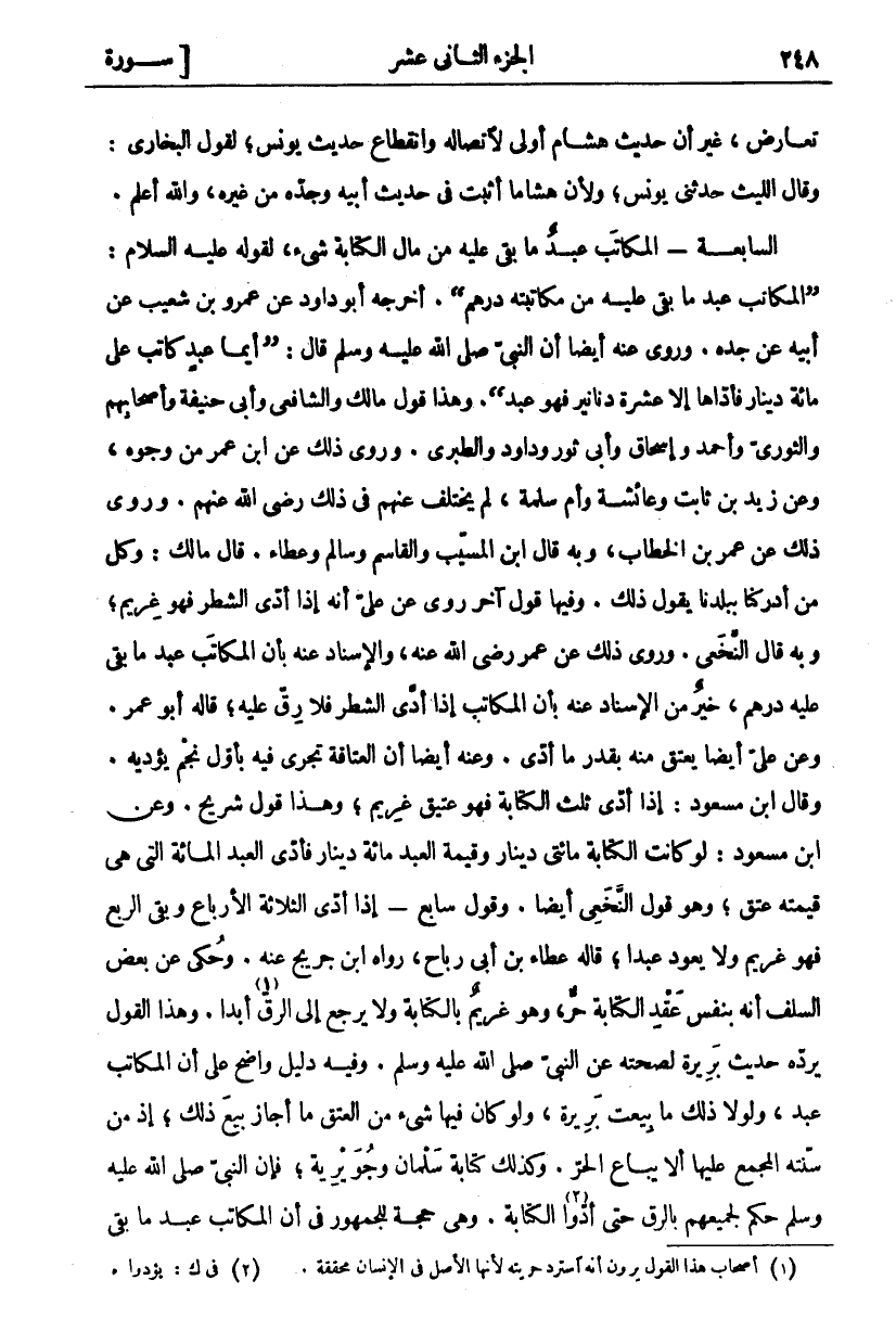 تَعَارُضٌ، غَيْرَ أَنَّ حَدِيثَ هِشَامٍ أَوْلَى لِاتِّصَالِهِ وَانْقِطَاعِ حَدِيثِ يُونُسَ، لِقَوْلِ الْبُخَارِيِّ: وَقَالَ اللَّيْثُ حَدَّثَنِي يُونُسُ، وَلِأَنَّ هِشَامًا أَثْبَتُ فِي حَدِيثِ أَبِيهِ وَجَدِّهِ مِنْ غَيْرِهِ، وَاللَّهُ أَعْلَمُ. السَّابِعَةُ- الْمُكَاتَبُ عَبْدٌ مَا بَقِيَ عَلَيْهِ مِنْ مَالِ الكتابة شي، لِقَوْلِهِ عَلَيْهِ السَّلَامُ: (الْمُكَاتَبُ عَبْدٌ مَا بَقِيَ عليه من مكاتبته درهم). أخرجه أَبُو دَاوُدَ عَنْ عَمْرِو بْنِ شُعَيْبٍ عَنْ أَبِيهِ عَنْ جَدِّهِ. وَرُوِيَ عَنْهُ أَيْضًا أَنَّ النَّبِيَّ صَلَّى اللَّهُ عَلَيْهِ وَسَلَّمَ قَالَ: (أَيُّمَا عَبْدٍ كَاتَبَ عَلَى مِائَةِ دِينَارٍ فَأَدَّاهَا إِلَّا عَشَرَةَ دَنَانِيرَ فَهُوَ عَبْدٌ). وَهَذَا قَوْلُ مَالِكٍ وَالشَّافِعِيِّ وَأَبِي حَنِيفَةَ وَأَصْحَابِهِمْ وَالثَّوْرِيِّ وَأَحْمَدَ وَإِسْحَاقَ وَأَبِي ثَوْرٍ وَدَاوُدَ وَالطَّبَرِيِّ. وَرُوِيَ ذَلِكَ عَنِ ابْنِ عُمَرَ مِنْ وُجُوهٍ، وَعَنْ زَيْدِ بْنِ ثَابِتٍ وَعَائِشَةَ وَأُمِّ سَلَمَةَ، لَمْ يُخْتَلَفْ عَنْهُمْ فِي ذَلِكَ رَضِيَ اللَّهُ عَنْهُمْ. وَرُوِيَ ذَلِكَ عَنْ عُمَرَ بْنِ الْخَطَّابِ، وَبِهِ قَالَ ابْنُ الْمُسَيَّبِ وَالْقَاسِمُ وَسَالِمٌ وَعَطَاءٌ. قَالَ مَالِكٌ: وَكُلُّ مَنْ أَدْرَكْنَا بِبَلَدِنَا يَقُولُ ذَلِكَ. وَفِيهَا قَوْلٌ آخَرُ رُوِيَ عَنْ عَلِيٍّ أَنَّهُ إِذَا أَدَّى الشَّطْرَ فَهُوَ غَرِيمٌ، وَبِهِ قَالَ النَّخَعِيُّ. وَرُوِيَ ذَلِكَ عَنْ عُمَرَ رَضِيَ اللَّهُ عَنْهُ، وَالْإِسْنَادُ عَنْهُ بِأَنَّ الْمُكَاتَبَ عَبْدٌ مَا بَقِيَ عَلَيْهِ دِرْهَمٌ، خَيْرٌ مِنَ الْإِسْنَادِ عَنْهُ بِأَنَّ الْمُكَاتَبَ إِذَا أَدَّى الشَّطْرَ فَلَا رِقَّ عَلَيْهِ، قَالَهُ أَبُو عُمَرَ. وَعَنْ عَلِيٍّ أَيْضًا يَعْتِقُ مِنْهُ بقدر ما أذى. وَعَنْهُ أَيْضًا أَنَّ الْعَتَاقَةَ تَجْرِي فِيهِ بِأَوَّلِ نَجْمٍ يُؤَدِّيهِ. وَقَالَ ابْنُ مَسْعُودٍ: إِذَا أَدَّى ثُلُثَ الْكِتَابَةِ فَهُوَ عَتِيقٌ غَرِيمٌ، وَهَذَا قَوْلُ شُرَيْحٍ. وَعَنِ ابْنِ مَسْعُودٍ: لَوْ كَانَتِ الْكِتَابَةُ مِائَتَيْ دِينَارٍ وَقِيمَةُ الْعَبْدِ مِائَةُ دِينَارٍ فَأَدَّى الْعَبْدُ الْمِائَةَ الَّتِي هِيَ قِيمَتُهُ عُتِقَ، وَهُوَ قَوْلُ النَّخَعِيِّ أَيْضًا. وَقَوْلٌ سَابِعٌ- إِذَا أَدَّى الثَّلَاثَةَ الْأَرْبَاعَ وَبَقِيَ الرُّبْعُ فَهُوَ غَرِيمٌ وَلَا يَعُودُ عَبْدًا، قَالَهُ عَطَاءُ بْنُ أَبِي رَبَاحٍ، رَوَاهُ ابْنُ جُرَيْجٍ عَنْهُ. وَحُكِيَ عَنْ بَعْضِ السَّلَفِ أَنَّهُ بِنَفْسِ عَقْدِ الْكِتَابَةِ حُرٌّ، وَهُوَ غَرِيمٌ بِالْكِتَابَةِ وَلَا يَرْجِعُ إِلَى الرِّقِّ «١» أَبَدًا. وَهَذَا الْقَوْلُ يَرُدُّهُ حَدِيثُ بَرِيرَةَ لِصِحَّتِهِ عَنِ النَّبِيِّ صَلَّى اللَّهُ عَلَيْهِ وَسَلَّمَ. وَفِيهِ دَلِيلٌ وَاضِحٌ عَلَى أَنَّ الْمُكَاتَبَ عَبْدٌ، وَلَوْلَا ذَلِكَ ما بيعت بريرة، ولو كان فيها شي مِنَ الْعِتْقِ مَا أَجَازَ بَيْعَ ذَلِكَ، إِذْ مِنْ سُنَّتِهِ الْمُجْمَعِ عَلَيْهَا أَلَّا يُبَاعَ الْحُرُّ. وَكَذَلِكَ كِتَابَةُ سَلْمَانَ وَجُوَيْرِيَةَ، فَإِنَّ النَّبِيَّ صَلَّى اللَّهُ عَلَيْهِ وَسَلَّمَ حَكَمَ لِجَمِيعِهِمْ بِالرِّقِّ حَتَّى أَدَّوُا «٢» الْكِتَابَةَ. وَهِيَ حُجَّةٌ لِلْجُمْهُورِ فِي أَنَّ المكاتب عبد ما بقي