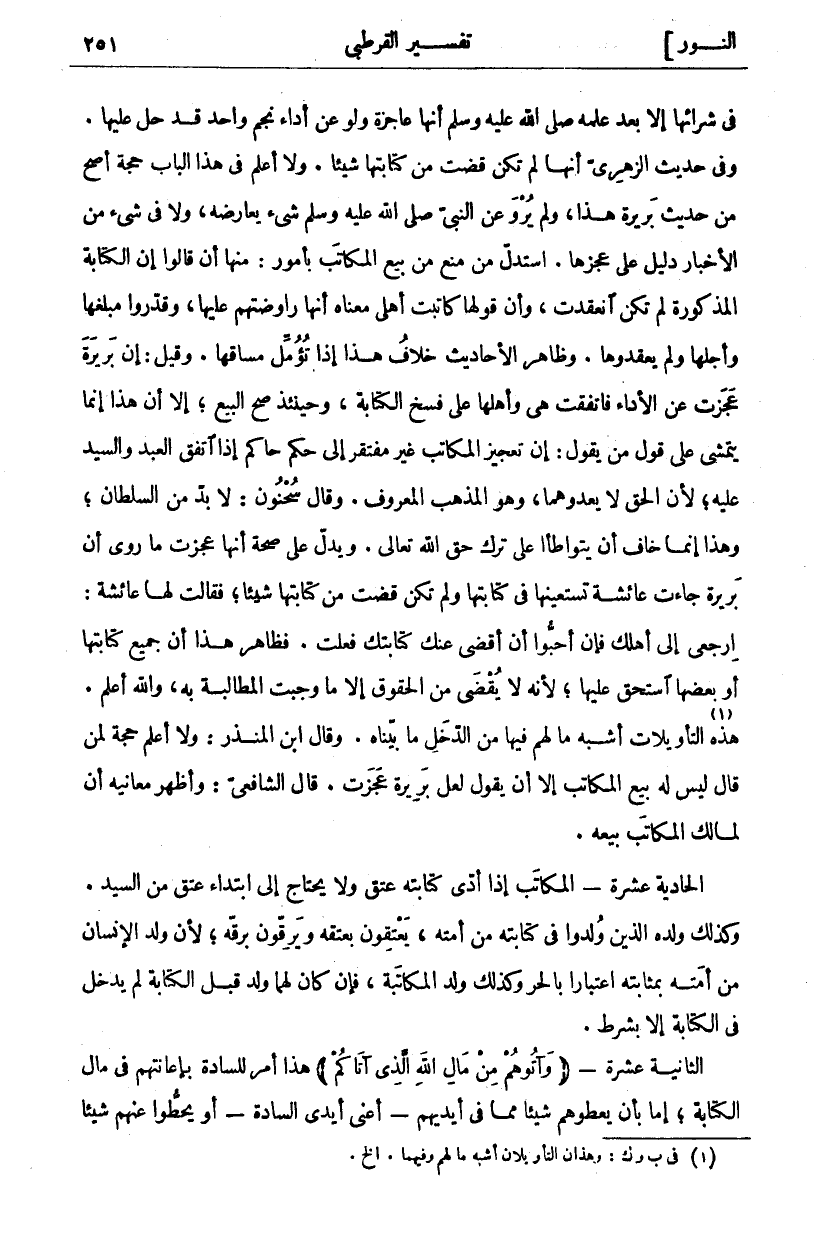 فِي شِرَائِهَا إِلَّا بَعْدَ عِلْمِهِ صَلَّى اللَّهُ عَلَيْهِ وَسَلَّمَ أَنَّهَا عَاجِزَةٌ وَلَوْ عَنْ أَدَاءِ نَجْمٍ وَاحِدٍ قَدْ حَلَّ عَلَيْهَا. وَفِي حَدِيثِ الزُّهْرِيِّ أَنَّهَا لَمْ تَكُنْ قَضَتْ مِنْ كِتَابَتِهَا شَيْئًا. وَلَا أَعْلَمُ فِي هَذَا الْبَابِ حُجَّةً أَصَحَّ مِنْ حَدِيثِ بَرِيرَةَ هَذَا، وَلَمْ يُرْوَ عن النبي صَلَّى اللَّهُ عَلَيْهِ وَسَلَّمَ شي يعارضه، ولا في شي مِنَ الْأَخْبَارِ دَلِيلٌ عَلَى عَجْزِهَا. اسْتَدَلَّ مَنْ مَنَعَ مِنْ بَيْعِ الْمُكَاتَبِ بِأُمُورٍ: مِنْهَا أَنْ قَالُوا إِنَّ الْكِتَابَةَ الْمَذْكُورَةَ لَمْ تَكُنِ انْعَقَدَتْ، وَأَنَّ قَوْلَهَا كَاتَبْتُ أَهْلِي مَعْنَاهُ أَنَّهَا رَاوَضَتْهُمْ عَلَيْهَا، وَقَدَّرُوا مَبْلَغَهَا وَأَجَلَهَا وَلَمْ يَعْقِدُوهَا. وَظَاهِرُ الْأَحَادِيثِ خِلَافُ هَذَا إِذَا تُؤُمِّلَ مَسَاقُهَا. وَقِيلَ: إِنَّ بَرِيرَةَ عَجَزَتْ عَنِ الْأَدَاءِ فَاتَّفَقَتْ هِيَ وَأَهْلُهَا عَلَى فَسْخِ الْكِتَابَةِ، وَحِينَئِذٍ صَحَّ الْبَيْعُ، إِلَّا أَنَّ هَذَا إِنَّمَا يَتَمَشَّى عَلَى قَوْلِ مَنْ يَقُولُ: إِنَّ تَعْجِيزَ الْمُكَاتَبِ غَيْرُ مُفْتَقِرٍ إِلَى حُكْمِ حَاكِمٍ إِذَا اتَّفَقَ الْعَبْدُ وَالسَّيِّدُ عَلَيْهِ، لِأَنَّ الْحَقَّ لَا يَعْدُوهُمَا، وَهُوَ الْمَذْهَبُ الْمَعْرُوفُ. وَقَالَ سَحْنُونٌ: لَا بُدَّ مِنَ السُّلْطَانِ، وَهَذَا إِنَّمَا خَافَ أَنْ يَتَوَاطَآ عَلَى تَرْكِ حَقِّ اللَّهِ تَعَالَى. وَيَدُلُّ عَلَى صِحَّةِ أَنَّهَا عَجَزَتْ مَا رُوِيَ أَنَّ بَرِيرَةَ جَاءَتْ عَائِشَةَ تَسْتَعِينُهَا فِي كِتَابَتِهَا وَلَمْ تَكُنْ قَضَتْ مِنْ كِتَابَتِهَا شَيْئًا، فَقَالَتْ لَهَا عَائِشَةُ: ارْجِعِي إِلَى أَهْلِكِ فَإِنْ أَحَبُّوا أَنْ أَقْضِيَ عَنْكِ كِتَابَتِكِ فَعَلْتُ. فَظَاهِرُ هَذَا أَنَّ جَمِيعَ كِتَابَتِهَا أَوْ بَعْضَهَا اسْتُحِقَّ عَلَيْهَا، لِأَنَّهُ لَا يُقْضَى مِنَ الْحُقُوقِ إِلَّا مَا وَجَبَتِ الْمُطَالَبَةُ بِهِ، وَاللَّهُ أَعْلَمُ. هَذِهِ «١» التَّأْوِيلَاتُ أَشْبَهُ مَا لَهُمْ وَفِيهَا مِنَ الدَّخَلِ مَا بَيَّنَّاهُ. وَقَالَ ابْنُ الْمُنْذِرِ: وَلَا أَعْلَمُ حُجَّةً لِمَنْ قَالَ لَيْسَ لَهُ بَيْعُ الْمُكَاتَبِ إِلَّا أَنْ يَقُولَ لَعَلَّ بَرِيرَةَ عَجَزَتْ. قَالَ الشَّافِعِيُّ: وَأَظْهَرُ مَعَانِيهِ أَنَّ لِمَالِكِ الْمُكَاتَبِ بَيْعَهُ. الْحَادِيَةَ عَشْرَةَ- الْمُكَاتَبُ إِذَا أَدَّى كِتَابَتَهُ عُتِقَ وَلَا يَحْتَاجُ إِلَى ابْتِدَاءِ عِتْقٍ من السيد. كذلك وَلَدُهُ الَّذِينَ وُلِدُوا فِي كِتَابَتِهِ مِنْ أَمَتِهِ، يُعْتَقُونَ بِعِتْقِهِ وَيَرِقُّونَ بِرِقِّهِ، لِأَنَّ وَلَدَ الْإِنْسَانِ مِنْ أَمَتِهِ بِمَثَابَتِهِ اعْتِبَارًا بِالْحُرِّ وَكَذَلِكَ وَلَدُ الْمُكَاتَبَةِ، فَإِنْ كَانَ لَهُمَا وَلَدٌ قَبْلَ الْكِتَابَةِ لَمْ يَدْخُلْ فِي الْكِتَابَةِ إِلَّا بِشَرْطٍ. الثَّانِيَةَ عشرة- (وآتوا هم مِنْ مَالِ اللَّهِ الَّذِي آتَاكُمْ) هَذَا أَمْرٌ لِلسَّادَةِ بِإِعَانَتِهِمْ فِي مَالِ الْكِتَابَةِ، إِمَّا بِأَنْ يُعْطُوهُمْ شَيْئًا مِمَّا فِي أَيْدِيهِمْ- أَعْنِي أَيْدِيَ السادة- أو يحطوا عنهم شيئا