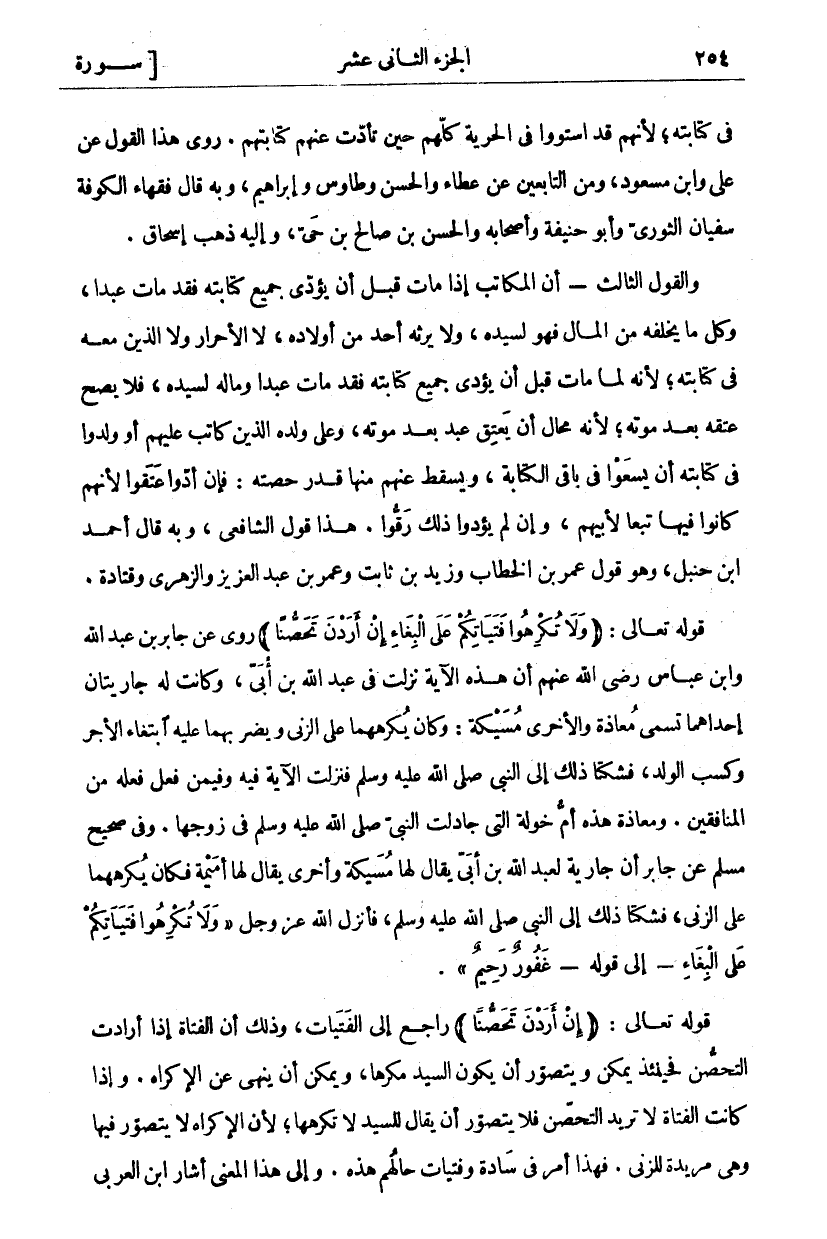 فِي كِتَابَتِهِ لِأَنَّهُمْ قَدِ اسْتَوَوْا فِي الْحُرِّيَّةِ كُلُّهُمْ حِينَ تَأَدَّتْ عَنْهُمْ كِتَابَتُهُمْ. رُوِيَ هَذَا الْقَوْلُ عَنْ عَلِيٍّ وَابْنِ مَسْعُودٍ، وَمِنَ التَّابِعِينَ عَنْ عَطَاءٍ وَالْحَسَنِ وَطَاوُسٍ وَإِبْرَاهِيمَ، وَبِهِ قَالَ فُقَهَاءُ الْكُوفَةِ سُفْيَانُ الثَّوْرِيُّ وَأَبُو حَنِيفَةَ وَأَصْحَابُهُ وَالْحَسَنُ بْنُ صَالِحِ بْنِ حَيٍّ، وَإِلَيْهِ ذَهَبَ إِسْحَاقُ. وَالْقَوْلُ الثَّالِثُ- أَنَّ الْمُكَاتَبَ إِذَا مَاتَ قَبْلَ أَنْ يُؤَدِّيَ جَمِيعَ كِتَابَتِهِ فَقَدْ مَاتَ عَبْدًا، وَكُلُّ مَا يُخَلِّفُهُ مِنَ الْمَالِ فَهُوَ لِسَيِّدِهِ، وَلَا يَرِثُهُ أَحَدٌ مِنْ أَوْلَادِهِ، لَا الْأَحْرَارُ وَلَا الَّذِينَ مَعَهُ فِي كِتَابَتِهِ، لِأَنَّهُ لَمَّا مَاتَ قَبْلَ أَنْ يُؤَدِّيَ جَمِيعَ كِتَابَتِهِ فَقَدْ مَاتَ عَبْدًا وَمَالُهُ لِسَيِّدِهِ، فَلَا يَصِحُّ عِتْقُهُ بَعْدَ مَوْتِهِ، لِأَنَّهُ مُحَالٌ أَنْ يُعْتَقَ عَبْدٌ بَعْدَ مَوْتِهِ، وَعَلَى وَلَدِهِ الَّذِينَ كَاتَبَ عَلَيْهِمْ أَوْ وُلِدُوا فِي كِتَابَتِهِ أَنْ يَسْعَوْا فِي بَاقِي الْكِتَابَةِ، وَيَسْقُطَ عَنْهُمْ مِنْهَا قَدْرَ حِصَّتِهِ، فَإِنْ أَدَّوْا عُتِقُوا لِأَنَّهُمْ كَانُوا فِيهَا تَبَعًا لِأَبِيهِمْ، وَإِنْ لَمْ يُؤَدُّوا ذَلِكَ رَقُّوا. هذا قول الشافعي، وبه قال أحمد ابن حَنْبَلٍ، وَهُوَ قَوْلُ عُمَرَ بْنِ الْخَطَّابِ وَزَيْدِ بْنِ ثَابِتٍ وَعُمَرَ بْنِ عَبْدِ الْعَزِيزِ وَالزُّهْرِيِّ وَقَتَادَةَ. قَوْلُهُ تَعَالَى: (وَلا تُكْرِهُوا فَتَياتِكُمْ عَلَى الْبِغاءِ إِنْ أَرَدْنَ تَحَصُّناً) رُوِيَ عَنْ جَابِرِ بْنِ عَبْدِ اللَّهِ وَابْنِ عَبَّاسٍ رَضِيَ اللَّهُ عَنْهُمْ أَنَّ هَذِهِ الْآيَةَ نَزَلَتْ فِي عَبْدِ اللَّهِ بْنِ أُبَيٍّ، وَكَانَتْ لَهُ جَارِيَتَانِ إِحْدَاهُمَا تُسَمَّى مُعَاذَةَ وَالْأُخْرَى مُسَيْكَةَ، وَكَانَ يُكْرِهُهُمَا عَلَى الزنى وَيَضْرِبُهُمَا عَلَيْهِ ابْتِغَاءَ الْأَجْرِ وَكَسْبِ الْوَلَدِ، فَشَكَتَا ذَلِكَ إِلَى النَّبِيِّ صَلَّى اللَّهُ عَلَيْهِ وَسَلَّمَ فَنَزَلَتِ الْآيَةُ فِيهِ وَفِيمَنْ فَعَلَ فِعْلَهُ مِنَ الْمُنَافِقِينَ. وَمُعَاذَةُ هَذِهِ أُمُّ خَوْلَةَ الَّتِي جَادَلَتِ النَّبِيَّ صَلَّى اللَّهُ عَلَيْهِ وَسَلَّمَ فِي زَوْجِهَا. وَفِي صَحِيحِ مُسْلِمٍ عَنْ جَابِرٍ أَنَّ جَارِيَةً لِعَبْدِ اللَّهِ بْنِ أُبَيٍّ يُقَالُ لَهَا مُسَيْكَةُ وَأُخْرَى يُقَالُ لَهَا أُمَيْمَةُ فَكَانَ يُكْرِهُهُمَا عَلَى الزنى، فَشَكَتَا ذَلِكَ إِلَى النَّبِيِّ صَلَّى اللَّهُ عَلَيْهِ وَسَلَّمَ فَأَنْزَلَ اللَّهُ عَزَّ وَجَلَّ" وَلا تُكْرِهُوا فَتَياتِكُمْ عَلَى الْبِغاءِ"- إِلَى قَوْلِهِ-" غَفُورٌ رَحِيمٌ". قَوْلُهُ تَعَالَى: (إِنْ أَرَدْنَ تَحَصُّناً) رَاجِعٌ إِلَى الْفَتَيَاتِ، وَذَلِكَ أَنَّ الْفَتَاةَ إِذَا أَرَادَتِ التَّحَصُّنَ فَحِينَئِذٍ يُمْكِنُ وَيُتَصَوَّرُ أَنْ يَكُونَ السَّيِّدُ مُكْرِهًا، وَيُمْكِنُ أَنْ يُنْهَى عَنِ الْإِكْرَاهِ. وَإِذَا كَانَتِ الْفَتَاةُ لَا تُرِيدُ التَّحَصُّنَ فَلَا يُتَصَوَّرُ أَنْ يُقَالَ لِلسَّيِّدِ لَا تُكْرِهْهَا، لِأَنَّ الْإِكْرَاهَ لَا يتصور فيها وهى مريدة للزنى. فَهَذَا أَمْرٌ فِي سَادَةٍ وَفَتَيَاتٍ حَالُهُمْ هَذِهِ. وَإِلَى هَذَا الْمَعْنَى أَشَارَ ابْنُ الْعَرَبِيِّ