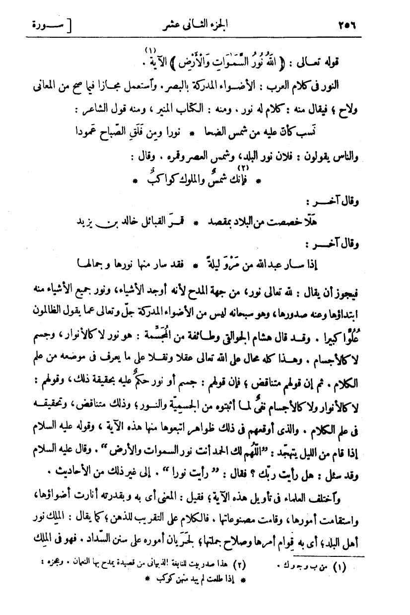 فَيَجُوزُ أَنْ يُقَالَ: لِلَّهِ تَعَالَى نُورٌ مِنْ جِهَةِ الْمَدْحِ لِأَنَّهُ أَوْجَدَ الْأَشْيَاءَ وَنُورُ جَمِيعِ الْأَشْيَاءِ مِنْهُ ابْتِدَاؤُهَا وَعَنْهُ صُدُورُهَا وَهُوَ سُبْحَانَهُ لَيْسَ مِنَ الْأَضْوَاءِ الْمُدْرَكَةِ جَلَّ وَتَعَالَى عَمَّا يَقُولُ الظَّالِمُونَ عُلُوًّا كَبِيرًا. وَقَدْ قَالَ هِشَامٌ الْجُوَالِقِيُّ وَطَائِفَةٌ مِنَ الْمُجَسِّمَةِ: هُوَ نُورٌ لَا كَالْأَنْوَارِ، وَجِسْمٌ لَا كَالْأَجْسَامِ. وَهَذَا كُلُّهُ مُحَالٌ عَلَى اللَّهِ تَعَالَى عَقْلًا وَنَقْلًا عَلَى مَا يُعْرَفُ فِي مَوْضِعِهِ مِنْ عِلْمِ الْكَلَامِ. ثُمَّ إِنَّ قَوْلَهُمْ مُتَنَاقِضٌ، فَإِنَّ قَوْلَهُمْ جِسْمٌ أَوْ نُورٌ حُكْمٌ عَلَيْهِ بِحَقِيقَةِ ذَلِكَ، وَقَوْلُهُمْ لَا كَالْأَنْوَارِ وَلَا كَالْأَجْسَامِ نَفْيٌ لِمَا أَثْبَتُوهُ مِنَ الْجِسْمِيَّةِ وَالنُّورِ، وَذَلِكَ مُتَنَاقِضٌ، وَتَحْقِيقُهُ فِي عِلْمِ الْكَلَامِ. وَالَّذِي أَوْقَعَهُمْ فِي ذَلِكَ ظَوَاهِرُ اتَّبَعُوهَا مِنْهَا هَذِهِ الآية، وقول عَلَيْهِ السَّلَامُ إِذَا قَامَ مِنَ اللَّيْلِ يَتَهَجَّدُ (اللهم لك الحمد أنت نور السموات وَالْأَرْضِ). وَقَالَ عَلَيْهِ السَّلَامُ وَقَدْ سُئِلَ: هَلْ رَأَيْتَ رَبَّكَ؟ فَقَالَ: (رَأَيْتُ نُورًا). إِلَى غَيْرِ ذَلِكَ مِنَ الْأَحَادِيثِ. وَاخْتَلَفَ الْعُلَمَاءُ فِي تَأْوِيلِ هَذِهِ الْآيَةِ، فَقِيلَ: الْمَعْنَى أَيْ بِهِ وَبِقُدْرَتِهِ أَنَارَتْ أَضْوَاؤُهَا، وَاسْتَقَامَتْ أُمُورُهَا، وَقَامَتْ مَصْنُوعَاتُهَا. فَالْكَلَامُ عَلَى التَّقْرِيبِ لِلذِّهْنِ، كَمَا يُقَالُ: الْمَلِكُ نُورُ أَهْلِ الْبَلَدِ، أَيْ بِهِ قِوَامُ أَمْرِهَا وَصَلَاحُ جُمْلَتِهَا، لِجَرَيَانِ أُمُورِهِ عَلَى سَنَنِ السَّدَادِ. فَهُوَ في الملك