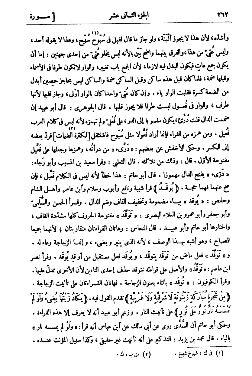 وَأَشَدِّهِ، لِأَنَّ هَذَا لَا يَجُوزُ الْبَتَّةَ، وَلَوْ جَازَ مَا قَالَ لَقِيلَ فِي سُبُّوحٍ «١» سُبِّيحٌ، وَهَذَا لَا يَقُولُهُ أَحَدٌ، وَلَيْسَ عُتِيٌّ مِنْ هَذَا، وَالْفَرْقُ بَيْنَهُمَا وَاضِحٌ بَيِّنٌ، لِأَنَّهُ لَيْسَ يَخْلُو عُتِيٌّ مِنْ إِحْدَى جِهَتَيْنِ: إِمَّا أَنْ يَكُونَ جَمْعَ عَاتٍ فَيَكُونَ الْبَدَلُ فِيهِ لَازِمًا، لِأَنَّ الْجَمْعَ بَابُ تَغْيِيرٍ، وَالْوَاوُ لَا تَكُونُ طَرَفًا فِي الْأَسْمَاءِ وَقَبْلَهَا ضَمَّةٌ، فَلَمَّا كَانَ قَبْلَ هَذِهِ سَاكِنٌ وَقَبْلَ السَّاكِنِ ضَمَّةٌ وَالسَّاكِنُ لَيْسَ بِحَاجِزٍ حَصِينٍ أُبْدِلَ مِنَ الضَّمَّةِ كَسْرَةٌ فَقُلِبَتِ الْوَاوُ يَاءً. وَإِنْ كَانَ عُتِيٌّ وَاحِدًا كَانَ بِالْوَاوِ أَوْلَى، وَجَازَ قَلْبُهَا لِأَنَّهَا طَرَفٌ، وَالْوَاوُ فِي فُعُّولٍ لَيْسَتْ طَرَفًا فَلَا يَجُوزُ قَلْبُهَا. قَالَ الْجَوْهَرِيُّ: قَالَ أَبُو عُبَيْدٍ إِنْ ضَمَمْتَ الدَّالَ قُلْتَ دُرِّيٌّ، يَكُونُ مَنْسُوبًا إِلَى الدُّرِّ، عَلَى فُعْلِيٍّ وَلَمْ تَهْمِزْهُ لِأَنَّهُ لَيْسَ فِي كَلَامِ الْعَرَبِ فُعِّيلٌ. وَمَنْ هَمَزَهُ مِنَ الْقُرَّاءِ فَإِنَّمَا أَرَادَ فُعُّولًا مِثْلَ سُبُّوحٍ فَاسْتُثْقِلَ [لكثرة «٢» الضمات] فَرُدَّ بَعْضُهُ إِلَى الْكَسْرِ. وَحَكَى الْأَخْفَشُ عَنْ بعضهم:" درئ" مِنْ دَرَأْتُهُ، وَهَمَزَهَا وَجَعَلَهَا عَلَى فَعِّيلٍ مَفْتُوحَةَ الْأَوَّلِ. قَالَ: وَذَلِكَ مِنْ تَلَأْلُئِهِ. قَالَ الثَّعْلَبِيُّ: وقرا سعيد بن المسيب وأبو رجاء:" درئ" بِفَتْحِ الدَّالِ مَهْمُوزًا. قَالَ أَبُو حَاتِمٍ: هَذَا خَطَأٌ لِأَنَّهُ لَيْسَ فِي الْكَلَامِ فَعِّيلٌ، فَإِنْ صَحَّ عَنْهُمَا فَهُمَا حُجَّةٌ. (يُوقَدُ) قَرَأَ شَيْبَةُ وَنَافِعٌ وَأَيُّوبُ وَسَلَّامٌ وَابْنُ عَامِرٍ وَأَهْلُ الشَّامِ وَحَفْصٌ:" يُوقَدُ" بِيَاءٍ مَضْمُومَةٍ وَتَخْفِيفِ الْقَافِ وَضَمِّ الدَّالِ. وَقَرَأَ الْحَسَنُ وَالسُّلَمِيُّ وَأَبُو جَعْفَرٍ وَأَبُو عَمْرِو بْنُ الْعَلَاءِ الْبَصْرِيُّ:" تَوَقَّدَ" مَفْتُوحَةَ الْحُرُوفِ كُلِّهَا مُشَدَّدَةَ الْقَافِ، وَاخْتَارَهَا أَبُو حَاتِمٍ وَأَبُو عُبَيْدٍ. قَالَ النَّحَّاسُ: وَهَاتَانِ الْقِرَاءَتَانِ مُتَقَارِبَتَانِ، لِأَنَّهُمَا جَمِيعًا لِلْمِصْبَاحِ، وَهُوَ أَشْبَهُ بِهَذَا الْوَصْفِ، لِأَنَّهُ الَّذِي يُنِيرُ وَيُضِيءُ، وَإِنَّمَا الزُّجَاجَةُ وِعَاءٌ لَهُ. وَ" تَوَقَّدَ" فِعْلٌ مَاضٍ مِنْ تَوَقَّدَ يَتَوَقَّدُ، وَيُوقَدُ فِعْلٌ مُسْتَقْبَلٌ مِنْ أَوْقَدَ يُوقِدُ. وَقَرَأَ نصر ابن عَاصِمٍ:" تُوقَدُ" وَالْأَصْلُ عَلَى قِرَاءَتِهِ تَتَوَقَّدُ حَذْفُ إِحْدَى التَّاءَيْنِ لِأَنَّ الْأُخْرَى تَدُلُّ عَلَيْهَا. وَقَرَأَ الْكُوفِيُّونَ:" تُوقَدُ" بِالتَّاءِ يَعْنُونَ الزُّجَاجَةَ. فَهَاتَانِ الْقِرَاءَتَانِ عَلَى تَأْنِيثِ الزُّجَاجَةِ. (مِنْ شَجَرَةٍ مُبارَكَةٍ زَيْتُونَةٍ لَا شَرْقِيَّةٍ وَلا غَرْبِيَّةٍ) تَقَدَّمَ الْقَوْلُ فِيهِ