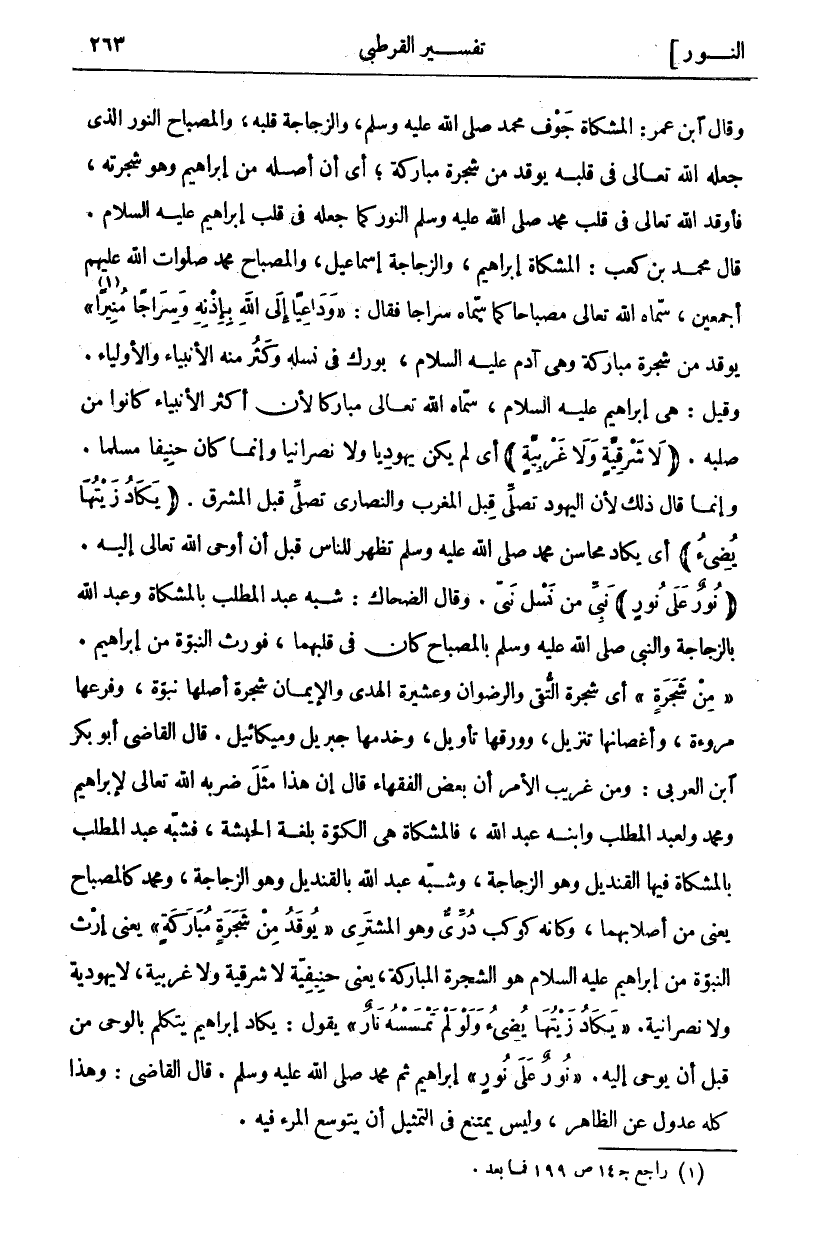 وَقَالَ ابْنُ عُمَرَ: الْمِشْكَاةُ جَوْفُ مُحَمَّدٍ صَلَّى اللَّهُ عَلَيْهِ وَسَلَّمَ، وَالزُّجَاجَةُ قَلْبُهُ، وَالْمِصْبَاحُ النُّورُ الَّذِي جَعَلَهُ اللَّهُ تَعَالَى فِي قَلْبِهِ يُوقَدُ شَجَرَةٍ مُبَارَكَةٍ، أَيْ أَنَّ أَصْلَهُ مِنْ إِبْرَاهِيمَ وَهُوَ شَجَرَتُهُ، فَأَوْقَدَ اللَّهُ تَعَالَى فِي قَلْبِ مُحَمَّدٍ صَلَّى اللَّهُ عَلَيْهِ وَسَلَّمَ النُّورَ كَمَا جَعَلَهُ فِي قَلْبِ إِبْرَاهِيمَ عَلَيْهِ السَّلَامُ. وَقَالَ مُحَمَّدُ بْنُ كَعْبٍ: الْمِشْكَاةُ إِبْرَاهِيمُ، وَالزُّجَاجَةُ إِسْمَاعِيلُ، وَالْمِصْبَاحُ مُحَمَّدٌ صَلَوَاتُ اللَّهِ عَلَيْهِمْ أَجْمَعِينَ، سَمَّاهُ اللَّهُ تَعَالَى مِصْبَاحًا كَمَا سَمَّاهُ سِرَاجًا فَقَالَ:" وَداعِياً إِلَى اللَّهِ بِإِذْنِهِ وَسِراجاً مُنِيراً «١» " [الأحزاب: ٤٦] يُوقَدُ مِنْ شَجَرَةٍ مُبَارَكَةٍ وَهِيَ آدَمُ عَلَيْهِ السَّلَامُ، بُورِكَ فِي نَسْلِهِ وَكَثُرَ مِنْهُ الْأَنْبِيَاءُ وَالْأَوْلِيَاءُ. وَقِيلَ: هِيَ إِبْرَاهِيمُ عَلَيْهِ السَّلَامُ، سَمَّاهُ اللَّهُ تَعَالَى مُبَارَكًا لِأَنَّ أَكْثَرَ الْأَنْبِيَاءِ كَانُوا مِنْ صُلْبِهِ. (لَا شَرْقِيَّةٍ وَلا غَرْبِيَّةٍ) أَيْ لَمْ يَكُنْ يَهُودِيًّا وَلَا نَصْرَانِيًّا وَإِنَّمَا كَانَ حَنِيفًا مُسْلِمًا. وَإِنَّمَا قَالَ ذَلِكَ لِأَنَّ الْيَهُودَ تصلى قبل المغرب والنصارى تصلى فبل المشرق. (يَكادُ زَيْتُها يُضِيءُ) أَيْ يَكَادُ مَحَاسِنُ مُحَمَّدٍ صَلَّى اللَّهُ عَلَيْهِ وَسَلَّمَ تَظْهَرُ لِلنَّاسِ قَبْلَ أَنْ أَوْحَى اللَّهُ تَعَالَى إِلَيْهِ. (نُورٌ عَلى نُورٍ) نَبِيٌّ مِنْ نَسْلِ نَبِيٍّ. وَقَالَ الضَّحَّاكُ: شَبَّهَ عَبْدَ الْمُطَّلِبِ بِالْمِشْكَاةِ وَعَبْدَ اللَّهِ بِالزُّجَاجَةِ وَالنَّبِيَّ صَلَّى اللَّهُ عَلَيْهِ وَسَلَّمَ بِالْمِصْبَاحِ كَانَ فِي قَلْبِهِمَا، فَوَرِثَ النُّبُوَّةَ مِنْ إِبْرَاهِيمَ." مِنْ شَجَرَةٍ" أَيْ شَجَرَةِ التُّقَى وَالرِّضْوَانِ وَعَشِيرَةِ الْهُدَى وَالْإِيمَانِ شَجَرَةٌ أَصْلُهَا نُبُوَّةٌ، وَفَرْعُهَا مُرُوءَةٌ، وَأَغْصَانُهَا تَنْزِيلٌ، وَوَرَقُهَا تَأْوِيلٌ، وَخَدَمُهَا جِبْرِيلُ وَمِيكَائِيلُ. قَالَ الْقَاضِي أَبُو بَكْرِ ابن الْعَرَبِيِّ: وَمِنْ غَرِيبِ الْأَمْرِ أَنَّ بَعْضَ الْفُقَهَاءِ قَالَ إِنَّ هَذَا مَثَلٌ ضَرَبَهُ اللَّهُ تَعَالَى لِإِبْرَاهِيمَ وَمُحَمَّدٍ وَلِعَبْدِ الْمُطَّلِبِ وَابْنِهِ عَبْدِ اللَّهِ، فَالْمِشْكَاةُ هِيَ الْكُوَّةُ بِلُغَةِ الْحَبَشَةِ، فَشُبِّهَ عَبْدُ الْمُطَّلِبِ بِالْمِشْكَاةِ فِيهَا الْقِنْدِيلُ وَهُوَ الزُّجَاجَةُ، وَشُبِّهَ عَبْدُ اللَّهِ بِالْقِنْدِيلِ وَهُوَ الزُّجَاجَةُ، وَمُحَمَّدٌ كَالْمِصْبَاحِ يَعْنِي مِنْ أَصْلَابِهِمَا، وَكَأَنَّهُ كَوْكَبٌ دُرِّيٌّ وَهُوَ الْمُشْتَرِي" يُوقَدُ مِنْ شَجَرَةٍ مُبارَكَةٍ" يَعْنِي إِرْثَ النُّبُوَّةِ مِنْ إِبْرَاهِيمَ عَلَيْهِ السَّلَامُ هُوَ الشَّجَرَةُ الْمُبَارَكَةُ، يَعْنِي حَنِيفِيَّةً لَا شَرْقِيَّةٍ وَلَا غَرْبِيَّةٍ، لا يهودية ولا نصرانية." يَكادُ زَيْتُها يُضِيءُ وَلَوْ لَمْ تَمْسَسْهُ نارٌ" يَقُولُ: يَكَادُ إِبْرَاهِيمُ يَتَكَلَّمُ بِالْوَحْيِ مِنْ قَبْلِ أَنْ يُوحَى إِلَيْهِ." نُورٌ عَلى نُورٍ" إِبْرَاهِيمُ ثُمَّ مُحَمَّدٌ صَلَّى اللَّهُ عَلَيْهِ وَسَلَّمَ. قَالَ الْقَاضِي: وَهَذَا كُلُّهُ عُدُولٌ عَنِ الظَّاهِرِ، وَلَيْسَ يَمْتَنِعُ فِي التَّمْثِيلِ أن يتوسع المرء فيه.