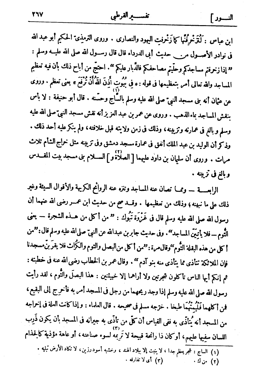 ابْنُ عَبَّاسٍ: لَتُزَخْرِفُنَّهَا كَمَا زَخْرَفَتِ الْيَهُودُ وَالنَّصَارَى. وَرَوَى التِّرْمِذِيُّ الْحَكِيمُ أَبُو عَبْدِ اللَّهِ فِي نَوَادِرِ الْأُصُولِ مِنْ حَدِيثِ أَبِي الدَّرْدَاءِ قَالَ قَالَ رَسُولُ اللَّهِ صَلَّى اللَّهُ عَلَيْهِ وَسَلَّمَ: (إِذَا زَخْرَفْتُمْ مَسَاجِدَكُمْ وَحَلَّيْتُمْ مَصَاحِفَكُمْ فَالدَّبَارُ عَلَيْكُمْ). احْتَجَّ مَنْ أَبَاحَ ذَلِكَ بِأَنَّ فِيهِ تَعْظِيمَ الْمَسَاجِدِ وَاللَّهُ تَعَالَى أَمَرَ بِتَعْظِيمِهَا فِي قَوْلِهِ:" فِي بُيُوتٍ أَذِنَ اللَّهُ أَنْ تُرْفَعَ" يَعْنِي تُعَظَّمَ. وَرُوِيَ عَنْ عُثْمَانَ أَنَّهُ بَنَى مَسْجِدَ النَّبِيِّ صَلَّى اللَّهُ عَلَيْهِ وَسَلَّمَ بِالسَّاجِ «١» وَحَسَّنَهُ. قَالَ أَبُو حَنِيفَةَ: لَا بَأْسَ بِنَقْشِ الْمَسَاجِدِ بِمَاءِ الذَّهَبِ. وَرُوِيَ عَنْ عُمَرَ بْنِ عَبْدِ الْعَزِيزِ أَنَّهُ نَقَشَ مَسْجِدَ النَّبِيِّ صَلَّى اللَّهُ عَلَيْهِ وَسَلَّمَ وَبَالَغَ فِي عِمَارَتِهِ وَتَزْيِينِهِ، وَذَلِكَ فِي زَمَنِ وِلَايَتِهِ قَبْلَ خِلَافَتِهِ، وَلَمْ يُنْكِرْ عَلَيْهِ أَحَدٌ ذَلِكَ. وَذُكِرَ أَنَّ الْوَلِيدَ بْنَ عَبْدِ الْمَلِكِ أَنْفَقَ فِي عِمَارَةِ مَسْجِدِ دِمَشْقَ وَفِي تَزْيِينِهِ مِثْلَ خَرَاجِ الشَّأْمِ ثَلَاثَ مَرَّاتٍ. وروي أن سليمان بن داود عليهما [الصلاة و «٢»] السَّلَامُ بَنَى مَسْجِدَ بَيْتِ الْمَقْدِسِ وَبَالَغَ فِي تَزْيِينِهِ. الرَّابِعَةُ- وَمِمَّا تُصَانُ عَنْهُ الْمَسَاجِدُ وَتُنَزَّهُ عَنْهُ الرَّوَائِحُ الْكَرِيهَةُ وَالْأَقْوَالُ السَّيِّئَةُ وَغَيْرُ ذَلِكَ عَلَى مَا نُبَيِّنُهُ، وَذَلِكَ مِنْ تَعْظِيمِهَا. وَقَدْ صَحَّ مِنْ حَدِيثِ ابْنِ عُمَرَ رَضِيَ اللَّهُ عَنْهُمَا أَنَّ رَسُولَ اللَّهِ صَلَّى اللَّهُ عَلَيْهِ وَسَلَّمَ قَالَ فِي غَزْوَةِ تَبُوكَ: (مَنْ أَكَلَ مِنْ هَذِهِ الشَّجَرَةِ- يَعْنِي الثُّومَ- فَلَا يَأْتِيَنَّ الْمَسَاجِدَ). وَفِي حَدِيثِ جَابِرِ بْنِ عَبْدِ اللَّهِ عَنِ النَّبِيِّ صَلَّى اللَّهُ عَلَيْهِ سلم قَالَ: (مَنْ أَكَلَ مِنْ هَذِهِ الْبَقْلَةِ الثُّومِ) وَقَالَ مَرَّةً: (مَنْ أَكَلَ الْبَصَلَ وَالثُّومَ وَالْكُرَّاثَ فَلَا يَقْرَبَنَّ مَسْجِدَنَا فَإِنَّ الْمَلَائِكَةَ تَتَأَذَّى مِمَّا يَتَأَذَّى مِنْهُ بَنُو آدَمَ). وَقَالَ عُمَرُ بْنُ الْخَطَّابِ رَضِيَ اللَّهُ عَنْهُ فِي خُطْبَتِهِ: (ثُمَّ إِنَّكُمْ أَيُّهَا النَّاسُ تَأْكُلُونَ شَجَرَتَيْنِ وَلَا أَرَاهُمَا إِلَّا خَبِيثَتَيْنِ، هَذَا الْبَصَلُ وَالثُّومُ، لَقَدْ رَأَيْتُ رَسُولَ اللَّهِ صَلَّى اللَّهُ عَلَيْهِ وَسَلَّمَ إذا وَجَدَ رِيحَهُمَا مِنْ رَجُلٍ فِي الْمَسْجِدِ أَمَرَ بِهِ فَأُخْرِجَ إِلَى الْبَقِيعِ، فَمَنْ أَكَلَهُمَا فَلْيُمِتْهُمَا طَبْخًا. خَرَّجَهُ مُسْلِمٌ فِي صَحِيحِهِ. قَالَ الْعُلَمَاءُ: وَإِذَا كَانَتِ الْعِلَّةُ فِي إِخْرَاجِهِ مِنَ الْمَسْجِدِ أَنَّهُ يُتَأَذَّى بِهِ فَفِي الْقِيَاسِ أَنَّ كُلَّ مَنْ تَأَذَّى بِهِ جِيرَانُهُ فِي الْمَسْجِدِ بِأَنْ يَكُونَ ذَرِبَ اللِّسَانِ سَفِيهًا عَلَيْهِمْ، أَوْ كَانَ ذَا رَائِحَةٍ قَبِيحَةٍ لَا تَرِيمُهُ «٣» لِسُوءِ صِنَاعَتِهِ، أو عاهة مؤذية كالجذاء