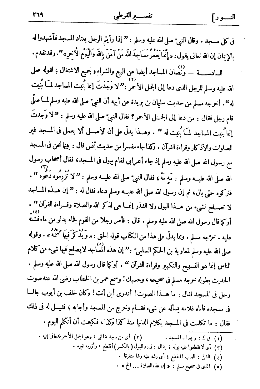فِي كُلِّ مَسْجِدٍ. وَقَالَ النَّبِيُّ صَلَّى اللَّهُ عَلَيْهِ وَسَلَّمَ: (إِذَا رَأَيْتُمُ الرَّجُلَ يَعْتَادُ الْمَسْجِدَ فَاشْهَدُوا لَهُ بِالْإِيمَانِ) إِنَّ اللَّهَ تَعَالَى يَقُولُ:" إِنَّما يَعْمُرُ مَساجِدَ اللَّهِ مَنْ آمَنَ بِاللَّهِ وَالْيَوْمِ الْآخِرِ" [التوبة: ١٨]. وَقَدْ تَقَدَّمَ. السَّادِسَةُ: وَتُصَانُ «١» الْمَسَاجِدُ أَيْضًا عَنِ الْبَيْعِ وَالشِّرَاءِ وَجَمِيعِ الِاشْتِغَالِ، لِقَوْلِهِ صَلَّى اللَّهُ عَلَيْهِ وَسَلَّمَ لِلرَّجُلِ الَّذِي دَعَا إِلَى الْجَمَلِ الْأَحْمَرِ «٢»: (لَا وَجَدْتَ إِنَّمَا بُنِيَتِ الْمَسَاجِدُ لِمَا بُنِيَتْ لَهُ). أَخْرَجَهُ مُسْلِمٌ مِنْ حَدِيثِ سُلَيْمَانَ بْنِ بُرَيْدَةَ عَنْ أَبِيهِ أَنَّ النَّبِيَّ صَلَّى اللَّهُ عَلَيْهِ وَسَلَّمَ لَمَّا صَلَّى قَامَ رَجُلٌ فَقَالَ: مَنْ دَعَا إِلَى الْجَمَلِ الْأَحْمَرِ؟ فَقَالَ النَّبِيُّ صَلَّى اللَّهُ عَلَيْهِ وَسَلَّمَ: (لَا وَجَدْتَ إِنَّمَا بُنِيَتِ الْمَسَاجِدُ لِمَا بُنِيَتْ لَهُ). وَهَذَا يَدُلُّ عَلَى أَنَّ الْأَصْلَ أَلَّا يُعْمَلَ فِي الْمَسْجِدِ غَيْرُ الصَّلَوَاتِ وَالْأَذْكَارِ وَقِرَاءَةِ الْقُرْآنِ. وَكَذَا جَاءَ مُفَسَّرًا مِنْ حَدِيثِ أَنَسٍ قَالَ: بَيْنَمَا نَحْنُ فِي الْمَسْجِدِ مَعَ رَسُولِ اللَّهِ صَلَّى اللَّهُ عَلَيْهِ وَسَلَّمَ إِذْ جَاءَ أَعْرَابِيٌّ فَقَامَ يَبُولُ فِي الْمَسْجِدِ، فَقَالَ أَصْحَابِ رَسُولِ اللَّهِ صَلَّى اللَّهُ عَلَيْهِ وَسَلَّمَ: مَهْ مَهْ، فَقَالَ النَّبِيُّ صَلَّى اللَّهُ عَلَيْهِ وَسَلَّمَ: (لَا تُزْرِمُوهُ دَعُوهُ) «٣». فَتَرَكُوهُ حَتَّى بَالَ، ثُمَّ إِنَّ رَسُولَ اللَّهِ صَلَّى اللَّهُ عَلَيْهِ وَسَلَّمَ دَعَاهُ فَقَالَ لَهُ: (إِنَّ هَذِهِ الْمَسَاجِدَ لَا تَصْلُحُ لِشَيْءٍ مِنَ هَذَا الْبَوْلِ وَلَا الْقَذَرِ إِنَّمَا هِيَ لِذِكْرِ اللَّهِ وَالصَّلَاةِ وَقِرَاءَةِ الْقُرْآنِ). أَوْ كَمَا قَالَ رَسُولُ اللَّهِ صَلَّى اللَّهُ عَلَيْهِ وَسَلَّمَ. قَالَ: فَأَمَرَ رَجُلًا مِنَ الْقَوْمِ فَجَاءَ بِدَلْوٍ مِنْ مَاءٍ فَشَنَّهُ «٤» عَلَيْهِ. خَرَّجَهُ مُسْلِمٌ. وَمِمَّا يدل على هذا من الكتاب قول الْحَقُّ:" وَيُذْكَرَ فِيهَا اسْمُهُ". وَقَوْلُهُ صَلَّى اللَّهُ عَلَيْهِ وَسَلَّمَ لِمُعَاوِيَةَ بْنِ الْحَكَمِ السُّلَمِيِّ: (إِنَّ هذه المساجد «٥» لا يصلح فيها شي مِنْ كَلَامِ النَّاسِ إِنَّمَا هُوَ التَّسْبِيحُ وَالتَّكْبِيرُ وقراءة القرآن). أَوْ كَمَا قَالَ رَسُولُ اللَّهِ صَلَّى اللَّهُ عَلَيْهِ وَسَلَّمَ. الْحَدِيثَ بِطُولِهِ خَرَّجَهُ مُسْلِمٌ فِي صَحِيحِهِ، وَحَسْبُكَ وَسَمِعَ عُمَرُ بْنُ الْخَطَّابِ رَضِيَ اللَّهُ عَنْهُ صَوْتَ رَجُلٍ فِي الْمَسْجِدِ فَقَالَ: مَا هَذَا الصَّوْتُ؟ أَتَدْرِي أَيْنَ أَنْتَ! وَكَانَ خَلَفُ بْنُ أَيُّوبَ جَالِسًا فِي مسجده فأتاه غلامه يسأله عن شي فَقَامَ وَخَرَجَ مِنَ الْمَسْجِدِ وَأَجَابَهُ، فَقِيلَ لَهُ فِي ذَلِكَ فَقَالَ: مَا تَكَلَّمْتُ فِي الْمَسْجِدِ بِكَلَامِ الدُّنْيَا مُنْذُ كَذَا وَكَذَا، فَكَرِهْتُ أَنْ أتكلم اليوم.