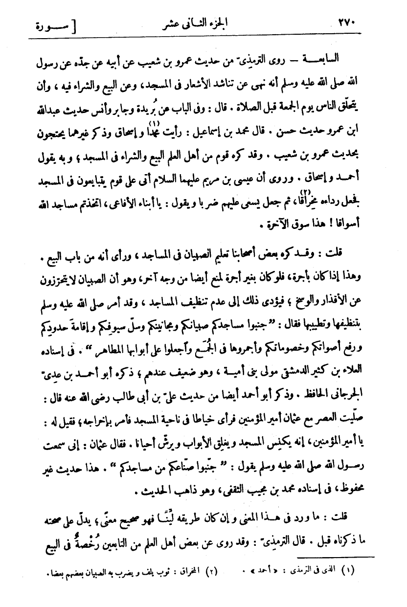 السَّابِعَةُ: رَوَى التِّرْمِذِيُّ مِنْ حَدِيثِ عَمْرِو بْنِ شُعَيْبٍ عَنْ أَبِيهِ عَنْ جَدِّهِ عَنْ رَسُولِ اللَّهِ صَلَّى اللَّهُ عَلَيْهِ وَسَلَّمَ أَنَّهُ نَهَى عَنْ تَنَاشُدِ الْأَشْعَارِ فِي الْمَسْجِدِ، وَعَنِ الْبَيْعِ وَالشِّرَاءِ فِيهِ، وَأَنْ يَتَحَلَّقَ النَّاسُ يَوْمَ الْجُمُعَةِ قَبْلَ الصَّلَاةِ. قَالَ: وَفِي الْبَابِ عَنْ بُرَيْدَةَ وجابر وأنس حديث عبد الله بن عمر وحديث حَسَنٌ. قَالَ مُحَمَّدُ بْنُ إِسْمَاعِيلَ: رَأَيْتُ مُحَمَّدًا «١» وَإِسْحَاقَ وَذَكَرَ غَيْرَهُمَا يَحْتَجُّونَ بِحَدِيثِ عَمْرِو بْنِ شُعَيْبٍ. وَقَدْ كَرِهَ قَوْمٌ مِنْ أَهْلِ الْعِلْمِ الْبَيْعَ وَالشِّرَاءَ فِي الْمَسْجِدِ، وَبِهِ يَقُولُ أَحْمَدُ وَإِسْحَاقُ. وَرُوِيَ أَنَّ عِيسَى ابْنَ مَرْيَمَ عَلَيْهِمَا السَّلَامُ أَتَى عَلَى قَوْمٍ يَتَبَايَعُونَ فِي الْمَسْجِدِ فَجَعَلَ رِدَاءَهُ مِخْرَاقًا «٢»، ثُمَّ جَعَلَ يَسْعَى عَلَيْهِمْ ضَرْبًا وَيَقُولُ: يَا أَبْنَاءَ الْأَفَاعِي، اتَّخَذْتُمْ مَسَاجِدَ اللَّهِ أَسْوَاقًا هَذَا سُوقُ الْآخِرَةِ. قُلْتُ: وَقَدْ كَرِهَ بَعْضُ أَصْحَابِنَا تَعْلِيمَ الصِّبْيَانِ فِي الْمَسَاجِدِ، وَرَأَى أَنَّهُ مِنْ بَابِ الْبَيْعِ. وَهَذَا إِذَا كَانَ بِأُجْرَةٍ، فَلَوْ كَانَ بِغَيْرِ أُجْرَةٍ لَمُنِعَ أَيْضًا مِنْ وَجْهٍ آخَرَ، وَهُوَ أَنَّ الصِّبْيَانَ لَا يَتَحَرَّزُونَ عَنِ الْأَقْذَارِ وَالْوَسَخِ، فَيُؤَدِّي ذَلِكَ إِلَى عَدَمِ تَنْظِيفِ الْمَسَاجِدِ، وَقَدْ أَمَرَ صَلَّى اللَّهُ عَلَيْهِ وَسَلَّمَ بِتَنْظِيفِهَا وَتَطْيِيبِهَا فَقَالَ: (جَنِّبُوا مَسَاجِدَكُمْ صِبْيَانَكُمْ وَمَجَانِينَكُمْ وَسَلَّ سُيُوفِكُمْ وَإِقَامَةَ حُدُودِكُمْ وَرَفْعَ أَصْوَاتِكُمْ وَخُصُومَاتِكُمْ وَأَجْمِرُوهَا فِي الْجُمَعِ وَاجْعَلُوا عَلَى أَبْوَابِهَا الْمَطَاهِرَ (. فِي إِسْنَادِهِ الْعَلَاءُ بْنُ كَثِيرٍ الدِّمَشْقِيُّ مَوْلَى بَنِي أُمَيَّةَ، وَهُوَ ضَعِيفٌ عِنْدَهُمْ، ذَكَرَهُ أَبُو أَحْمَدَ بْنُ عَدِيٍّ الْجُرْجَانِيُّ الْحَافِظُ. وَذَكَرَ أَبُو أَحْمَدَ أَيْضًا مِنْ حَدِيثِ عَلِيِّ بْنِ أَبِي طَالِبٍ رَضِيَ الله عنه قال: صليت صَلَّيْتُ الْعَصْرَ مَعَ عُثْمَانَ أَمِيرِ الْمُؤْمِنِينَ فَرَأَى خَيَّاطًا فِي نَاحِيَةِ الْمَسْجِدِ فَأَمَرَ بِإِخْرَاجِهِ، فَقِيلَ لَهُ: يَا أَمِيرَ الْمُؤْمِنِينَ، إِنَّهُ يَكْنُسُ الْمَسْجِدَ وَيُغْلِقُ الْأَبْوَابَ وَيَرُشُّ أَحْيَانًا. فَقَالَ عُثْمَانُ: إِنِّي سَمِعْتُ رَسُولَ اللَّهِ صَلَّى اللَّهُ عَلَيْهِ وَسَلَّمَ يَقُولُ: (جَنِّبُوا صُنَّاعَكُمْ مِنْ مَسَاجِدِكُمْ). هَذَا حَدِيثٌ غَيْرُ مَحْفُوظٍ، فِي إِسْنَادِهِ مُحَمَّدُ بْنُ مُجِيبٍ الثَّقَفِيُّ، وَهُوَ ذَاهِبُ الْحَدِيثِ. قُلْتُ: مَا وَرَدَ فِي هَذَا الْمَعْنَى وَإِنْ كَانَ طَرِيقُهُ لَيِّنًا فَهُوَ صَحِيحٌ مَعْنًى، يَدُلُّ عَلَى صِحَّتِهِ مَا ذَكَرْنَاهُ قَبْلُ. قَالَ التِّرْمِذِيُّ: وَقَدْ رُوِيَ عَنْ بعض أهل العالم من التابعين رخصة في البيع
