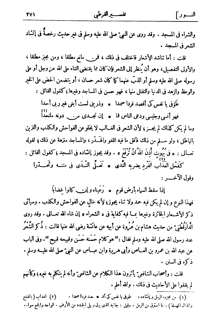 وَالشِّرَاءِ فِي الْمَسْجِدِ. وَقَدْ رُوِيَ عَنِ النَّبِيِّ صَلَّى اللَّهُ عَلَيْهِ وَسَلَّمَ فِي غَيْرِ حَدِيثٍ رُخْصَةٌ فِي إِنْشَادِ الشِّعْرِ فِي الْمَسْجِدِ. قُلْتُ: أَمَّا تَنَاشُدُ الْأَشْعَارِ فَاخْتُلِفَ فِي ذَلِكَ، فَمِنْ مَانِعٍ مُطْلَقًا، وَمِنْ مُجِيزٍ مُطْلَقًا، وَالْأَوْلَى التَّفْصِيلُ، وَهُوَ أَنْ يُنْظَرَ إِلَى الشِّعْرِ فَإِنْ كَانَ مِمَّا يَقْتَضِي الثَّنَاءَ عَلَى اللَّهِ عَزَّ وَجَلَّ أَوْ عَلَى رَسُولِهِ صَلَّى اللَّهُ عَلَيْهِ وَسَلَّمَ أَوِ الذَّبَّ عَنْهُمَا كَمَا كَانَ شِعْرُ حَسَّانَ، أَوْ يَتَضَمَّنُ الْحَضَّ عَلَى الْخَيْرِ وَالْوَعْظَ وَالزُّهْدَ فِي الدُّنْيَا وَالتَّقَلُّلَ مِنْهَا، فَهُوَ حَسَنٌ فِي الْمَسَاجِدِ وَغَيْرِهَا، كَقَوْلِ الْقَائِلِ: