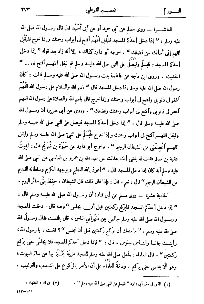 العاشرة- روى مسلم عن أبى حميد أَوْ عَنْ أَبِي أُسَيْدٍ قَالَ: قَالَ رَسُولُ اللَّهِ صَلَّى اللَّهُ عَلَيْهِ وَسَلَّمَ: (إِذَا دَخَلَ أَحَدُكُمُ الْمَسْجِدَ فَلْيَقُلِ اللَّهُمَّ افْتَحْ لِي أَبْوَابَ رَحْمَتِكَ وَإِذَا خَرَجَ فَلْيَقُلِ اللَّهُمَّ إِنِّي أَسْأَلُكَ مِنْ فَضْلِكَ). خَرَّجَهُ أَبُو دَاوُدَ كَذَلِكَ، إِلَّا أَنَّهُ زَادَ بَعْدَ قَوْلِهِ: (إِذَا دَخَلَ أَحَدُكُمُ الْمَسْجِدَ: فَلْيُسَلِّمْ وَلْيُصَلِّ «١» عَلَى النَّبِيِّ صَلَّى اللَّهُ عَلَيْهِ وَسَلَّمَ ثُمَّ لِيَقُلِ اللَّهُمَّ افْتَحْ لِي ... ) الْحَدِيثَ. وَرَوَى ابْنُ مَاجَهْ عَنْ فَاطِمَةُ بِنْتِ رَسُولِ اللَّهِ صَلَّى اللَّهُ عَلَيْهِ وَسَلَّمَ قَالَتْ: كَانَ رَسُولُ اللَّهِ صَلَّى اللَّهُ عَلَيْهِ وَسَلَّمَ إِذَا دَخَلَ الْمَسْجِدَ قَالَ: (بِاسْمِ اللَّهِ وَالسَّلَامُ عَلَى رَسُولِ اللَّهِ اللَّهُمَّ اغْفِرْ لِي ذُنُوبِي وَافْتَحْ لِي أَبْوَابَ رَحْمَتِكَ وَإِذَا خَرَجَ قَالَ بِاسْمِ اللَّهِ وَالصَّلَاةُ عَلَى رَسُولِ اللَّهِ اللَّهُمَّ اغْفِرْ لِي ذُنُوبِي وَافْتَحْ لِي أَبْوَابَ رَحْمَتِكَ وَفَضْلِكَ". وَرُوِيَ عَنْ أَبِي هُرَيْرَةَ أَنَّ رَسُولَ اللَّهِ صَلَّى اللَّهُ عَلَيْهِ وَسَلَّمَ قَالَ: (إِذَا دَخَلَ أَحَدُكُمُ الْمَسْجِدَ فَلْيُصَلِّ عَلَى النَّبِيِّ صَلَّى اللَّهُ عَلَيْهِ وَسَلَّمَ وَلْيَقُلِ اللَّهُمَّ افْتَحْ لِي أَبْوَابَ رَحْمَتِكَ وَإِذَا خَرَجَ فَلْيُسَلِّمْ عَلَى النَّبِيِّ صَلَّى اللَّهُ عَلَيْهِ وَسَلَّمَ وَلْيَقُلِ اللَّهُمَّ اعْصِمْنِي مِنَ الشَّيْطَانِ الرَّجِيمِ (. وَخَرَّجَ أَبُو دَاوُدَ عَنْ حَيْوَةَ بْنِ شُرَيْحٍ قَالَ: لَقِيتُ عُقْبَةَ بْنَ مُسْلِمٍ فَقُلْتُ لَهُ بَلَغَنِي أَنَّكَ حَدَّثْتَ عَنْ عبد الله بن عمرو بن العاصي عَنِ النَّبِيِّ صَلَّى اللَّهُ عَلَيْهِ وَسَلَّمَ أَنَّهُ كَانَ إِذَا دَخَلَ الْمَسْجِدَ قَالَ: (أَعُوذُ بِاللَّهِ الْعَظِيمِ وَبِوَجْهِهِ الْكَرِيمِ وَسُلْطَانِهِ الْقَدِيمِ مِنَ الشَّيْطَانِ الرَّجِيمِ) قَالَ نَعَمْ. قَالَ: فَإِذَا قَالَ ذَلِكَ قَالَ الشَّيْطَانُ: حُفِظَ مِنِّي سَائِرَ الْيَوْمِ. الْحَادِيَةَ عَشْرَةَ- رَوَى مُسْلِمٌ عَنْ أَبِي قَتَادَةَ أَنَّ رَسُولَ اللَّهِ صَلَّى عَلَيْهِ وَسَلَّمَ قَالَ: (إِذَا دَخَلَ أَحَدُكُمُ الْمَسْجِدَ فَلْيَرْكَعْ رَكْعَتَيْنِ قَبْلَ أَنْ يَجْلِسَ) وَعَنْهُ قَالَ: دَخَلْتُ الْمَسْجِدَ وَرَسُولُ اللَّهِ صَلَّى اللَّهُ عَلَيْهِ وَسَلَّمَ جَالِسٌ بَيْنَ ظَهْرَانَيِ النَّاسِ، قَالَ فَجَلَسْتُ فَقَالَ رَسُولُ اللَّهِ صَلَّى اللَّهُ عَلَيْهِ وَسَلَّمَ: (مَا مَنَعَكَ أَنْ تَرْكَعَ رَكْعَتَيْنِ قَبْلَ أَنْ تَجْلِسَ)؟ فَقُلْتُ: يَا رَسُولَ اللَّهِ، رَأَيْتُكَ جَالِسًا وَالنَّاسُ جُلُوسٌ. قَالَ: (فَإِذَا دَخَلَ أَحَدُكُمُ الْمَسْجِدَ فَلَا يَجْلِسْ حَتَّى يَرْكَعَ رَكْعَتَيْنِ). قَالَ الْعُلَمَاءُ: فَجَعَلَ صَلَّى اللَّهُ عَلَيْهِ وَسَلَّمَ لِلْمَسْجِدِ مَزِيَّةً يَتَمَيَّزُ بِهَا عَنْ سَائِرِ الْبُيُوتِ، وَهُوَ أَلَّا يَجْلِسَ حَتَّى يَرْكَعَ. وَعَامَّةُ الْعُلَمَاءِ «٢» عَلَى أَنَّ الْأَمْرَ بِالرُّكُوعِ عَلَى النَّدْبِ والترغيب.