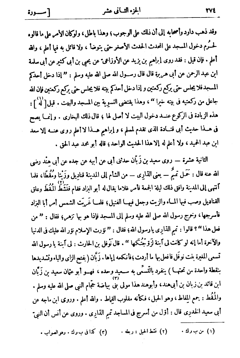 وَقَدْ ذَهَبَ دَاوُدُ وَأَصْحَابُهُ إِلَى أَنَّ ذَلِكَ عَلَى الْوُجُوبِ، وَهَذَا بَاطِلٌ، وَلَوْ كَانَ الْأَمْرُ عَلَى مَا قَالُوهُ لَحَرُمَ دُخُولُ الْمَسْجِدِ عَلَى الْمُحْدِثِ الْحَدَثَ الْأَصْغَرَ حَتَّى يَتَوَضَّأَ، وَلَا قَائِلَ بِهِ فِيمَا أَعْلَمُ، وَاللَّهُ أَعْلَمُ. فَإِنْ قِيلَ: فَقَدْ رَوَى إِبْرَاهِيمُ بْنُ يَزِيدَ عَنِ الْأَوْزَاعِيِّ عَنْ يَحْيَى بْنِ أَبِي كَثِيرَ عَنْ أَبِي سَلَمَةَ عَنْ عَبْدِ الرَّحْمَنِ عَنْ أَبِي هُرَيْرَةَ قَالَ قَالَ رَسُولُ اللَّهِ صَلَّى اللَّهُ عَلَيْهِ وَسَلَّمَ: (إِذَا دَخَلَ أَحَدُكُمُ الْمَسْجِدَ فَلَا يَجْلِسْ حَتَّى يَرْكَعَ رَكْعَتَيْنِ وَإِذَا دَخَلَ أَحَدُكُمْ بَيْتَهُ فَلَا يَجْلِسْ حَتَّى يَرْكَعَ رَكْعَتَيْنِ فَإِنَّ اللَّهَ جَاعِلٌ مِنْ رَكْعَتَيْهِ فِي بَيْتِهِ خَيْرًا (، وَهَذَا يقتضى التسوية بين المسجد والبيت. قيل [له «١»]: هَذِهِ الزِّيَادَةُ فِي الرُّكُوعِ عِنْدَ دُخُولِ الْبَيْتِ لَا أَصْلَ لَهَا، قَالَ ذَلِكَ الْبُخَارِيُّ. وَإِنَّمَا يَصِحُّ فِي هَذَا حَدِيثُ أَبِي قَتَادَةَ الَّذِي تَقَدَّمَ لِمُسْلِمٍ، وَإِبْرَاهِيمُ هَذَا لَا أَعْلَمُ رَوَى عنه إلا سعد ابن عَبْدِ الْحَمِيدِ، وَلَا أَعْلَمُ لَهُ إِلَّا هَذَا الْحَدِيثَ الْوَاحِدَ، قَالَهُ أَبُو مُحَمَّدٍ عَبْدُ الْحَقِّ. الثَّانِيَةَ عَشْرَةَ- رَوَى سَعِيدُ بْنُ زَبَّانَ حَدَّثَنِي أَبِي عَنْ أَبِيهِ عَنْ جَدِّهِ عَنْ أَبِي هِنْدٍ رَضِيَ اللَّهُ عَنْهُ قَالَ: حَمَلَ تَمِيمٌ- يَعْنِي الدَّارِيَّ- مِنَ الشَّأْمِ إِلَى الْمَدِينَةِ قَنَادِيلَ وَزَيْتًا وَمُقُطًا، فَلَمَّا انْتَهَى إِلَى الْمَدِينَةِ وَافَقَ ذَلِكَ لَيْلَةَ الْجُمُعَةِ فَأَمَرَ غُلَامًا يُقَالُ لَهُ أَبُو الْبَزَادِ فَقَامَ فَنَشَطَ «٢» الْمُقُطَ وَعَلَّقَ الْقَنَادِيلَ وَصَبَّ فِيهَا الْمَاءَ وَالزَّيْتَ وَجَعَلَ فِيهَا الْفَتِيلَ، فَلَمَّا غَرَبَتِ الشَّمْسُ أَمَرَ أَبَا الْبَزَادِ فَأَسْرَجَهَا، وَخَرَجَ رَسُولُ اللَّهِ صَلَّى اللَّهُ عَلَيْهِ وَسَلَّمَ إِلَى ال مسجد فَإِذَا هُوَ بِهَا تُزْهِرُ، فَقَالَ: (مَنْ فَعَلَ هَذَا)؟ قَالُوا: تَمِيمٌ الدَّارِيُّ يَا رَسُولَ اللَّهِ، فَقَالَ: (نَوَّرْتَ الْإِسْلَامَ نَوَّرَ اللَّهُ عَلَيْكَ فِي الدُّنْيَا وَالْآخِرَةِ أَمَا إِنَّهُ لَوْ كَانَتْ لِي ابْنَةٌ لَزَوَّجْتُكَهَا). قَالَ نَوْفَلُ بْنُ الْحَارِثِ: لِي ابْنَةٌ يَا رَسُولَ اللَّهِ تُسَمَّى الْمُغِيرَةَ بِنْتَ نَوْفَلٍ فَافْعَلْ بِهَا مَا أَرَدْتَ، فَأَنْكَحَهُ إِيَّاهَا. زَبَّانُ (بِفَتْحِ الزَّايِ وَالْبَاءِ وَتَشْدِيدِهَا بِنُقْطَةٍ وَاحِدَةٍ مِنْ تَحْتِهَا) يَنْفَرِدُ بِالتَّسَمِّي بِهِ سَعِيدٌ وَحْدَهُ، فهو أبو عثمان سعيد بن زبان ابن قَائِدِ بْنِ زَبَّانَ بْنِ أَبِي هِنْدٍ، وَأَبُو هند هذا مولى بنى «٣» بَيَاضَةَ حَجَّامِ النَّبِيِّ صَلَّى اللَّهُ عَلَيْهِ وَسَلَّمَ. وَالْمُقُطُ: جَمْعُ الْمِقَاطِ، وَهُوَ الْحَبْلُ، فَكَأَنَّهُ مَقْلُوبُ الْقِمَاطِ. وَاللَّهُ أَعْلَمُ. وَرَوَى ابْنُ مَاجَهْ عَنْ أَبِي سَعِيدٍ الْخُدْرِيِّ قَالَ: أَوَّلُ مَنْ أَسْرَجَ فِي الْمَسَاجِدِ تَمِيمٌ الدَّارِيُّ. وَرُوِيَ عَنْ أَنَسٍ أن النبي