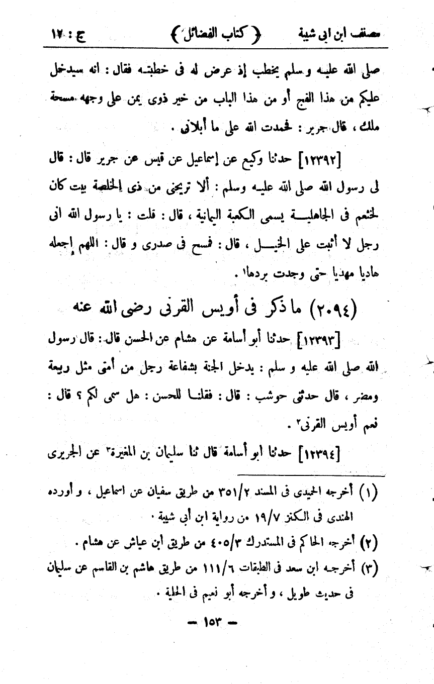 33010- حَدَّثَنَا أَبُو أُسَامَةَ ، قَالَ : حدَّثَنَا سُلَيْمَانُ بْنُ الْمُغِيرَةِ ، عَنِ الْجَرِيرِيِّ ، عَنْ أَبِي نَضِرَةَ ، عَنْ أُسَيْرِ بْنِ جَابِرٍ ، عَنْ عُمَرَ ، عَنِ النَّبِيِّ صلى الله عليه وسلم أَنَّهُ قَالَ : سَيَقْدَمُ عَلَيْكُمْ رَجُلٌ يُقَالُ لَهُ أُوَيْسٌ كَانَ بِهِ بَيَاضٌ , فَدَعَا اللَّهَ لَهُ فَأَذْهَبَهُ اللَّهُ , فَمَنْ لَقِيَهُ مِنْكُمْ فَمُرُوهُ فَلْيَسْتَغْفِرْ لَهُ ، قَالَ : فَلَقِيَهُ عُمَرُ ، فَقَالَ : اسْتَغْفِرْ لِي , فَاسْتَغْفَرَ لَهُ.