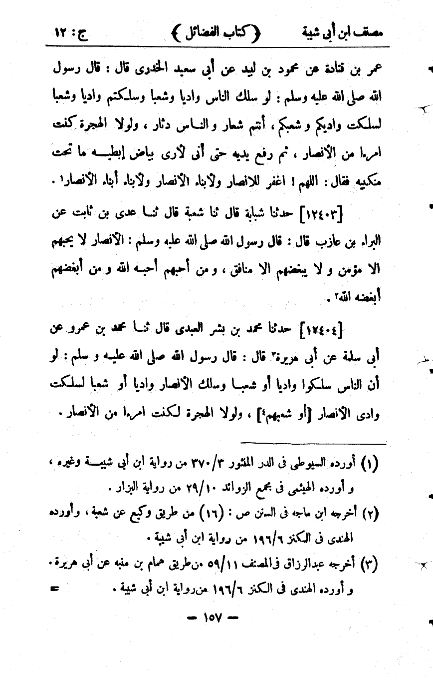 33020- حَدَّثَنَا مُحَمَّدُ بْنُ بِشْرٍ الْعَبْدِيُّ ، قَالَ : حدَّثَنَا مُحَمَّدُ بْنُ عَمْرٍو ، عَنْ أَبِي سَلَمَةَ ، عَنْ أبِي هُرَيْرَةَ ، قَالَ : قَالَ رَسُولُ اللهِ صلى الله عليه وسلم : لَوْ أَنَّ النَّاسَ سَلَكُوا وَادِيًا ، أَوْ شِعْبًا وَسَلَكَ الأَنْصَارُ وَادِيًا ، أَوْ شِعْبًا لَسَلَكْت وَادِيَ الأَنْصَارِ ، أَوْ شِعْبَهُمْ , وَلَوْلاَ الْهِجْرَةُ لَكُنْت امْرَءًا مِنَ الأَنْصَارِ.