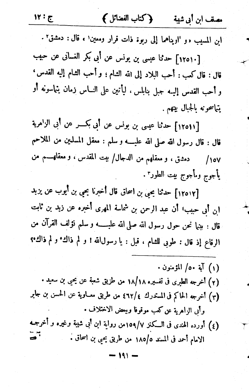 33132- حَدَّثَنَا عِيسَى بْنُ يُونُسَ ، عَنْ أَبِي بَكْرٍ ، عَنْ أَبِي الزَّاهِرِيَّةِ ، قَالَ : قَالَ رَسُولُ اللهِ صلى الله عليه وسلم : مَعْقِلُ الْمُسْلِمِينَ مِنَ الْمَلاَحِمِ دِمَشْقُ , وَمَعْقِلُهُمْ مِنَ الدَّجَّالِ بَيْتُ الْمَقْدِسِ , وَمَعْقِلُهُمْ مِنْ يَأْجُوجَ وَمَأْجُوجَ بَيْتُ الطُّورِ.