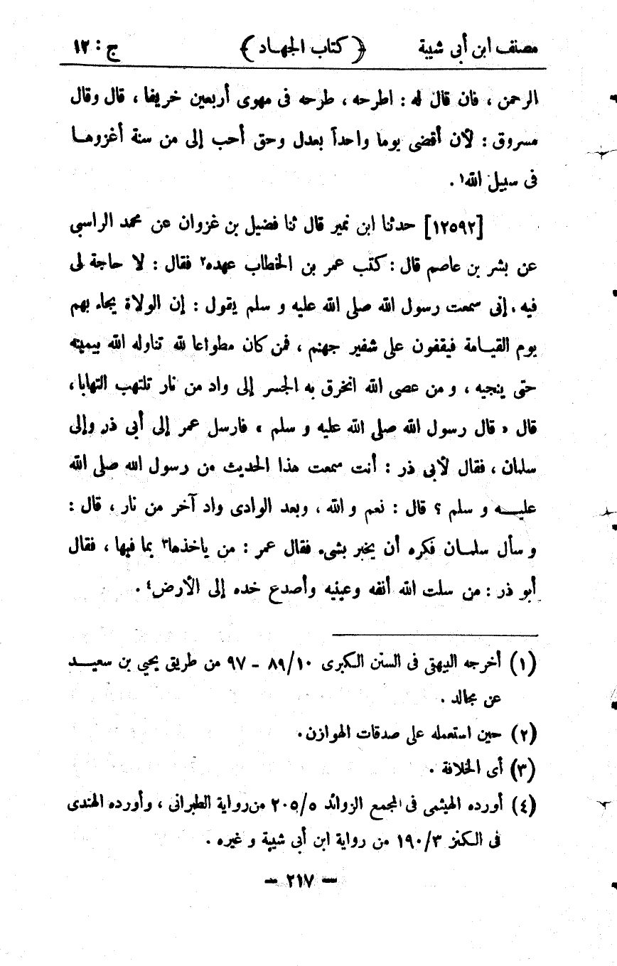 33213- حَدَّثَنَا ابْنُ نُمَيْرٍ ، قَالَ : حدَّثَنَا فُضَيْلُ بْنُ غَزْوَانَ ، عَنْ مُحَمَّدٍ الرَّاسِبِيِّ ، عَنْ بِشْرِ بْنِ عَاصِمٍ ، قَالَ : كَتَبَ عُمَرُ بْنُ الْخَطَّابِ عَهْدَهُ ، فَقَالَ : لاَ حَاجَةَ لِي فِيهِ , إنِّي سَمِعْت رَسُولَ اللهِ صلى الله عليه وسلم يَقُولُ : إنَّ الْوُلاَةَ يُجَاءُ بِهِمْ يَوْمَ الْقِيَامَةِ فَيَقِفُونَ عَلَى شَفِيرِ جَهَنَّمَ , فَمَنْ كَانَ مِطْوَاعًا لِلَّهِ تَنَاوَلَهُ اللَّهُ بِيَمِينِهِ حَتَّى يُنَجِّيَهُ , وَمَنْ عَصَى اللَّهَ انْخَرَقَ بِهِ الْجِسْرُ إلَى وَادٍ مِنْ نَارٍ يَلْتَهِبُ الْتِهَابًا قَالَ : فَأَرْسَلَ عُمَرُ إلَى أَبِي ذَرٍّ وَإِلَى سَلْمَانَ ، فَقَالَ لأَبِي ذَرٍّ : أَنْتَ سَمِعْت هَذَا الْحَدِيثَ مِنْ رَسُولِ اللهِ صلى الله عليه وسلم ؟ قَالَ : نَعَمْ وَاللهِ , وَبَعْدَ الْوَادِي وَادٍ آخَرُ مِنْ نَارٍ ، قَالَ : وَسَأَلَ سَلْمَانَ فَكَرِهَ أَنْ يُخْبِرَ بِشَيْءٍ ، فَقَالَ عُمَرُ : مَنْ يَأْخُذُهَا بِمَا فِيهَا ، فَقَالَ أَبُو ذَرٍّ : مَنْ سَلَتَ اللَّهُ أَنْفَهُ وَعَيْنَيْهِ , وَأَضْرَعَ خَدَّهُ إلَى الأَرْضِ.