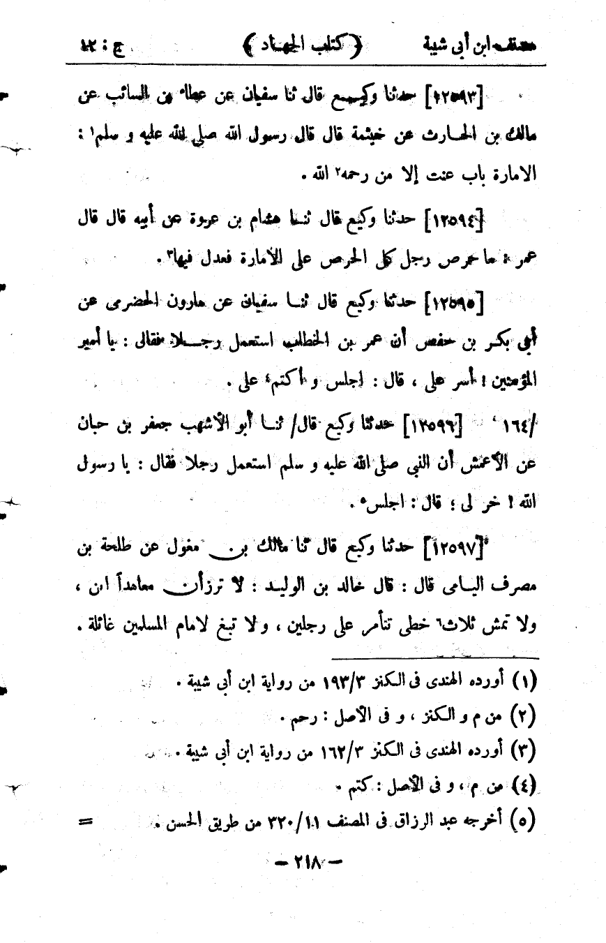 33214- حَدَّثَنَا وَكِيعٌ ، قَالَ : حدَّثَنَا سُفْيَانُ ، عَنْ عَطَاءِ بْنِ السَّائِبِ ، عَنْ مَالِكِ بْنِ الْحَارِثِ ، عَنْ خَيْثَمَة ، قَالَ : قَالَ رَسُولُ اللهِ صلى الله عليه وسلم : الإِمَارَةُ بَابُ ، عَْتٍ إِلاَّ مَنْ رَحِمَ اللَّهُ.