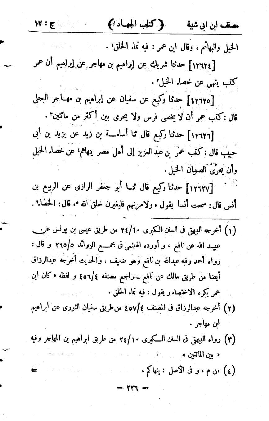 33246- حَدَّثَنَا وَكِيعٌ ، عَنْ سُفْيَانَ ، عَنْ إبْرَاهِيمَ بْنِ مُهَاجِرٍ الْبَجَلِيِّ ، قَالَ : كَتَبَ عُمَرُ أَنْ لاَ يُخْصَى فَرَسٌ ، وَلاَ يَجْرِي من أَكْثَرَ مِنْ مِئَتَيْنِ.