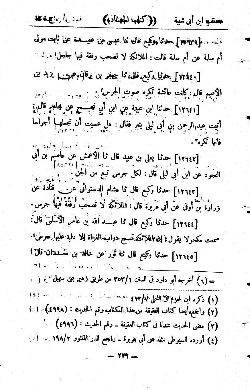 33264- حَدَّثَنَا وَكِيعٌ ، قَالَ : حدَّثَنَا هِشَامٌ الدَّسْتَوَائِيُّ ، عَنْ قَتَادَةَ ، عَنْ زُرَارَةَ بْنِ أَوْفَى ، عَنْ أَبِي هُرَيْرَةَ ، قَالَ : الْمَلاَئِكَةُ لاَ تَصْحَبُ رُفْقَةً فِيهَا جَرَسٌ.